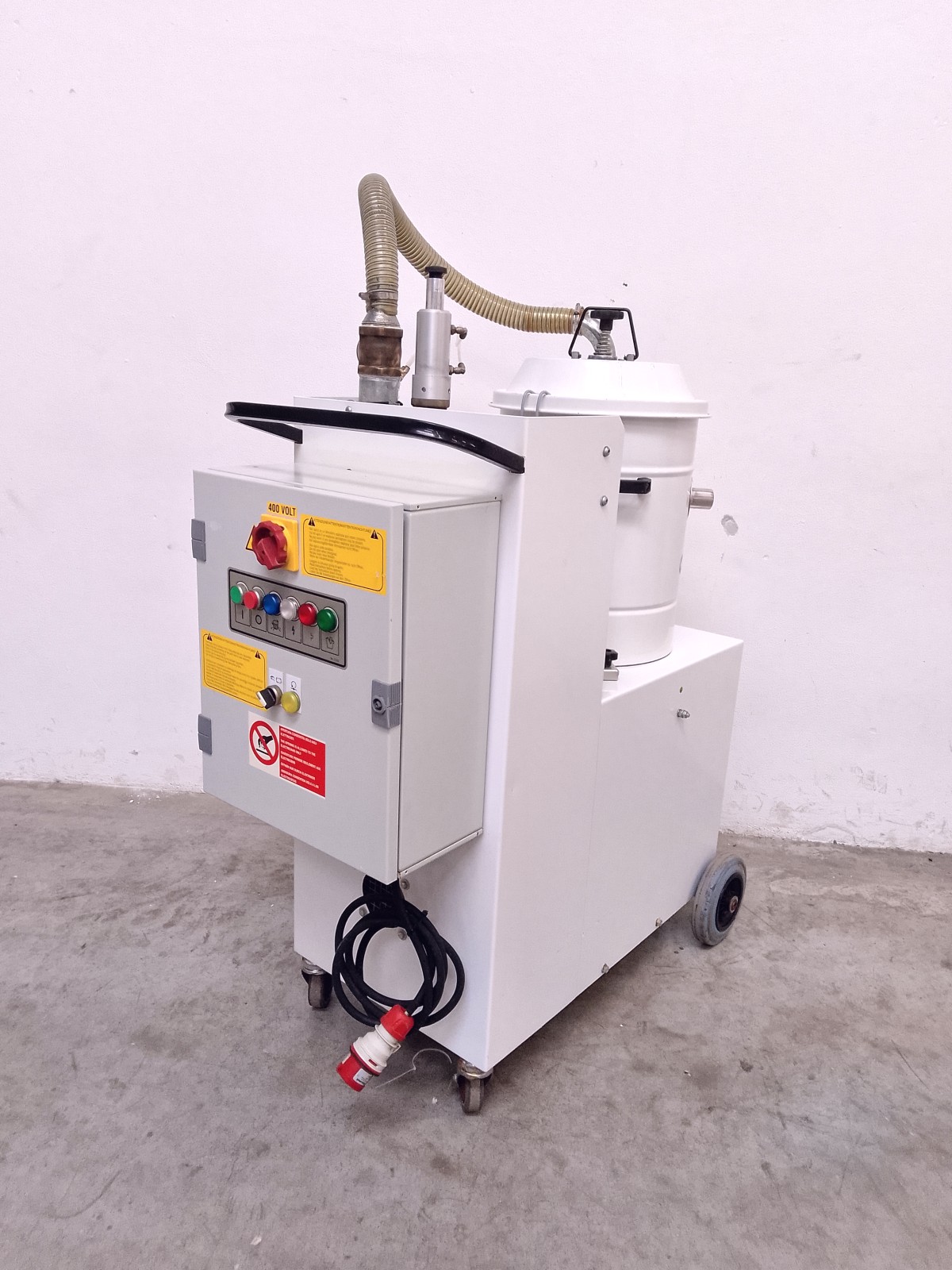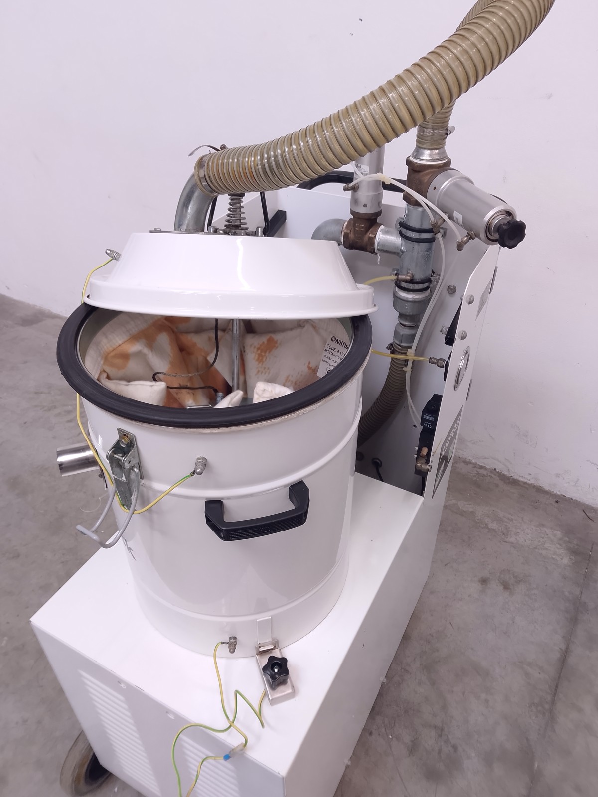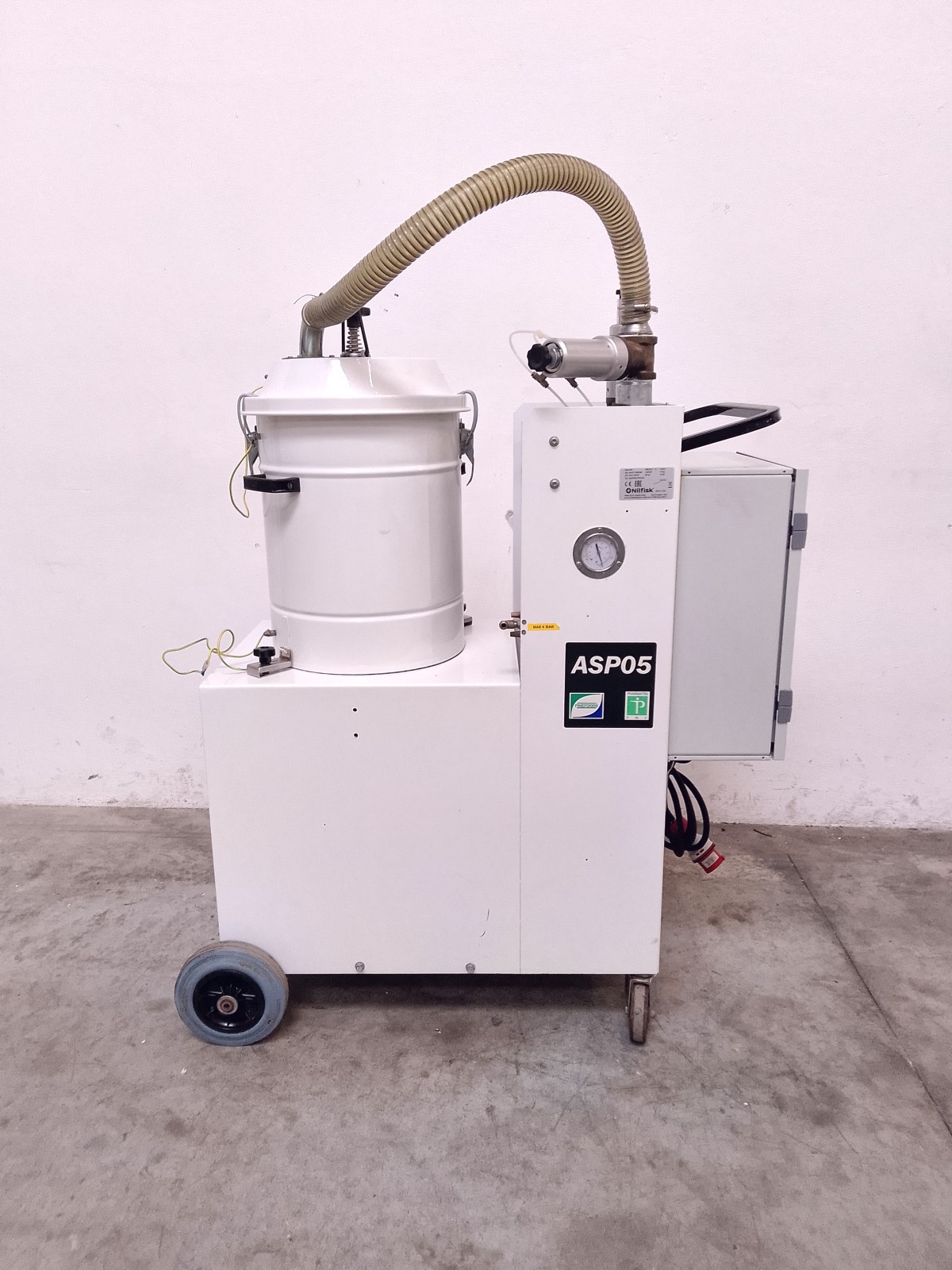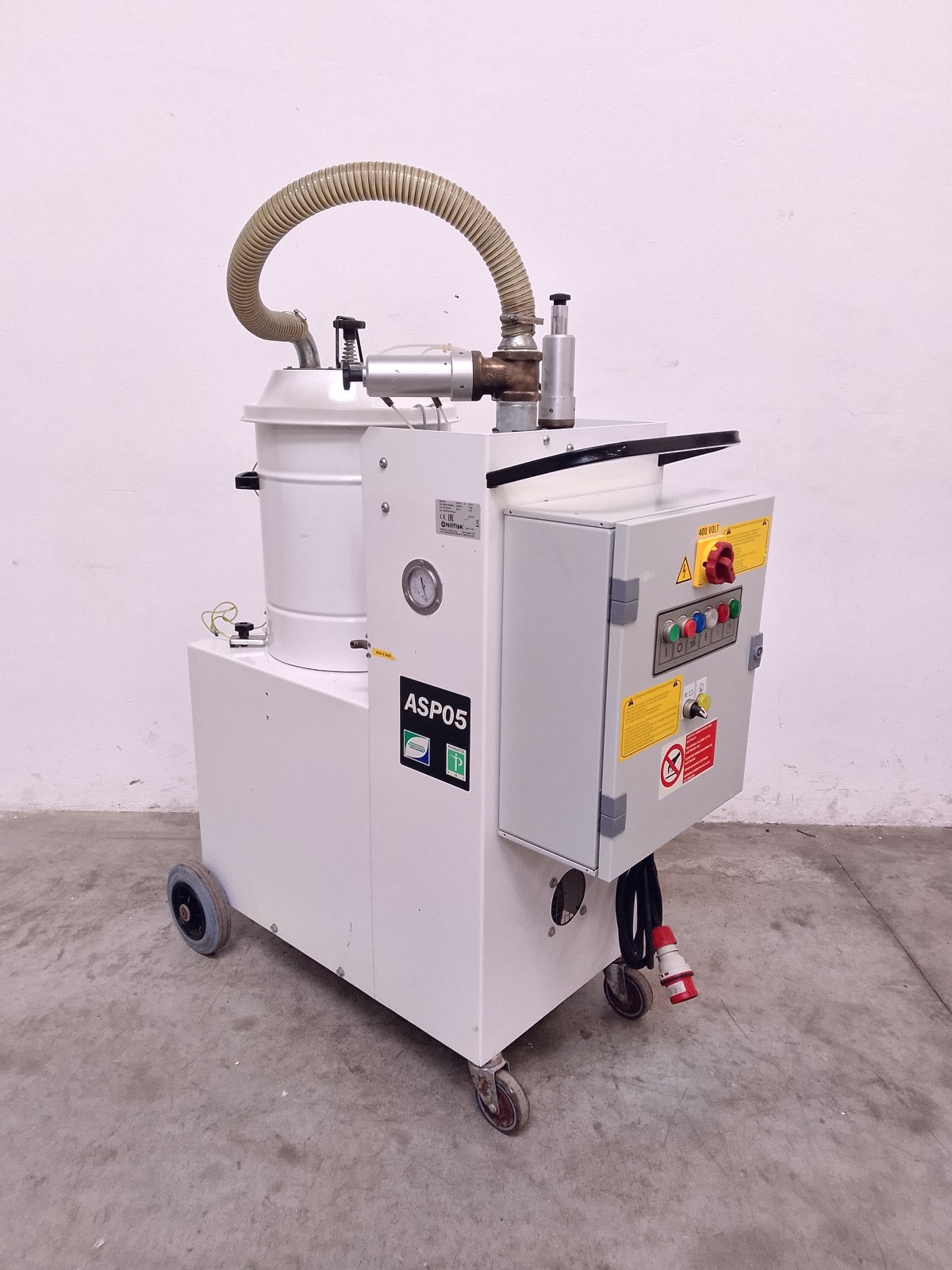 Aspiratore industriale Nilfisk mod. A43 per la raccolta di polveri in ambienti produttivi. Unità carrellata con contenitore di raccolta removibile, sistema filtrante integrato e quadro elettrico laterale con comando generale, pulsantiera di controllo e selettore di emergenza. Struttura compatta su ruote per facile movimentazione, idonea per utilizzo in ambito industriale e impiantistico. Versione con configurazione trifase e grado di protezione elevato per ambienti di lavoro gravosi.