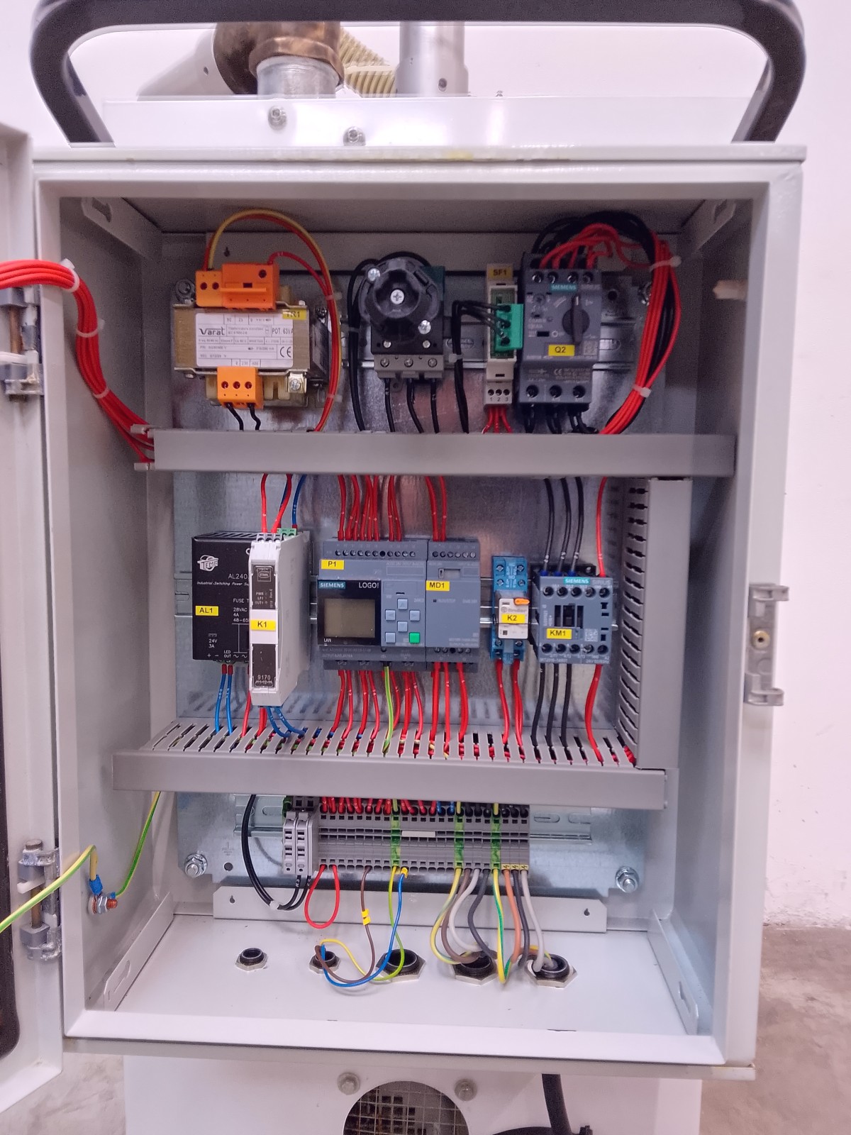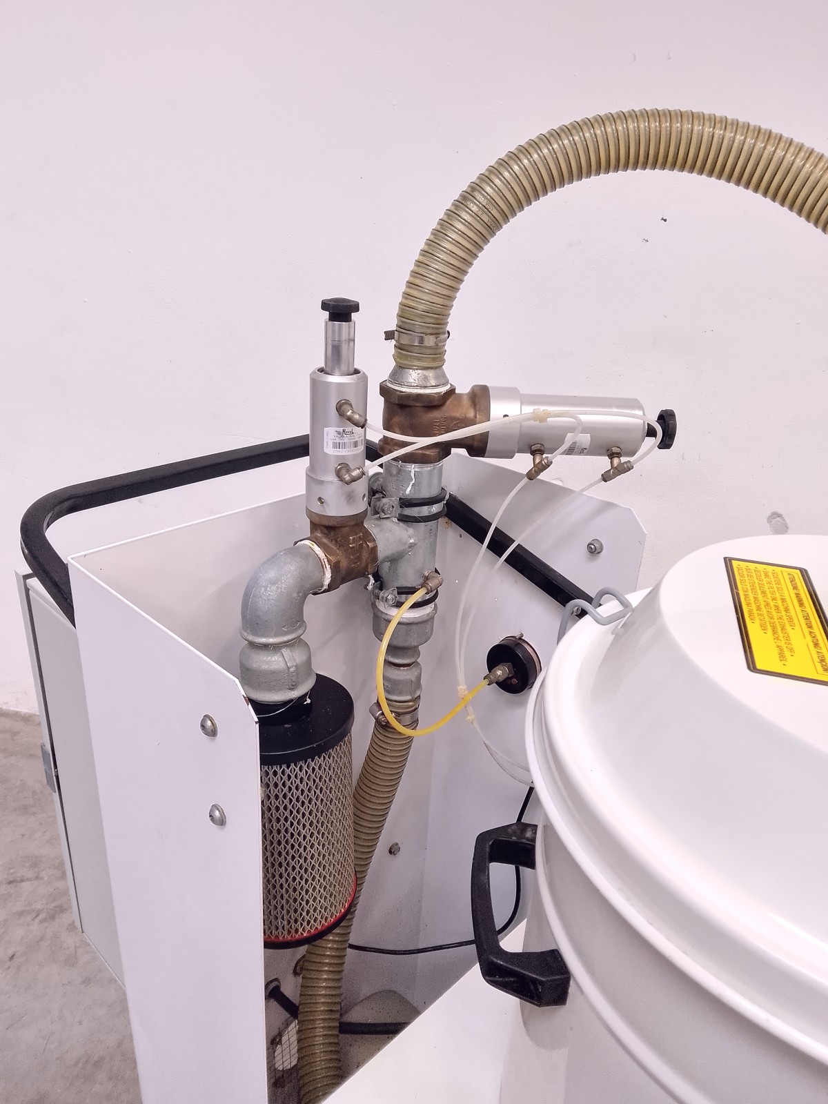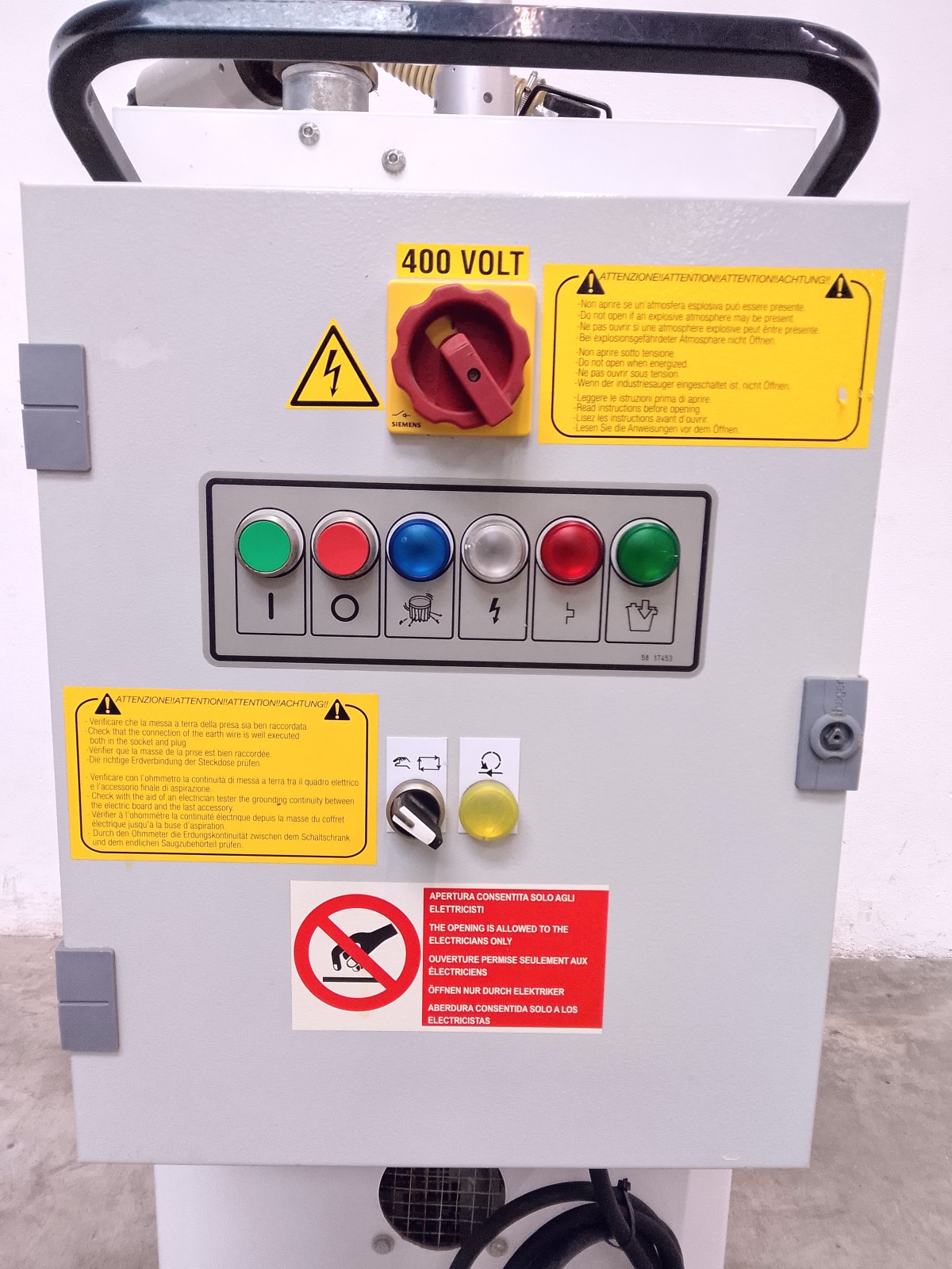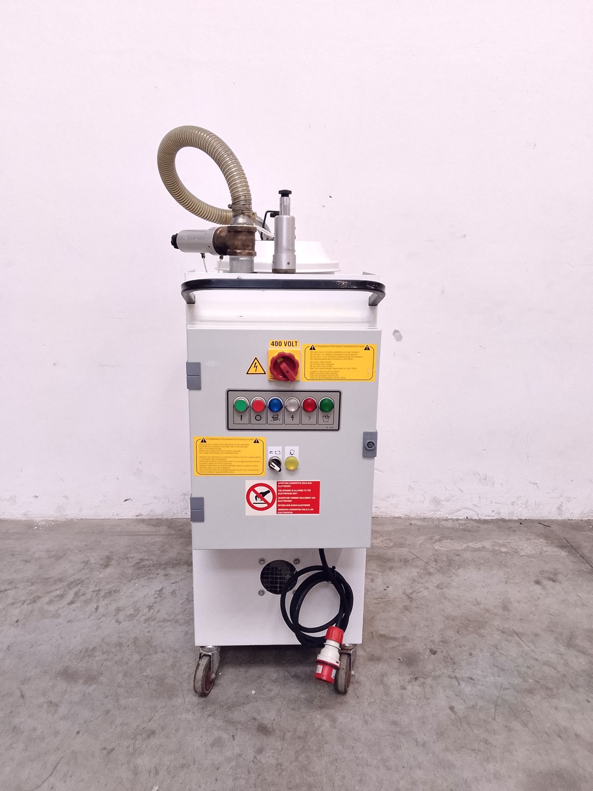 Aspiratore industriale Nilfisk mod. A43 per la raccolta di polveri in ambienti produttivi. Unità carrellata con contenitore di raccolta removibile, sistema filtrante integrato e quadro elettrico laterale con comando generale, pulsantiera di controllo e selettore di emergenza. Struttura compatta su ruote per facile movimentazione, idonea per utilizzo in ambito industriale e impiantistico. Versione con configurazione trifase e grado di protezione elevato per ambienti di lavoro gravosi.