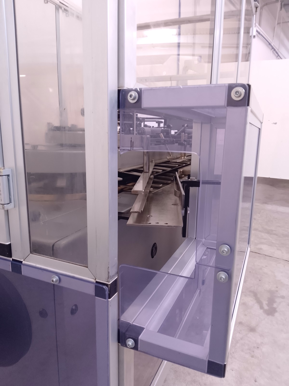 Il macchinario è dotato di dispositivi per il controllo della presenza del prodotto, dell’astuccio e del prodotto nella confezione. Include sicurezza elettrica sullo spingitore del prodotto, protezioni in plexiglass con dispositivi di sicurezza, e pulsanti di emergenza in posizioni di massima accessibilità. Il quadro comandi visualizza gli arresti. Il tipo di incastro utilizzabile può essere ad incastro a lembi pari o a lembi alternati.