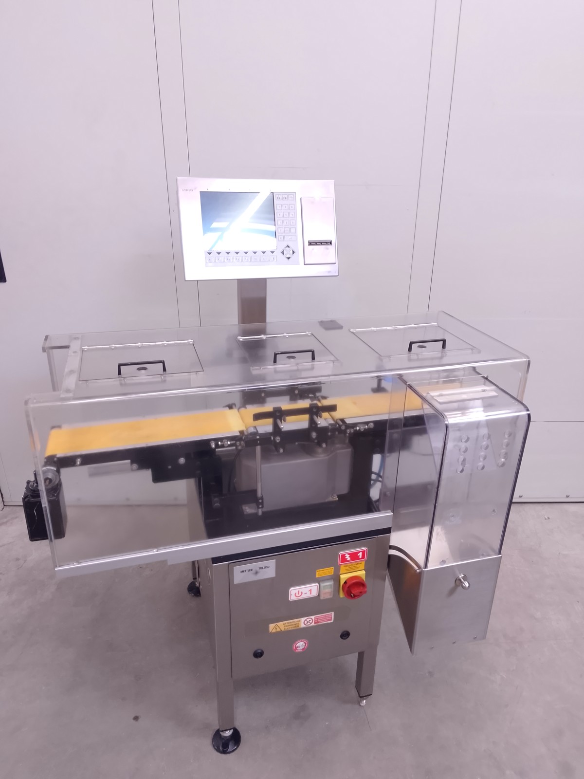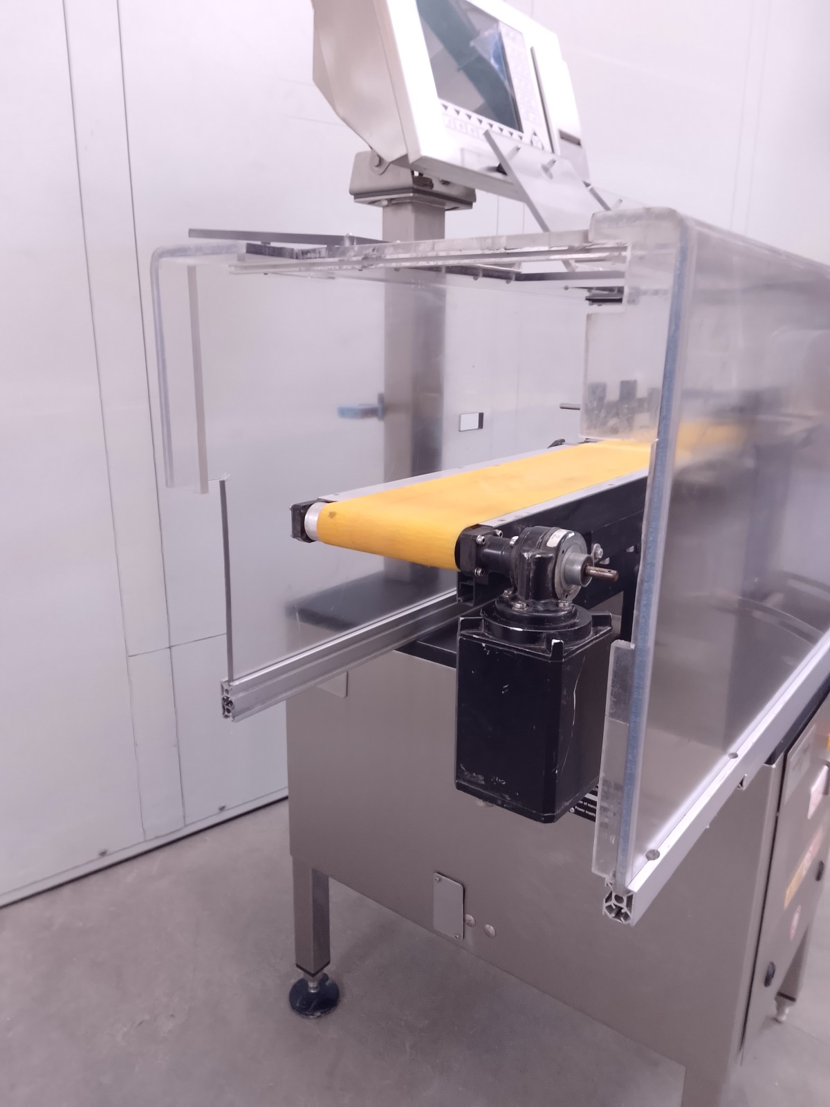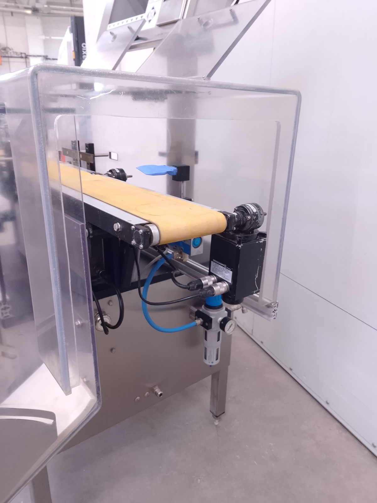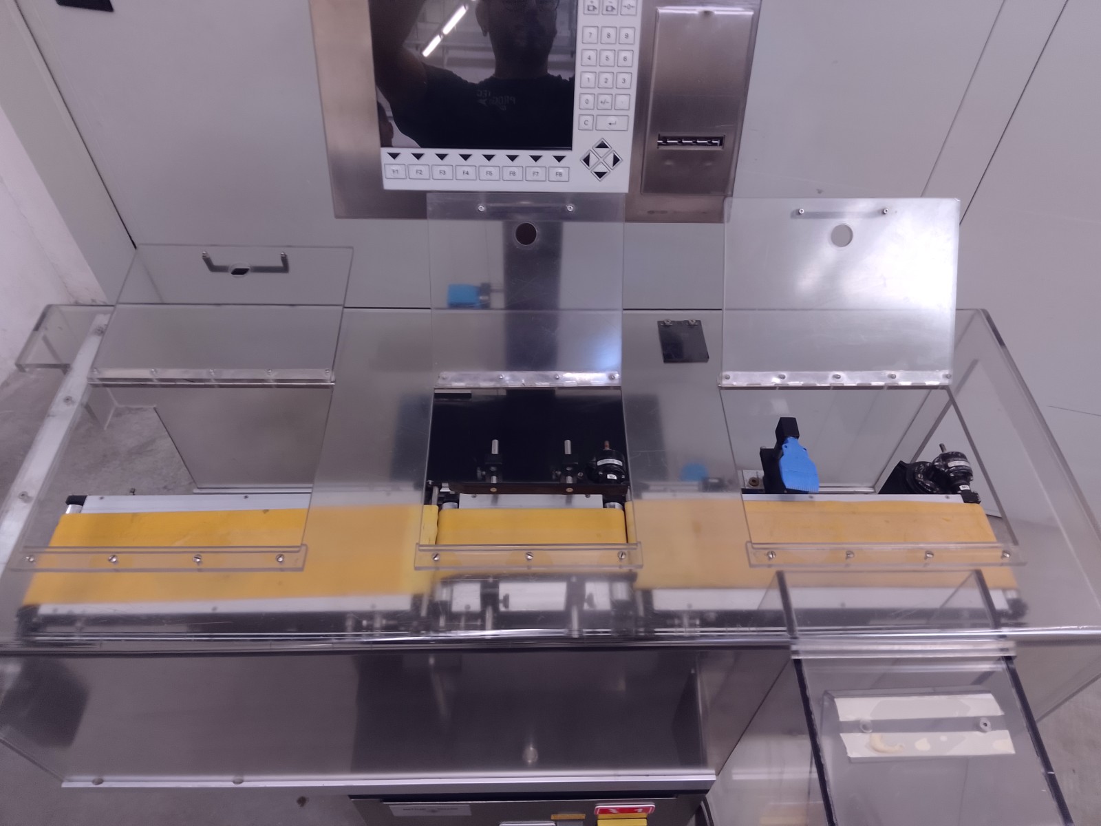 L’apparecchiatura ha una capacità massima di pesatura pari a 200 g. È una macchina industriale a pavimento con gambe di supporto regolabili e presenta un corpo principale in acciaio inox, con un’area di trasporto e controllo protetta da coperture trasparenti e dotata di un’interfaccia di comando digitale (touch screen o display). Il pannello di controllo frontale è provvisto di un interruttore principale rosso, comandi per l’attivazione dei nastri, e avvisi di sicurezza, inclusa un’attenzione ai rischi elettrici.