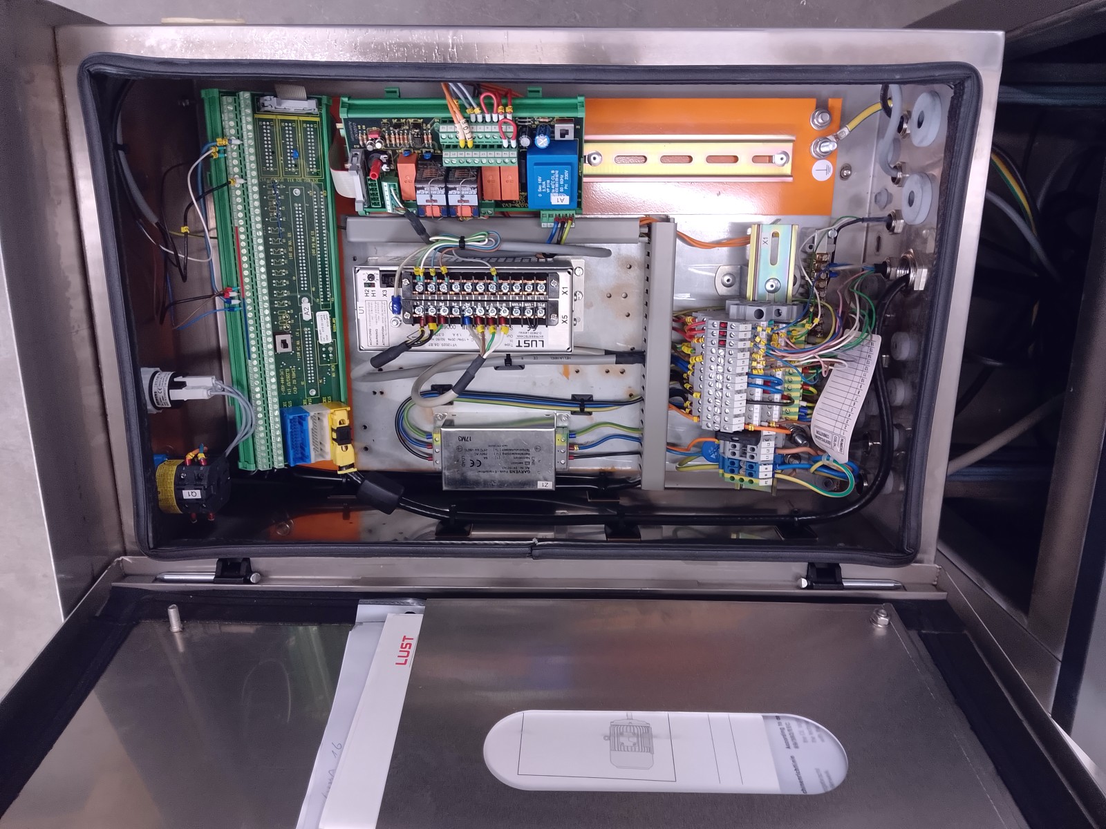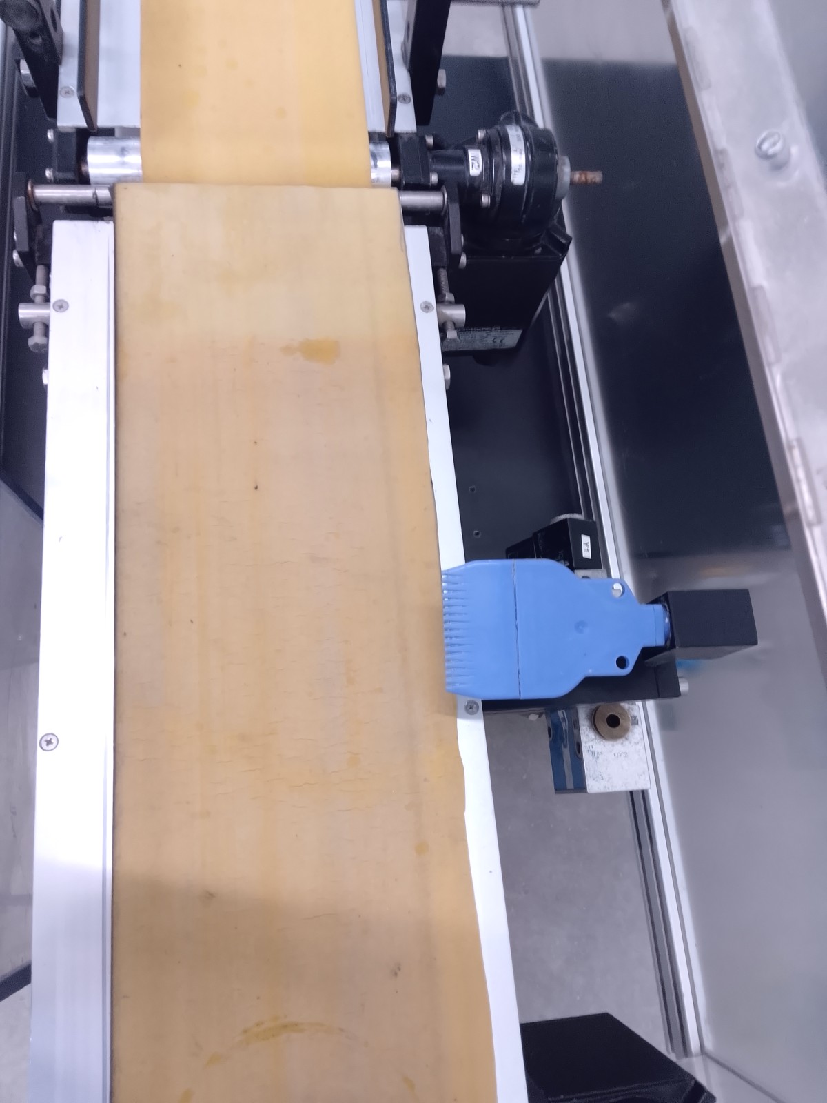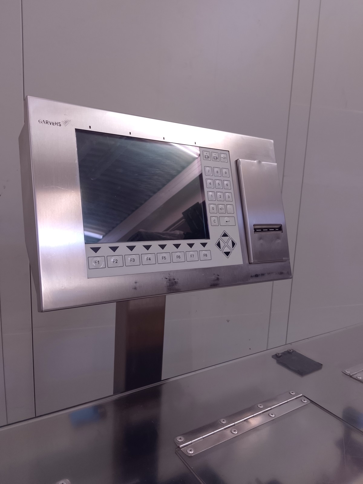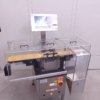 L’apparecchiatura ha una capacità massima di pesatura pari a 200 g. È una macchina industriale a pavimento con gambe di supporto regolabili e presenta un corpo principale in acciaio inox, con un’area di trasporto e controllo protetta da coperture trasparenti e dotata di un’interfaccia di comando digitale (touch screen o display). Il pannello di controllo frontale è provvisto di un interruttore principale rosso, comandi per l’attivazione dei nastri, e avvisi di sicurezza, inclusa un’attenzione ai rischi elettrici.