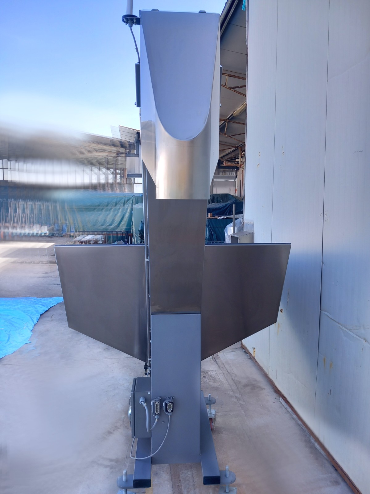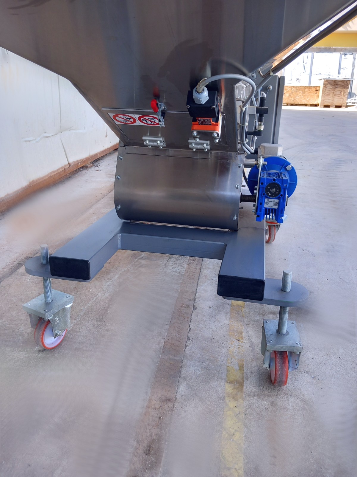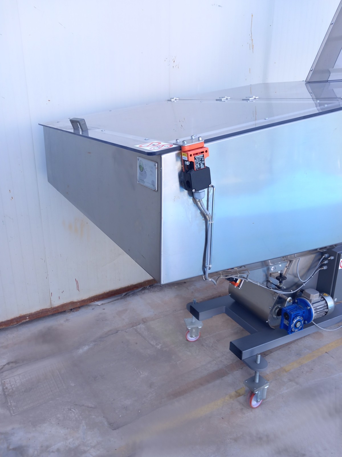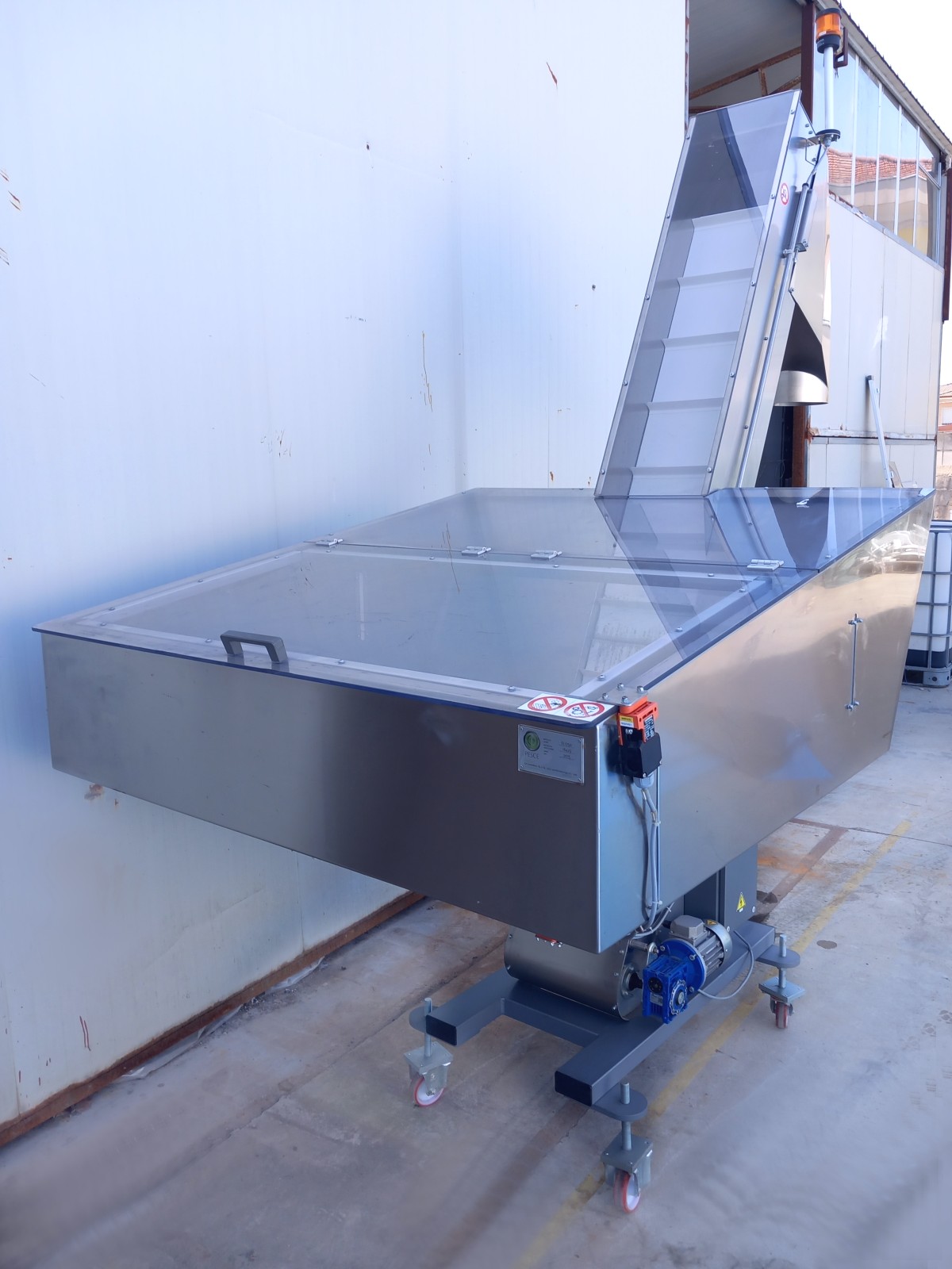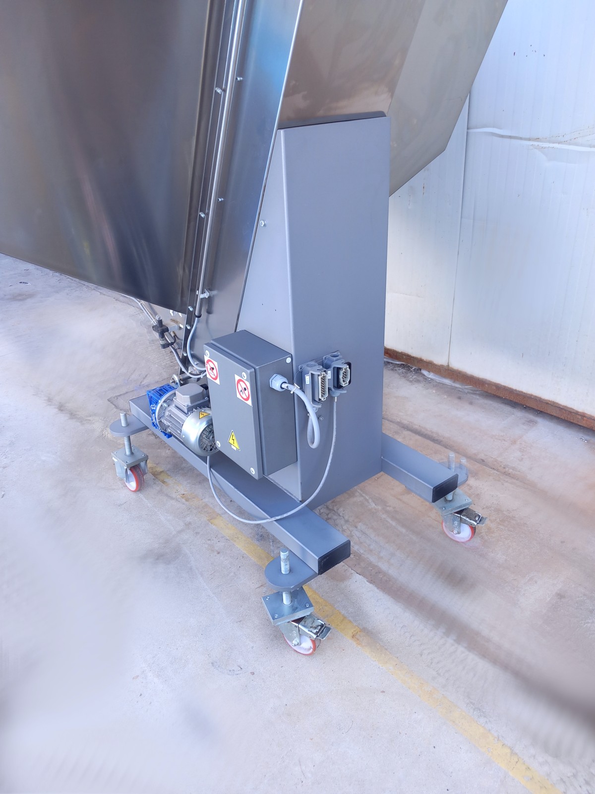L’elevatore a tramoggia è realizzato in acciaio inox, consentendo il trasporto sicuro e igienico del materiale dalla tramoggia fino alla bocca di uscita. La tramoggia fissa, facilmente caricabile manualmente grazie alla sua altezza, permette il sollevamento e il raggruppamento del carico. È dotato di una copertura antipolvere basculante in policarbonato trasparente per garantire la protezione del materiale e dell’operatore. Il nastro trasportatore in poliuretano presenta una serie di palette per elevare il componente fino al punto di smistamento, mentre la struttura trasparente antipolvere assicura la sicurezza operativa. Il sistema elettrico è centralizzato in un quadretto in basso, con comandi intuitivi per la gestione del motore. La versatilità dell’elevatore lo rende adatto a diverse linee di produzione.