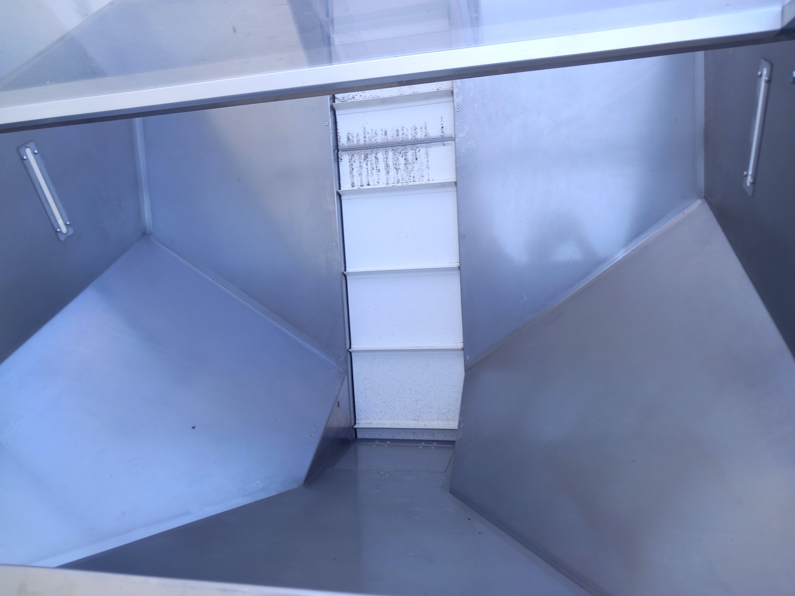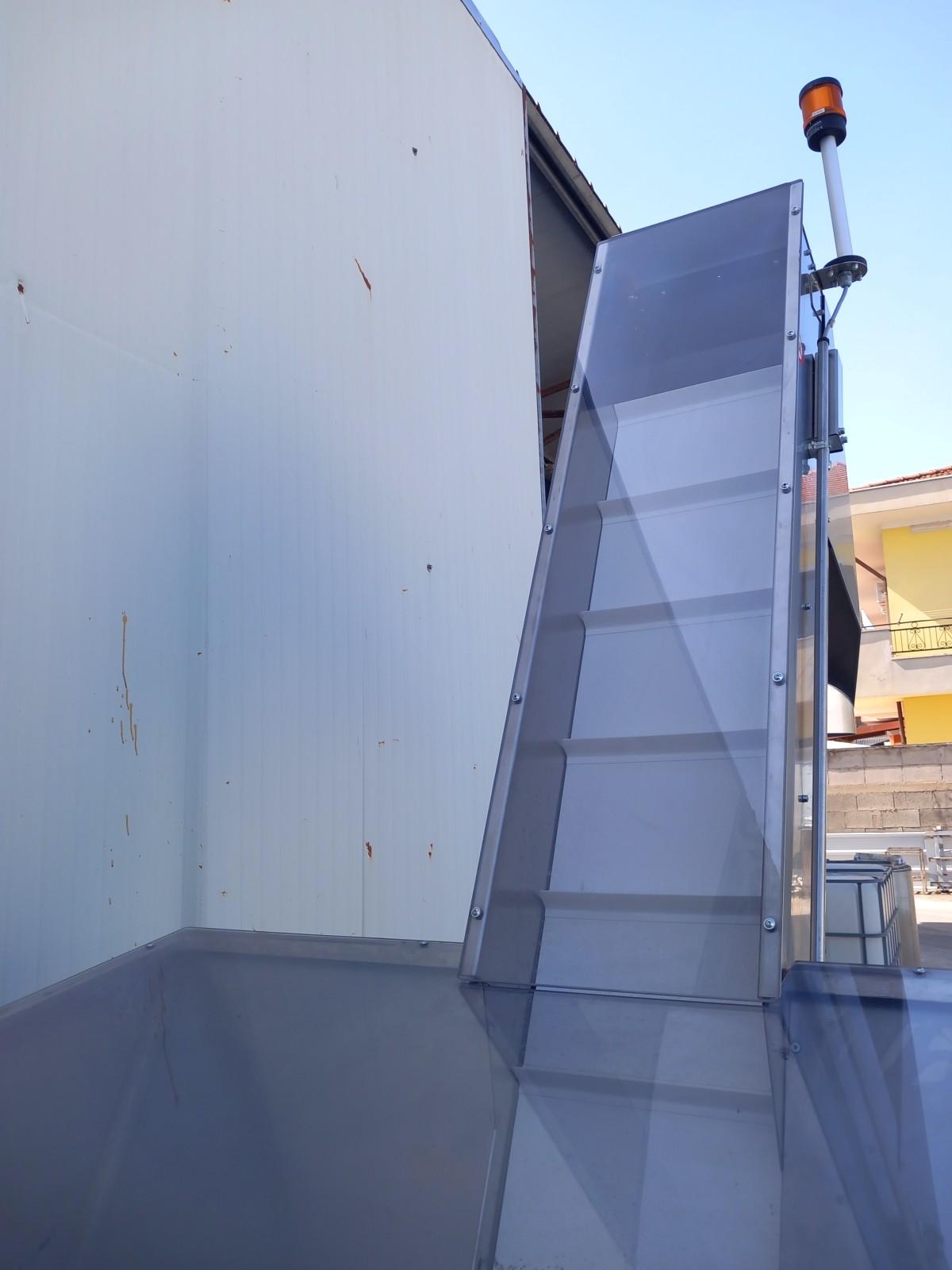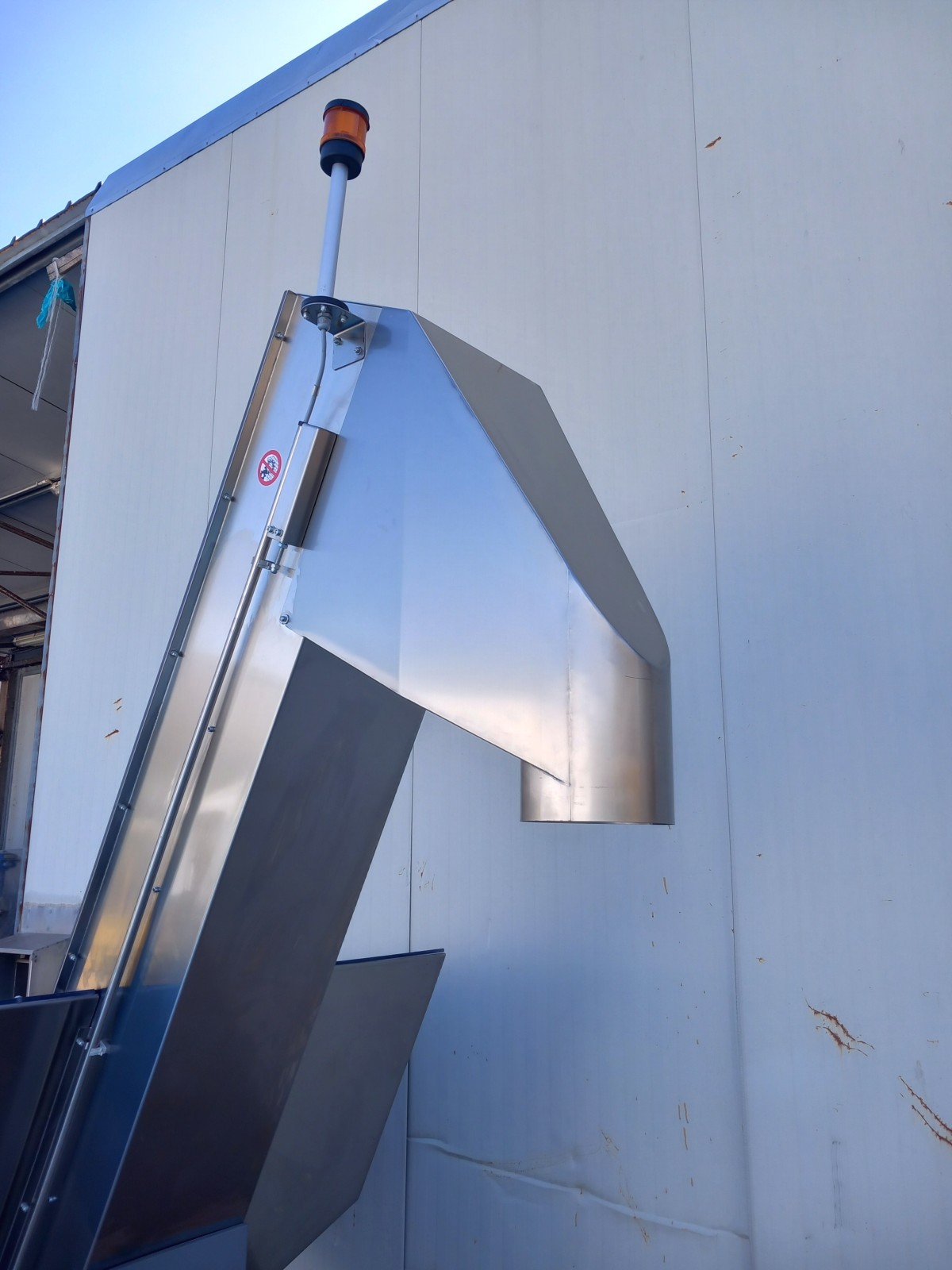 Elevatore a tramoggia in acciaio inox per il trasporto di materiali granulari e polverosi.