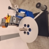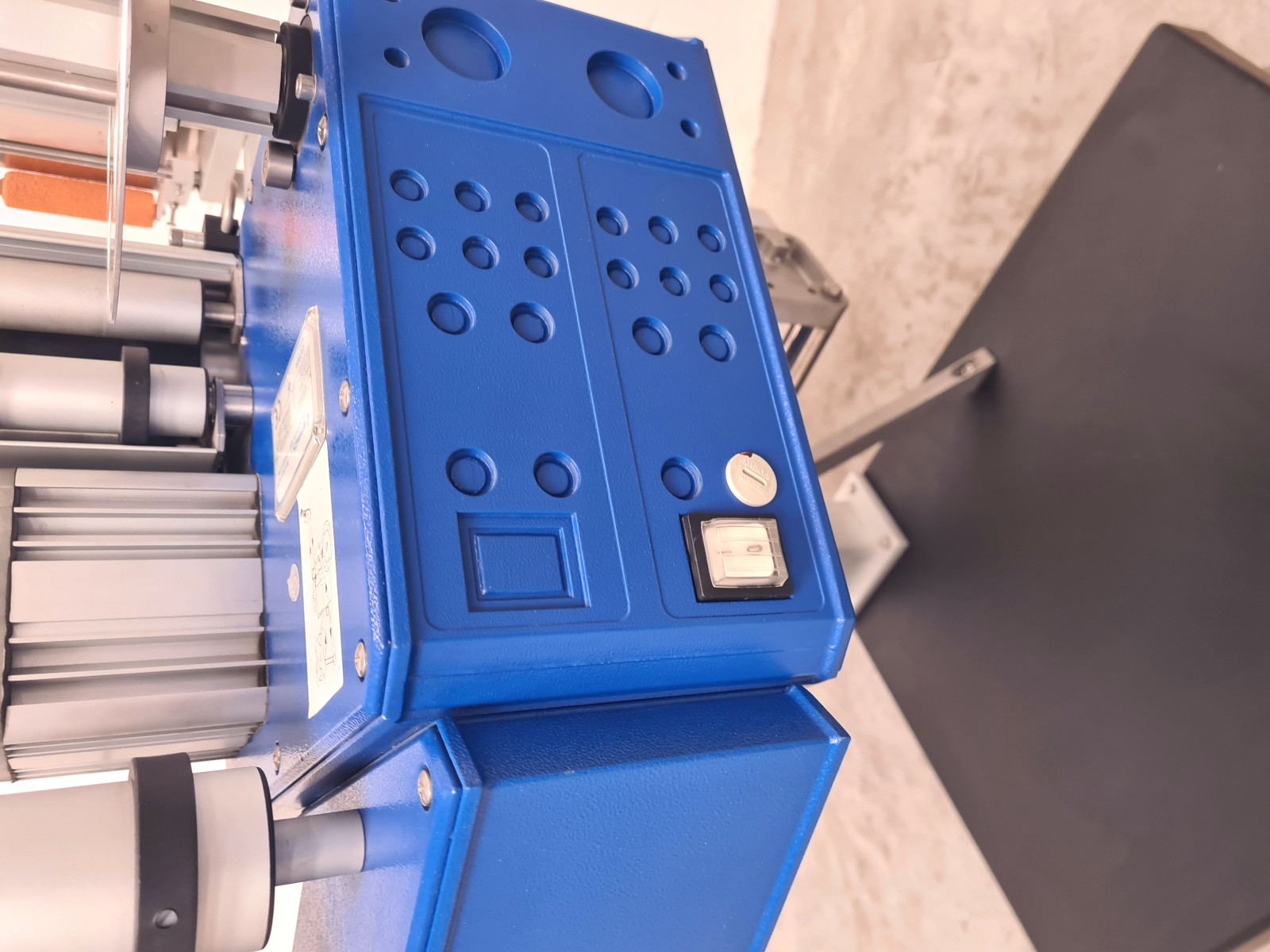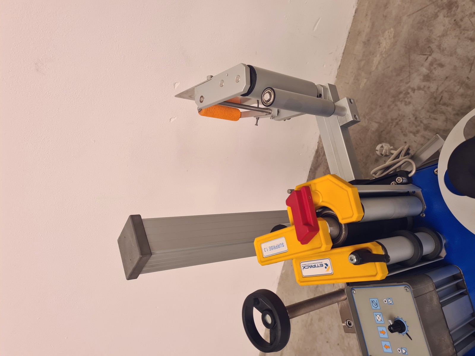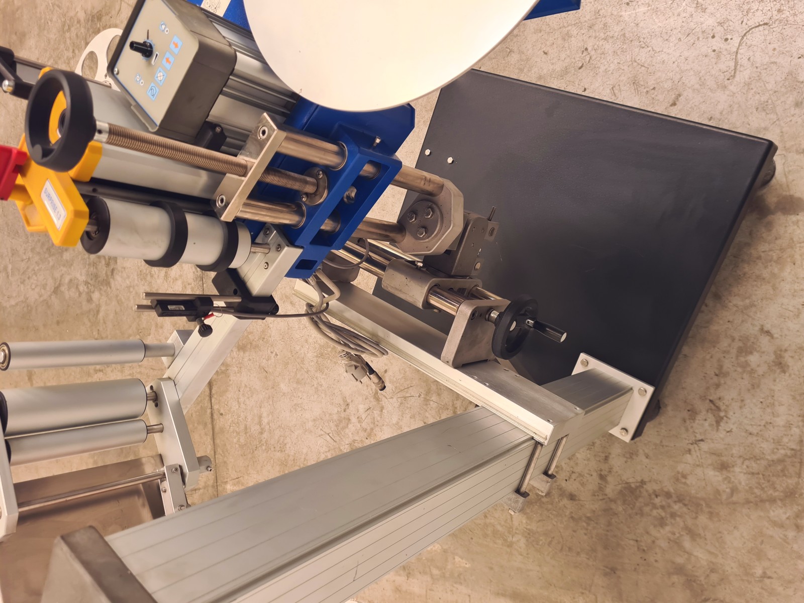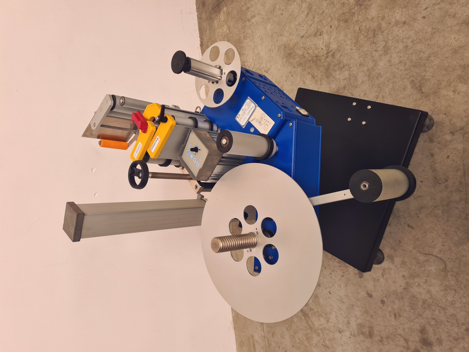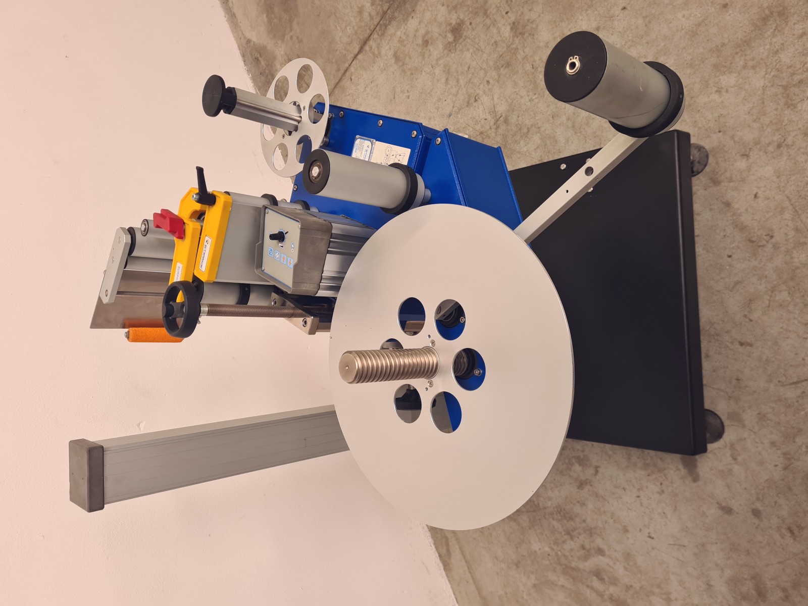 Struttura compatta montata su una base stabile a terra. L’etichettatrice è specificamente progettata per applicare etichette e gestisce bobine con un diametro massimo di 400 mm e un’altezza massima di 160 mm. La bobina di scarto può raggiungere un diametro massimo di 190 mm.