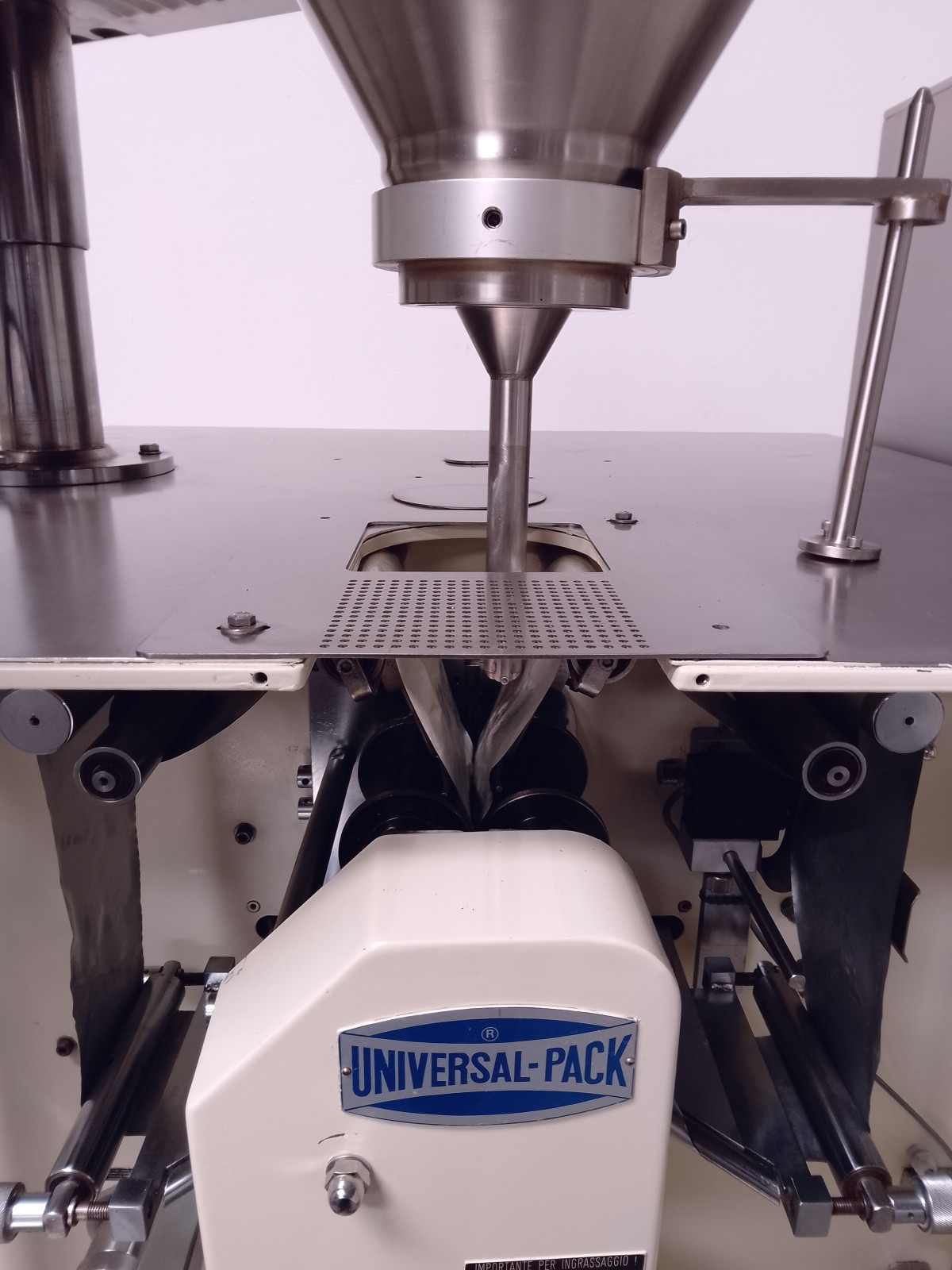Il sistema di confezionamento di polveri in buste termosaldate in materiale laminato è altamente performante. La macchina è composta da un sistema di confezionamento termosaldante, un gruppo alimentatore e un gruppo dosatore per polveri o granulati, accompagnati da un quadro comandi integrato e un nastro trasportatore per le buste in uscita. La riempimento avviene tramite una tramoggia dotata di coclea, garantendo un dosaggio preciso. Il modello VBU è progettato per effettuare in modo completamente automatico le operazioni di formatura, riempimento, termosaldatura e taglio delle buste. La struttura della macchina è stata studiata per ridurre al minimo la propagazione delle vibrazioni, assicurando un funzionamento fluido. La presenza dell’operatore è necessaria solo per le operazioni di caricamento del prodotto e della bobina di laminato termosaldabile. Questa macchina ha subito una revisione nel 2014, garantendo affidabilità e performance. La macchina consente una velocità di produzione che varia da 15 a 250 cicli al minuto, a seconda della qualità del prodotto e delle condizioni ambientali. La lunghezza delle buste prodotte varia tra 50 e 150 mm.