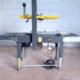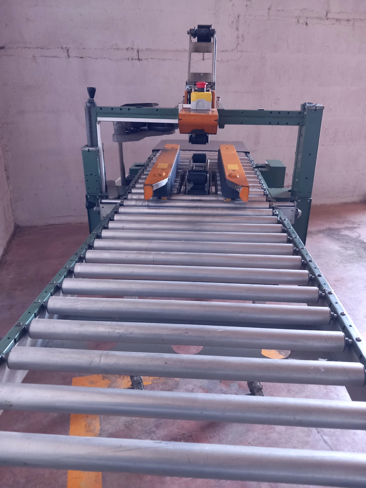 Macchina semiautomatica per la chiusura con nastro adesivo di scatole in cartone.