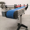 Il nastro trasportatore garantisce il trasferimento con costante continuità nel tempo del materiale o dei materiali caricati nella sua parte superiore. Il nastro riceve e contiene il materiale trasportato e nello stesso tempo trasmette la forza necessaria per il movimento del carico. Alle estremità questo tappeto si avvolge su tamburi andando così a creare un anello chiuso senza fine che permette di trasportare il materiale in continuo senza soste. Questo nastro trasportatore in acciaio inox curvato è dotato di tappeto in materiale plastico, con sponde laterali atte al contenimento del materiale trasportato. Il nastro è completo di supporti in acciaio con piedini che garantiscono stabilità al mezzo ed alla merce trasportata. Dotato di motore elettrico per la movimentazione, di marca Sew Usocome.
