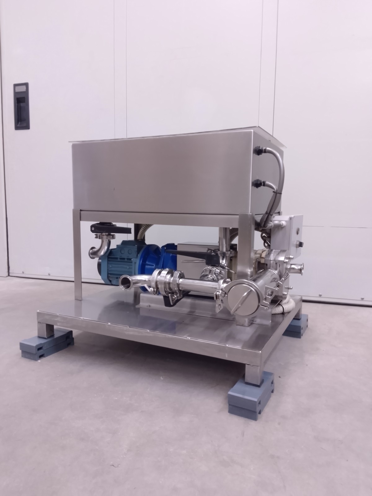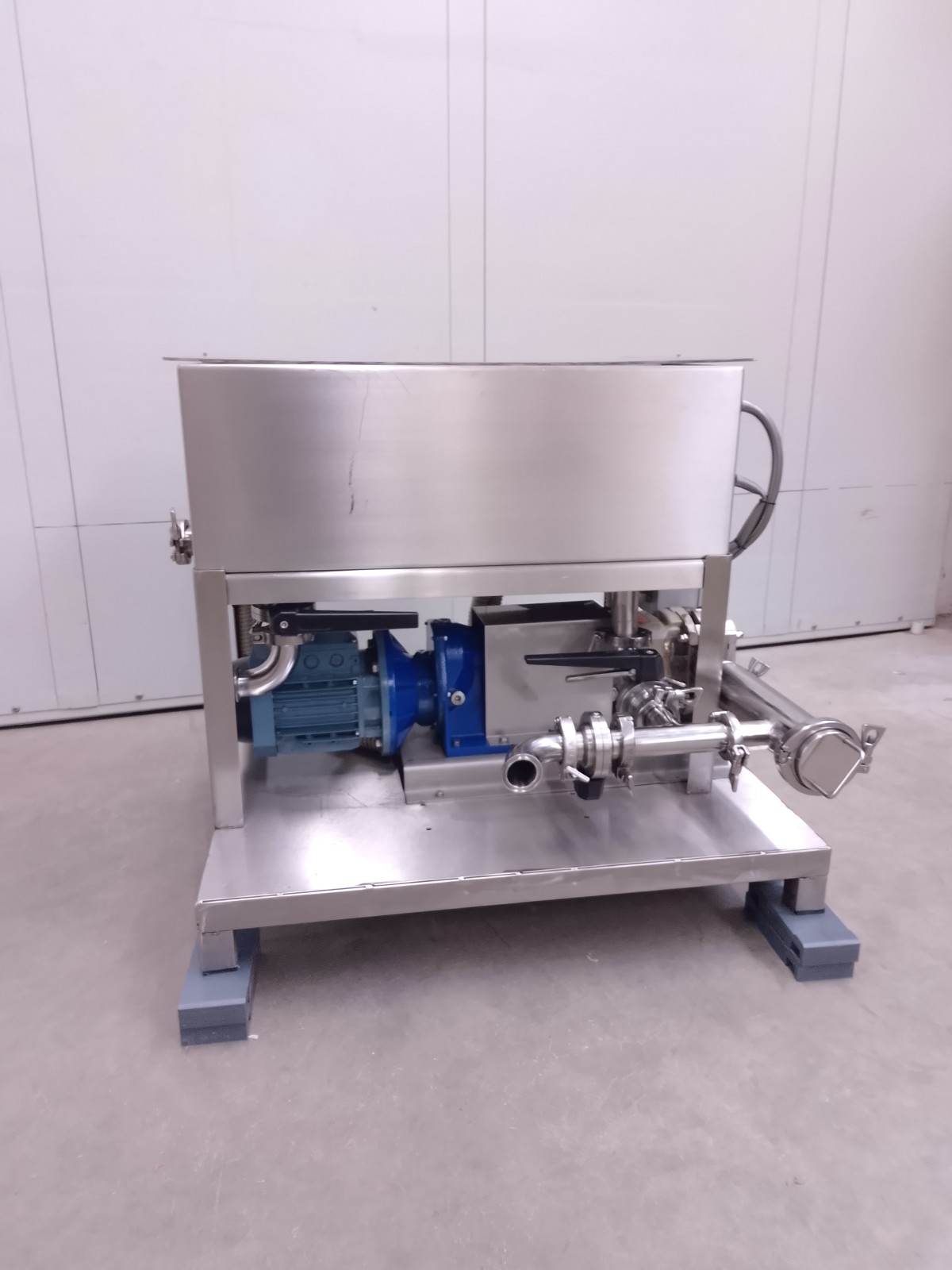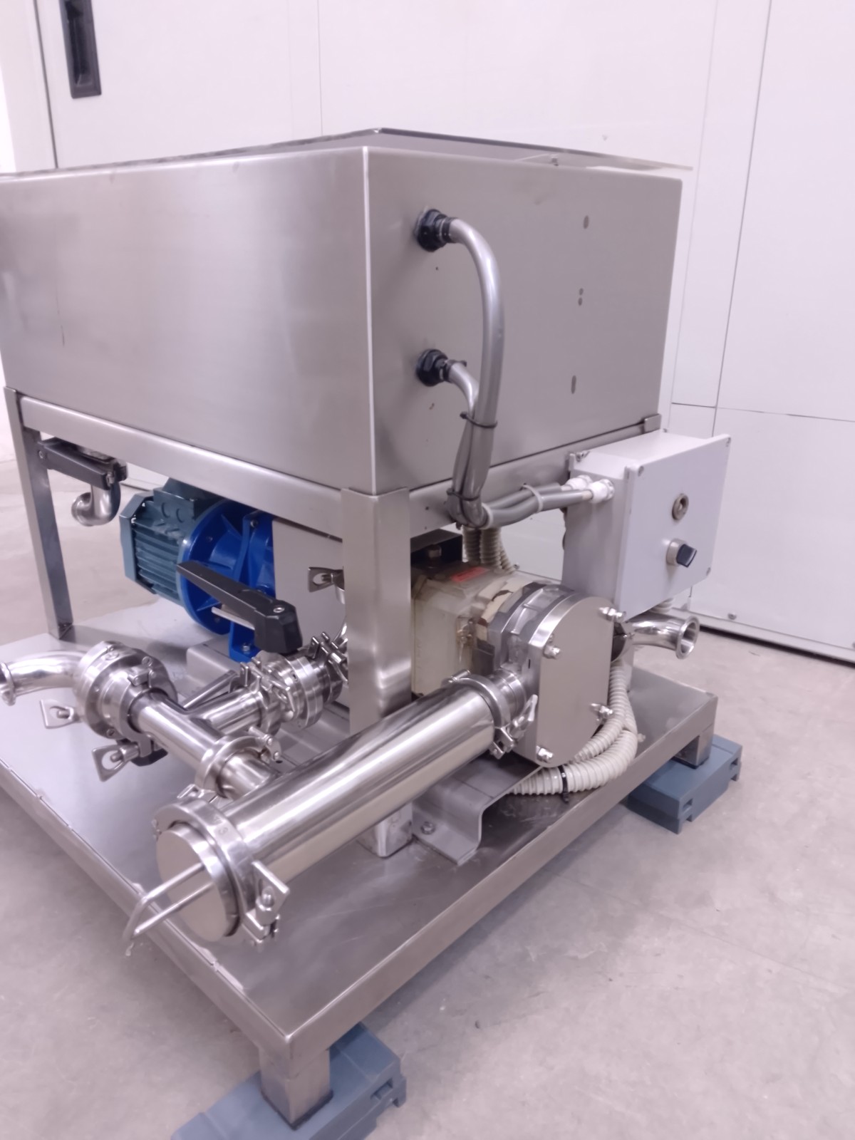 La pompa a lobi OMAC Mod. B110 5600 GU è una soluzione robusta e affidabile per il trasferimento di fluidi ad alta viscosità, progettata per applicazioni industriali e alimentari. Il gruppo è assemblato su telaio in acciaio inox con vasca di pescaggio integrata, che facilita l’alimentazione continua del prodotto e garantisce un flusso uniforme verso la pompa. L’unità è equipaggiata con motore ABB e organi idraulici in acciaio inox, idonei al trattamento di creme, paste e prodotti semidensi. La configurazione compatta e igienica la rende adatta a linee di produzione che richiedono facilità di lavaggio, affidabilità e controllo stabile del processo di trasferimento.