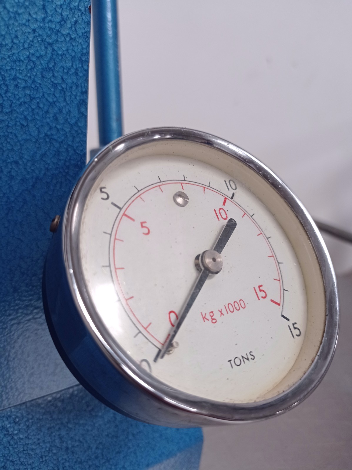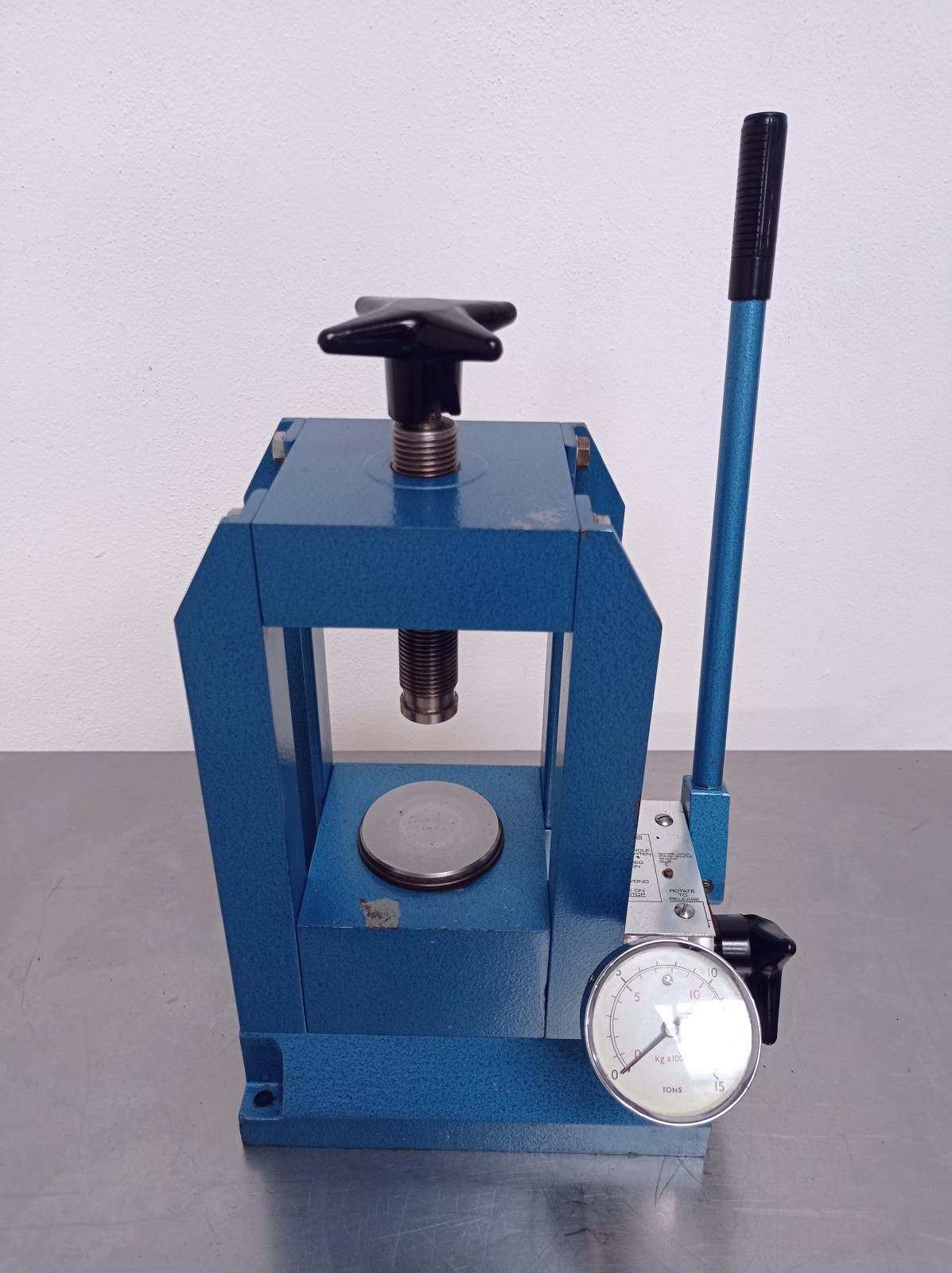 La Specac 15000 è caratterizzata da una struttura robusta e compatta, con una base pesante per la stabilità durante l’operazione. Utilizza un sistema a pistone azionato da leva manuale e permette la regolazione dello spazio di lavoro tramite una vite superiore con maniglie ergonomiche a croce. Un manometro analogico integrato consente il monitoraggio preciso della pressione applicata, garantendo la riproducibilità dei dischi di pellet prodotti.