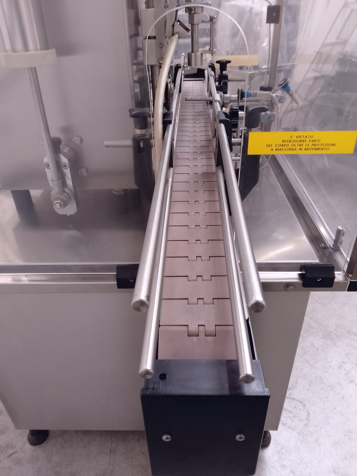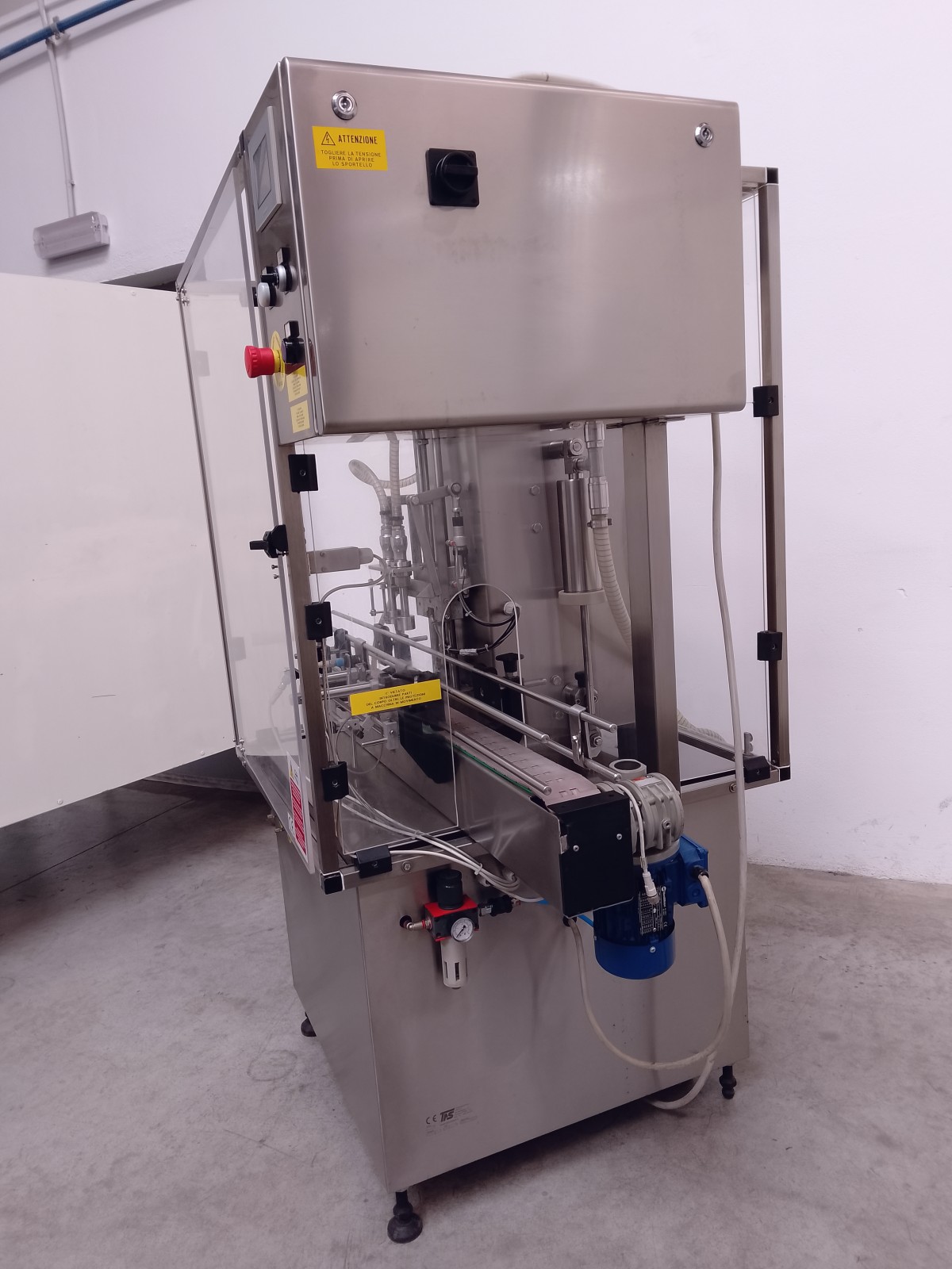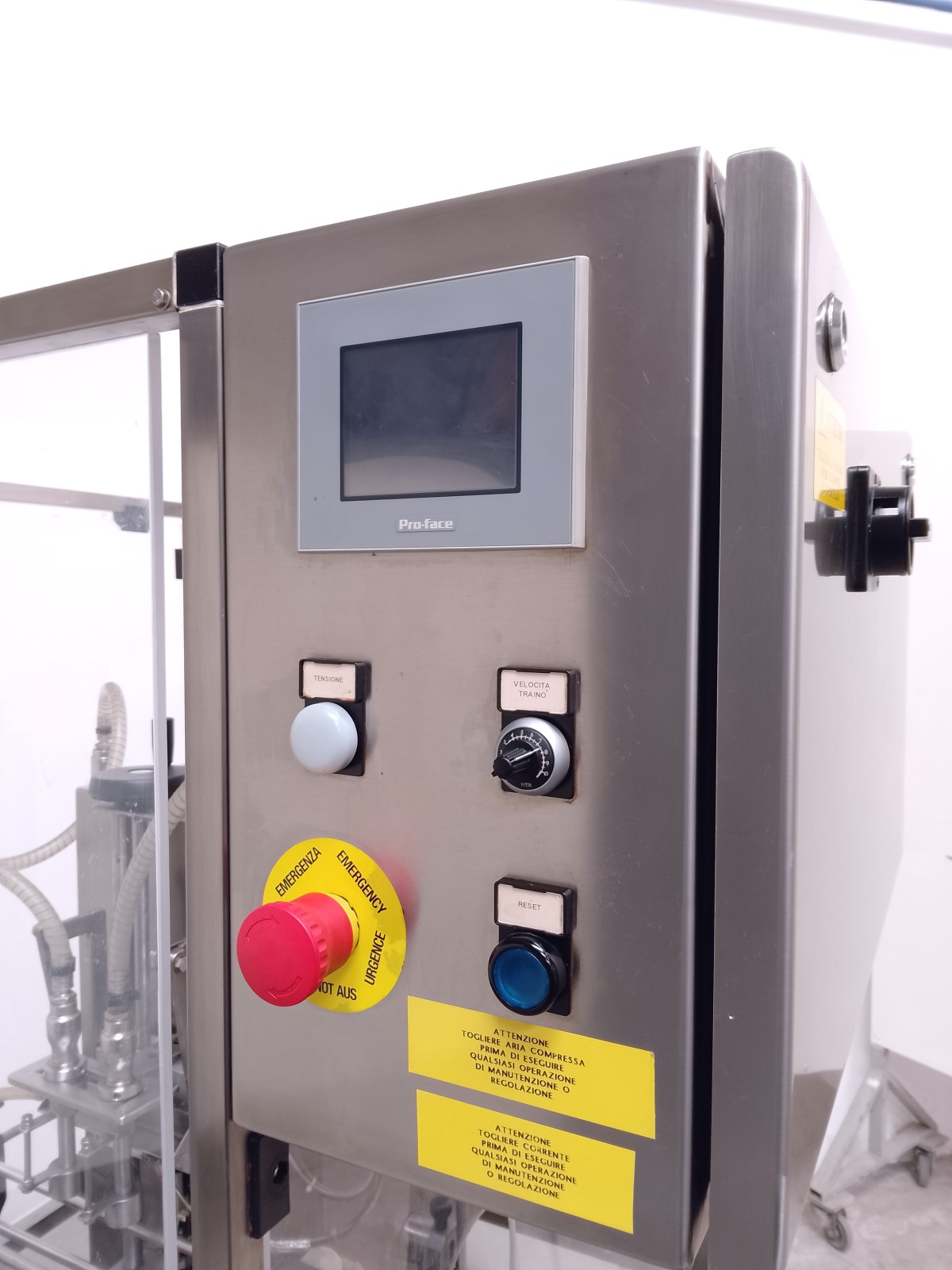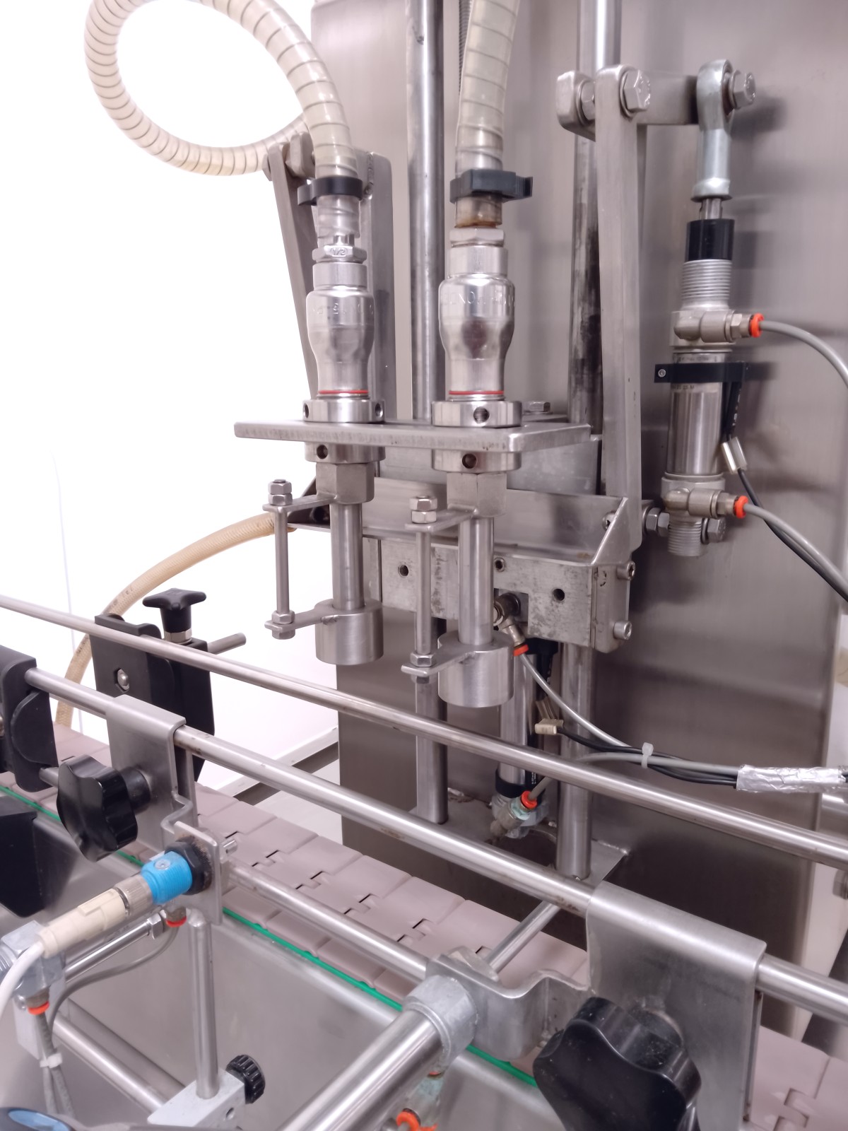 La riempitrice è dotata di due siringhe dosanti complete di valvole in aspirazione/mandata. Presenta 2 ugelli di riempimento su supporto regolabile in altezza. La regolazione della dosata è effettuata in termini di volumi su scala millimetrica mediante una vite micrometrica su ciascuna siringa, con capacità da 20 a 500 cc. L’unità è completa di nastro trasportatore da 1,5 metri a tapparelle in resina rinforzata, fotocellule di lettura presenza recipienti, cabina di protezione con pareti trasparenti in policarbonato e quadro elettrico di comando con visore touch screen a programma elettronico per la programmazione e memorizzazione dei tempi di salita/discesa del gruppo ugelli e dei tempi di apertura/chiusura dei cancelletti. Disponibile un formato di ricambio su richiesta.