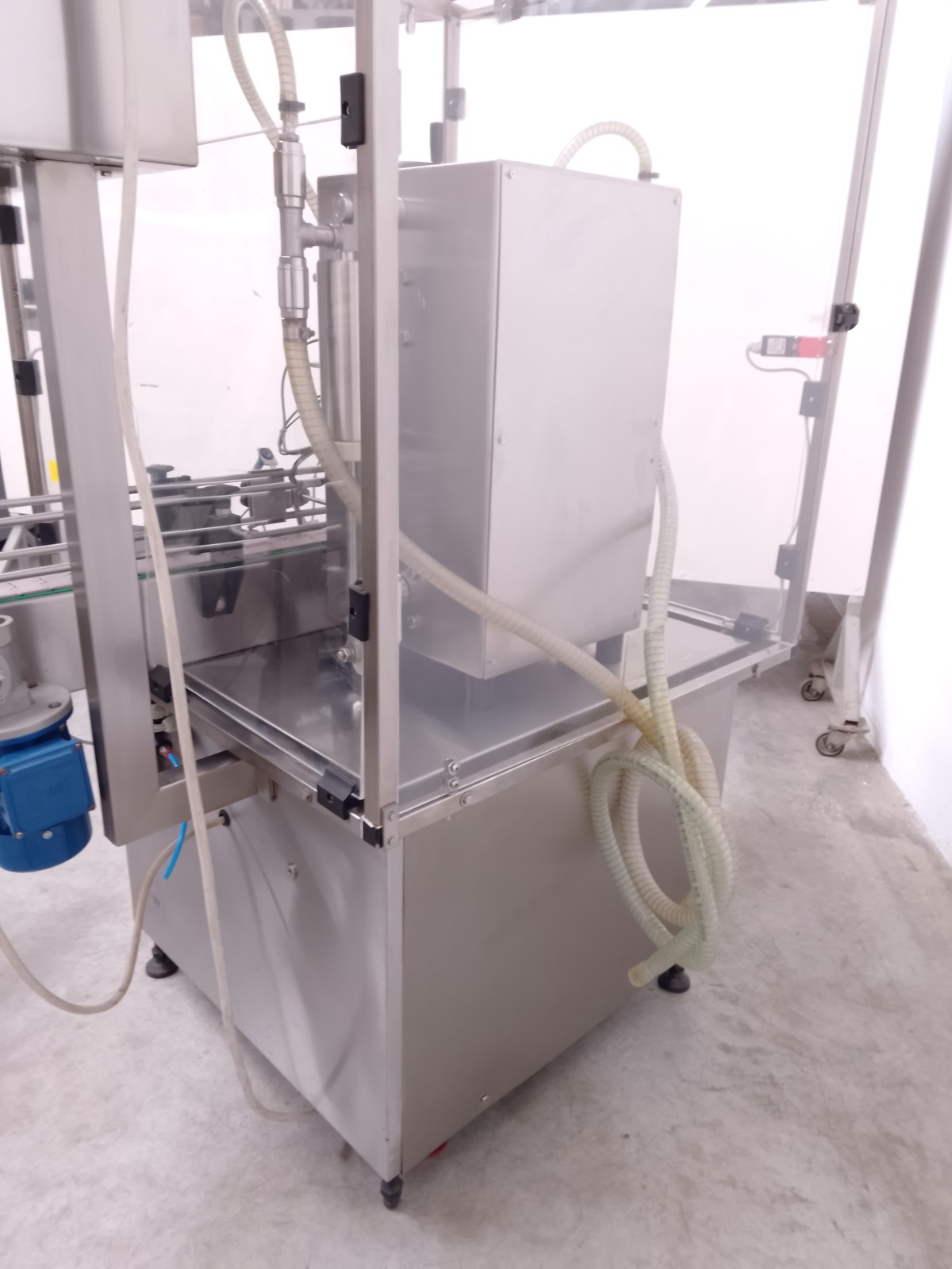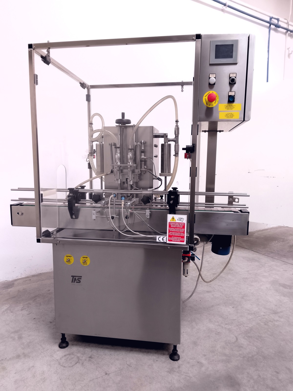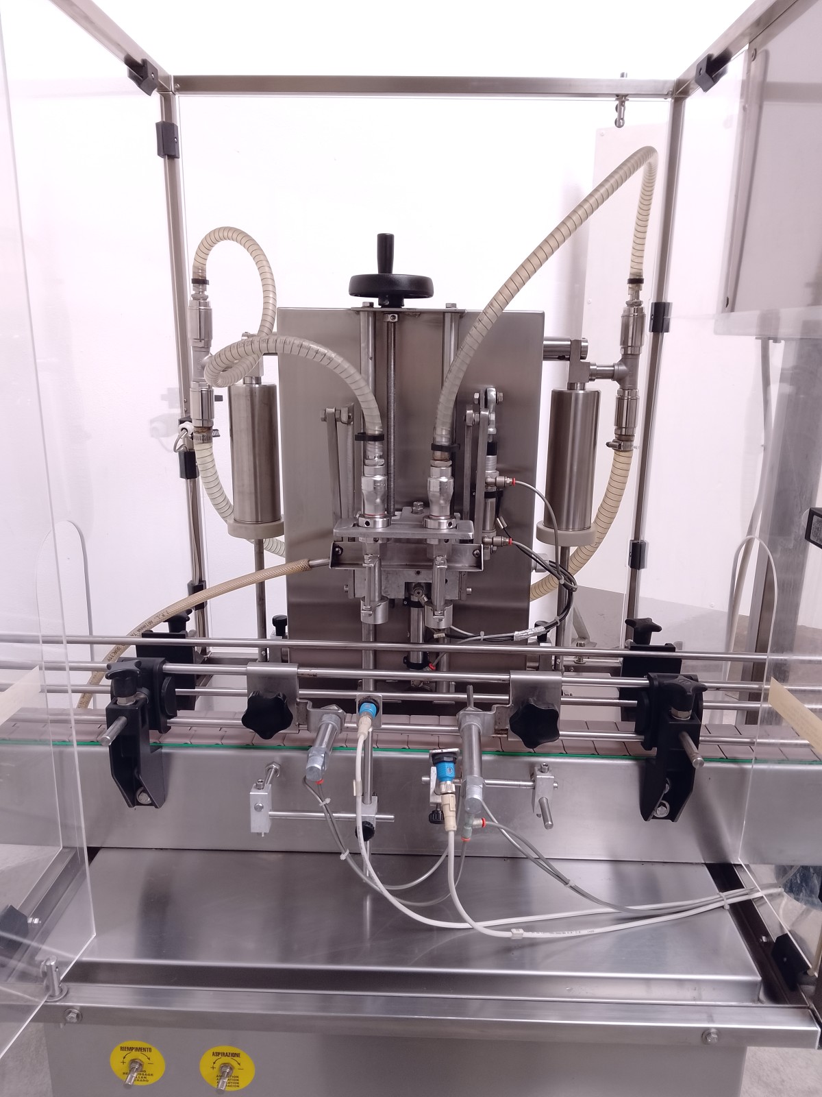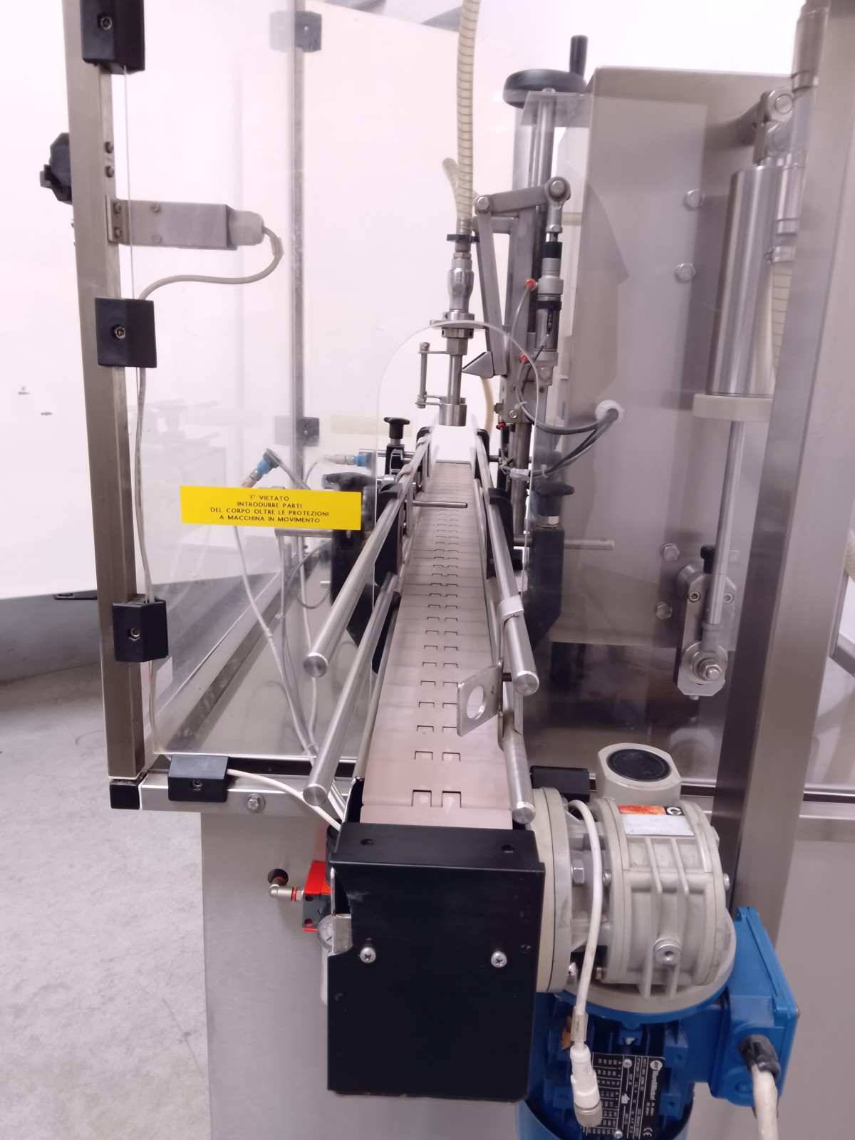 La riempitrice è dotata di due siringhe dosanti complete di valvole in aspirazione/mandata. Presenta 2 ugelli di riempimento su supporto regolabile in altezza. La regolazione della dosata è effettuata in termini di volumi su scala millimetrica mediante una vite micrometrica su ciascuna siringa, con capacità da 20 a 500 cc. L’unità è completa di nastro trasportatore da 1,5 metri a tapparelle in resina rinforzata, fotocellule di lettura presenza recipienti, cabina di protezione con pareti trasparenti in policarbonato e quadro elettrico di comando con visore touch screen a programma elettronico per la programmazione e memorizzazione dei tempi di salita/discesa del gruppo ugelli e dei tempi di apertura/chiusura dei cancelletti. Disponibile un formato di ricambio su richiesta.