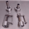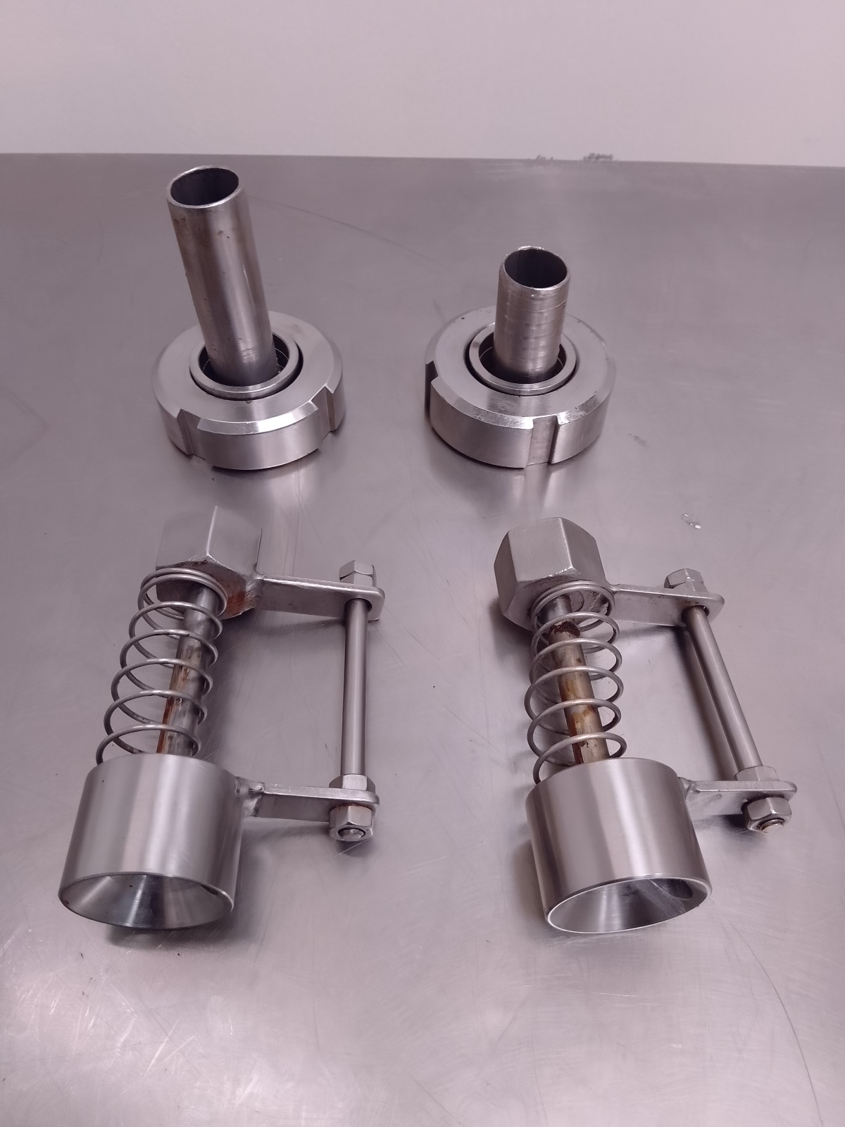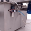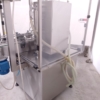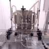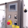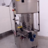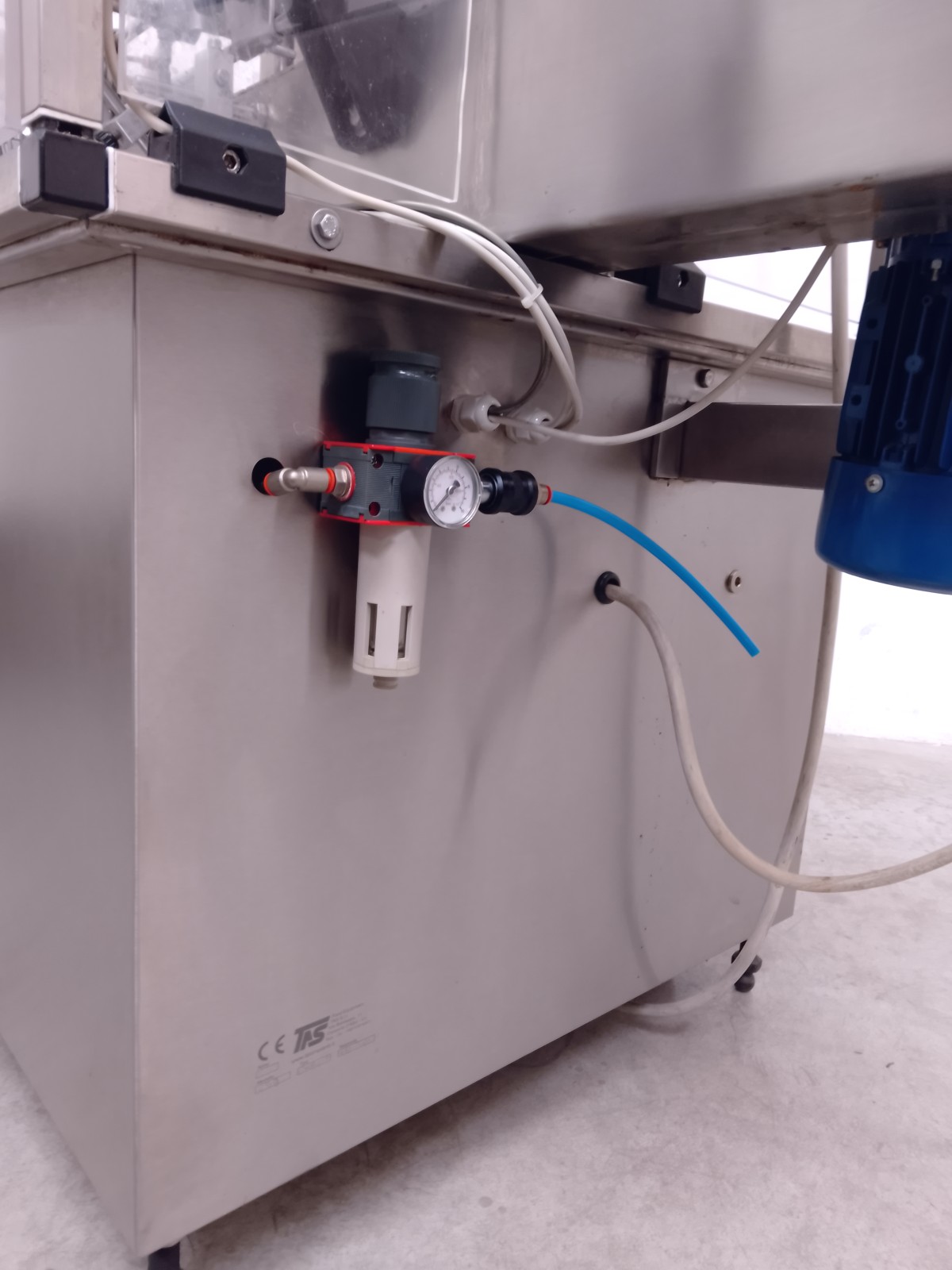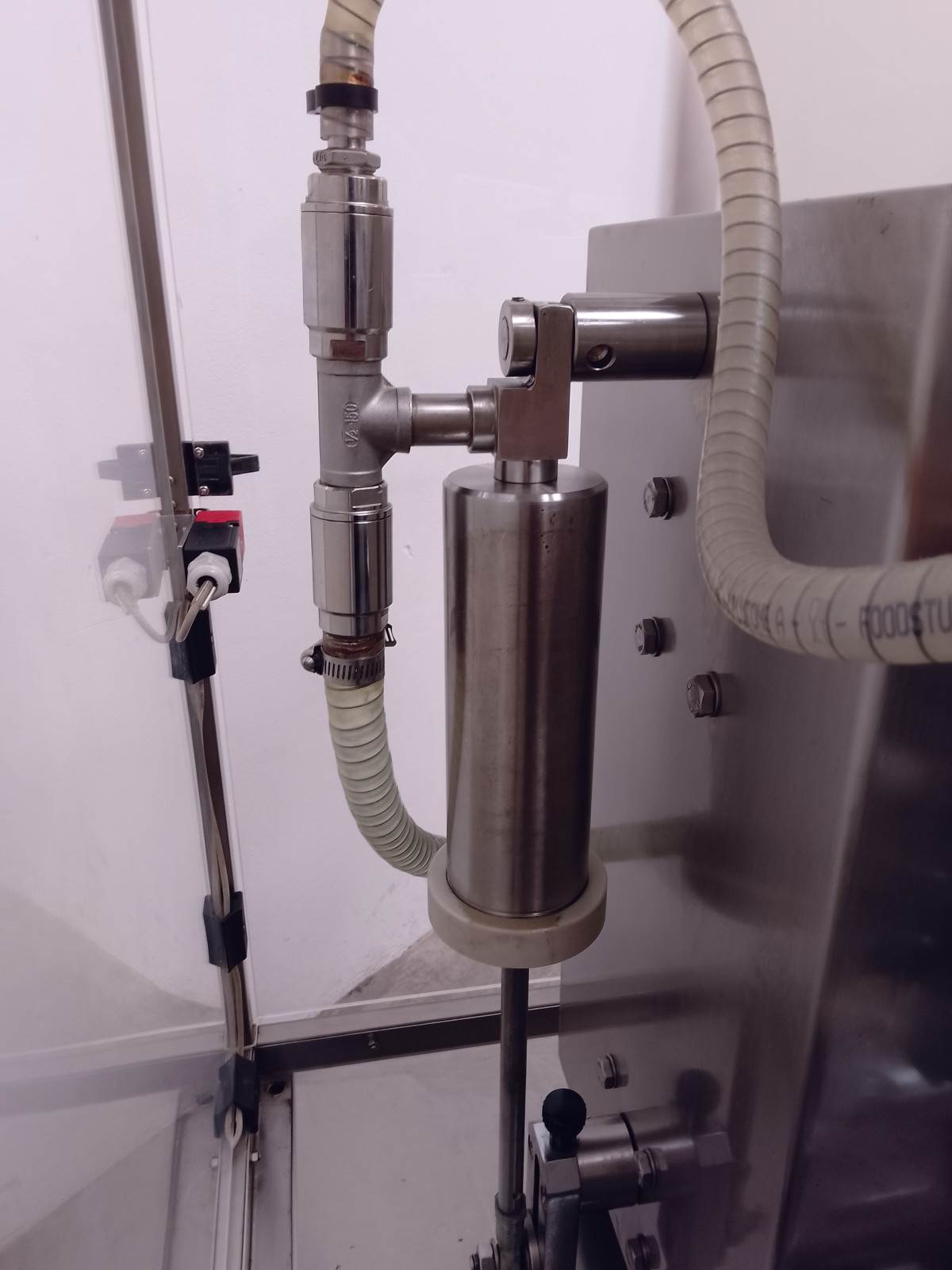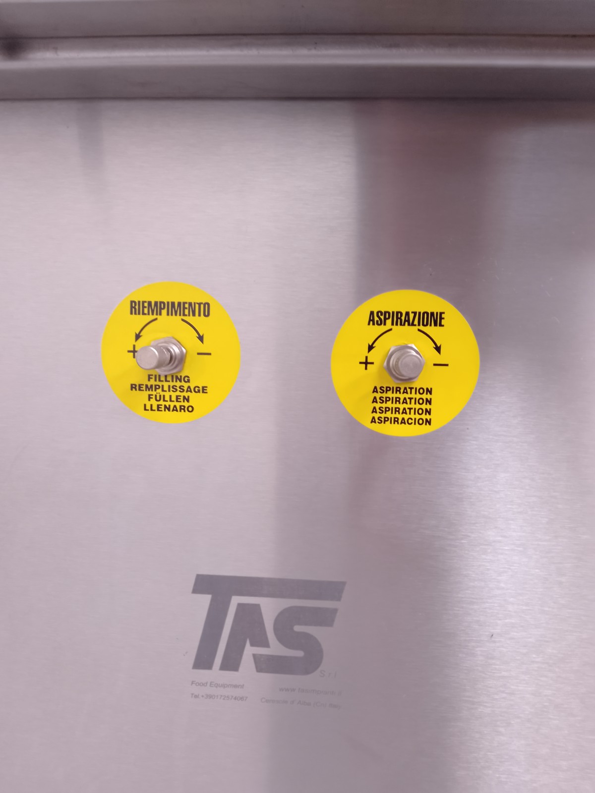 La riempitrice è dotata di due siringhe dosanti complete di valvole in aspirazione/mandata. Presenta 2 ugelli di riempimento su supporto regolabile in altezza. La regolazione della dosata è effettuata in termini di volumi su scala millimetrica mediante una vite micrometrica su ciascuna siringa, con capacità da 20 a 500 cc. L’unità è completa di nastro trasportatore da 1,5 metri a tapparelle in resina rinforzata, fotocellule di lettura presenza recipienti, cabina di protezione con pareti trasparenti in policarbonato e quadro elettrico di comando con visore touch screen a programma elettronico per la programmazione e memorizzazione dei tempi di salita/discesa del gruppo ugelli e dei tempi di apertura/chiusura dei cancelletti. Disponibile un formato di ricambio su richiesta.