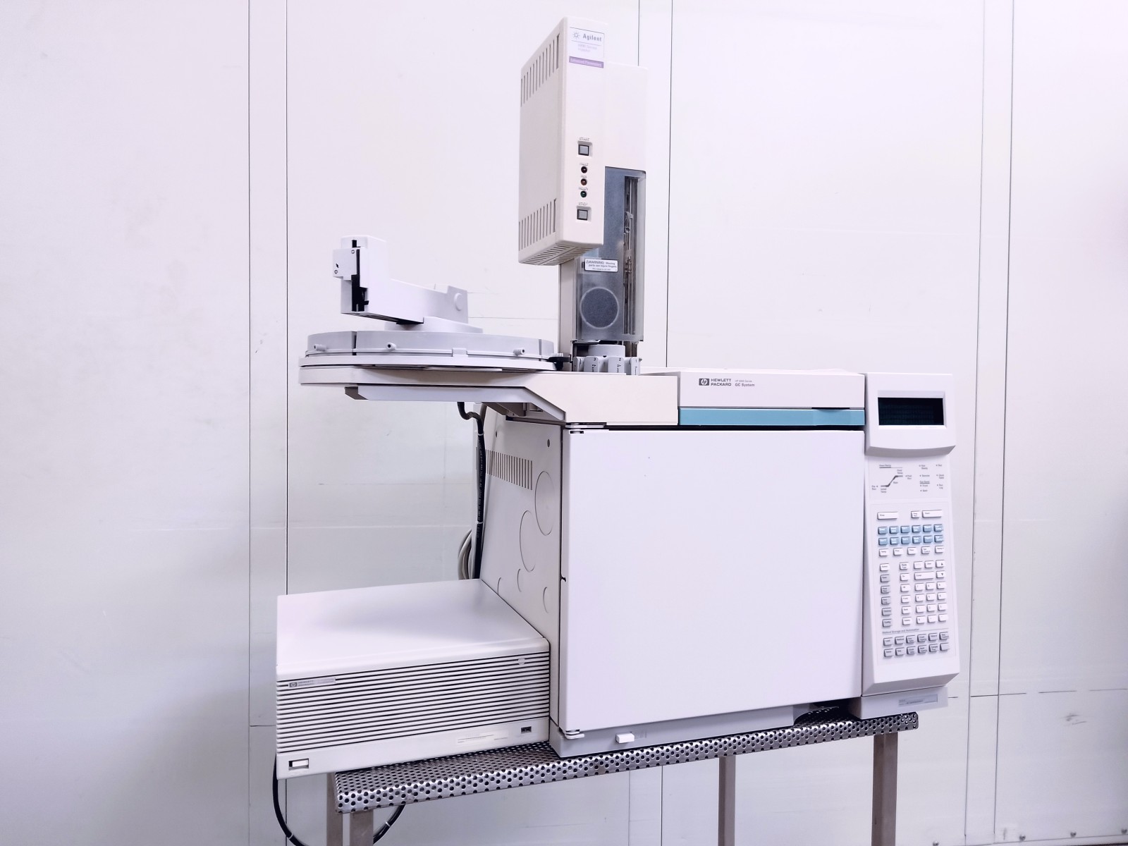 Le chromatographe à gaz Hewlett Packard HP 6890 Series est un instrument d’analyse chimique avancé, conçu pour séparer et identifier les composants individuels d’un mélange complexe. Son fonctionnement repose sur l’interaction d’un échantillon sous forme de vapeur avec une phase stationnaire contenue dans une colonne. L’échantillon est injecté dans le système et transporté à travers la colonne par un flux continu de gaz porteur (la phase mobile). Grâce aux différentes propriétés physiques et chimiques, les composants du mélange se déplacent à des vitesses différentes, interagissant de manière sélective avec la phase stationnaire. Ce processus permet à chaque composant de sortir de la colonne à un moment distinct, connu sous le nom de temps de rétention, permettant une analyse précise de la composition de l’échantillon.