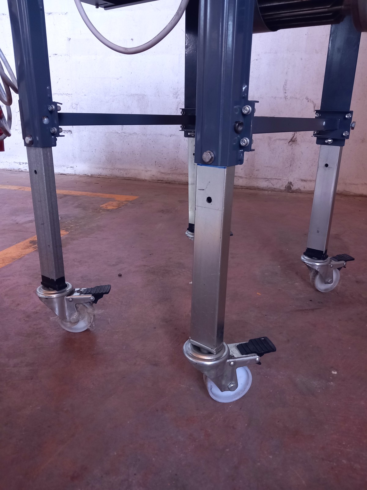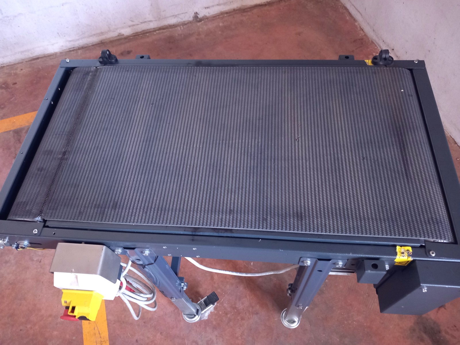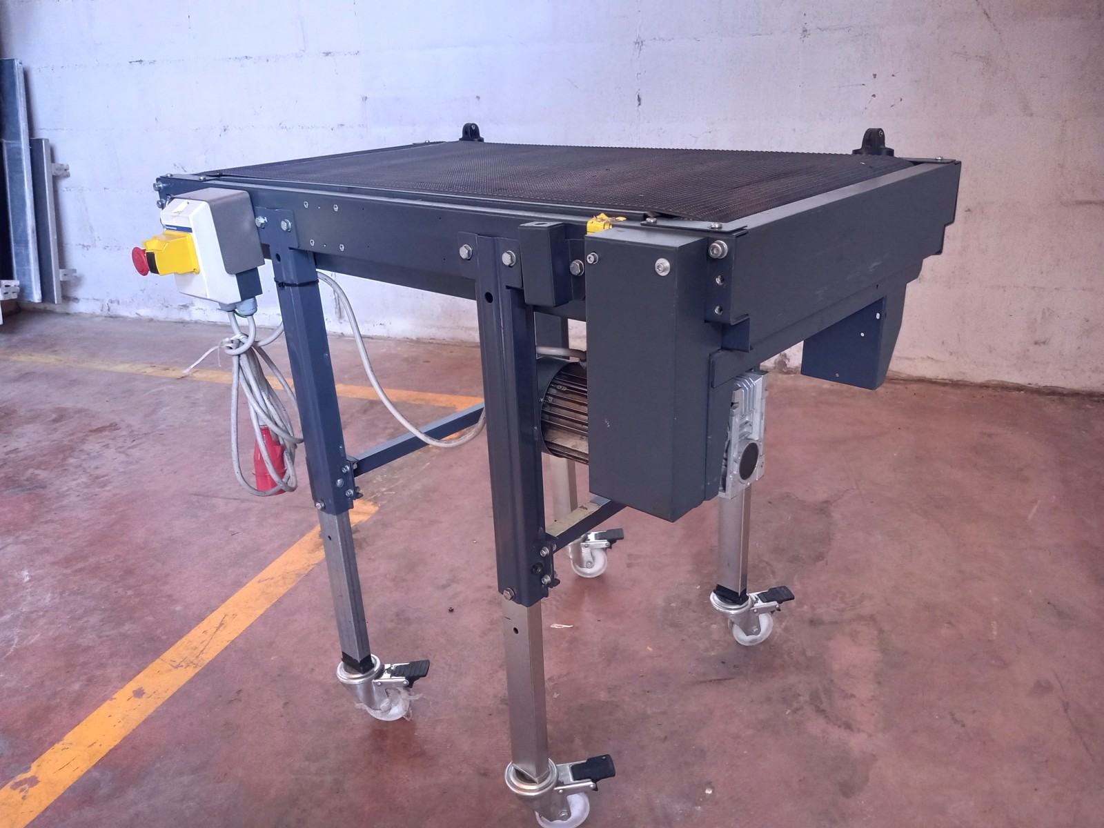 The conveyor belt ensures the continuous transfer over time of the material or materials loaded on its upper part. The belt receives and contains the transported material while simultaneously transmitting the necessary force for the movement of the load. At the ends, this belt wraps around drums, thus creating a closed loop that allows for continuous material transport without stops. This stainless steel conveyor belt is equipped with a plastic material belt, with side rails for containing the transported material and an electric motor for movement. The unit is complete with steel supports with feet that ensure stability for both the machine and the transported goods. The belt is equipped with an electric motor for movement, a control panel, and an emergency stop button.