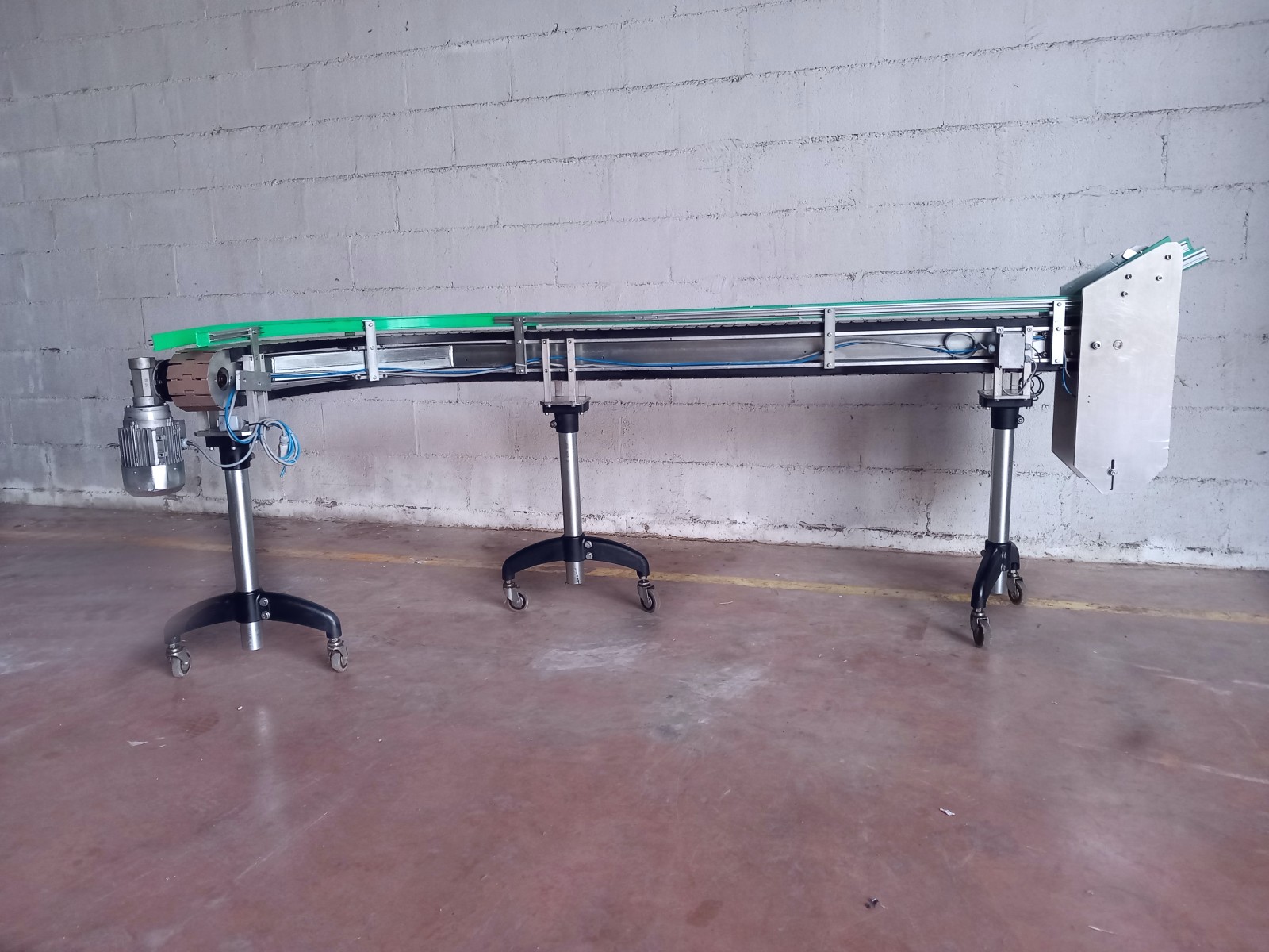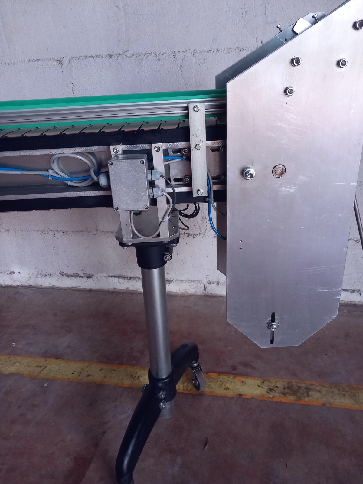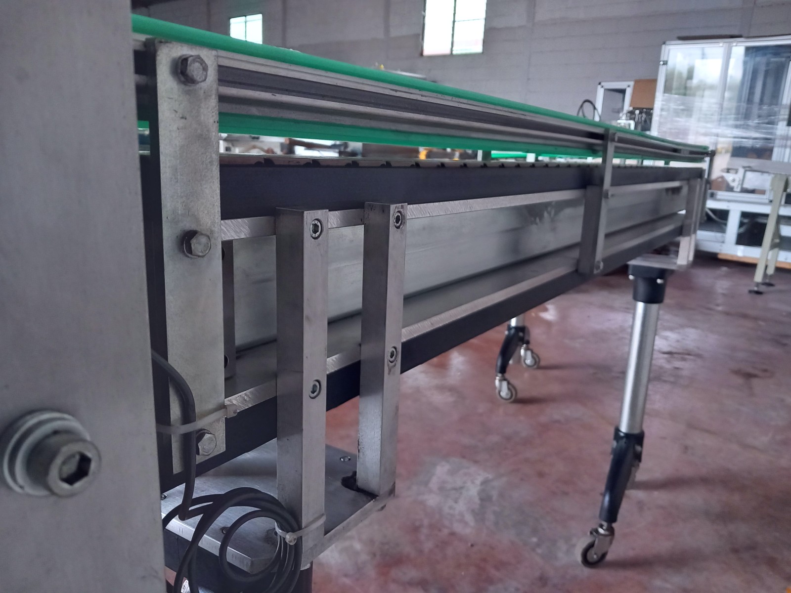 The conveyor guarantees continuous transfer of the material loaded on its upper surface. It is designed to receive and contain the transported material while transmitting the necessary force for load movement. The belt wraps at the ends, creating a closed loop that allows continuous transport without stops. Made of stainless steel, the conveyor features a plastic belt, side guards for load safety, feet for stability, and an electric motor for operation.