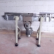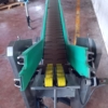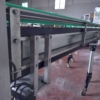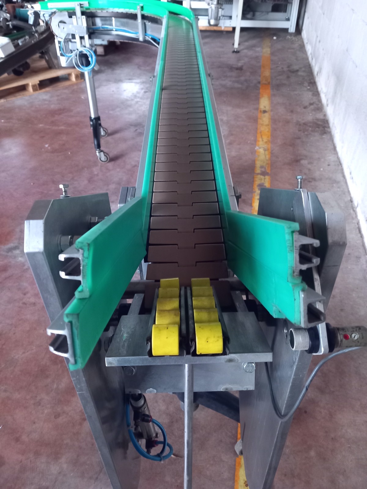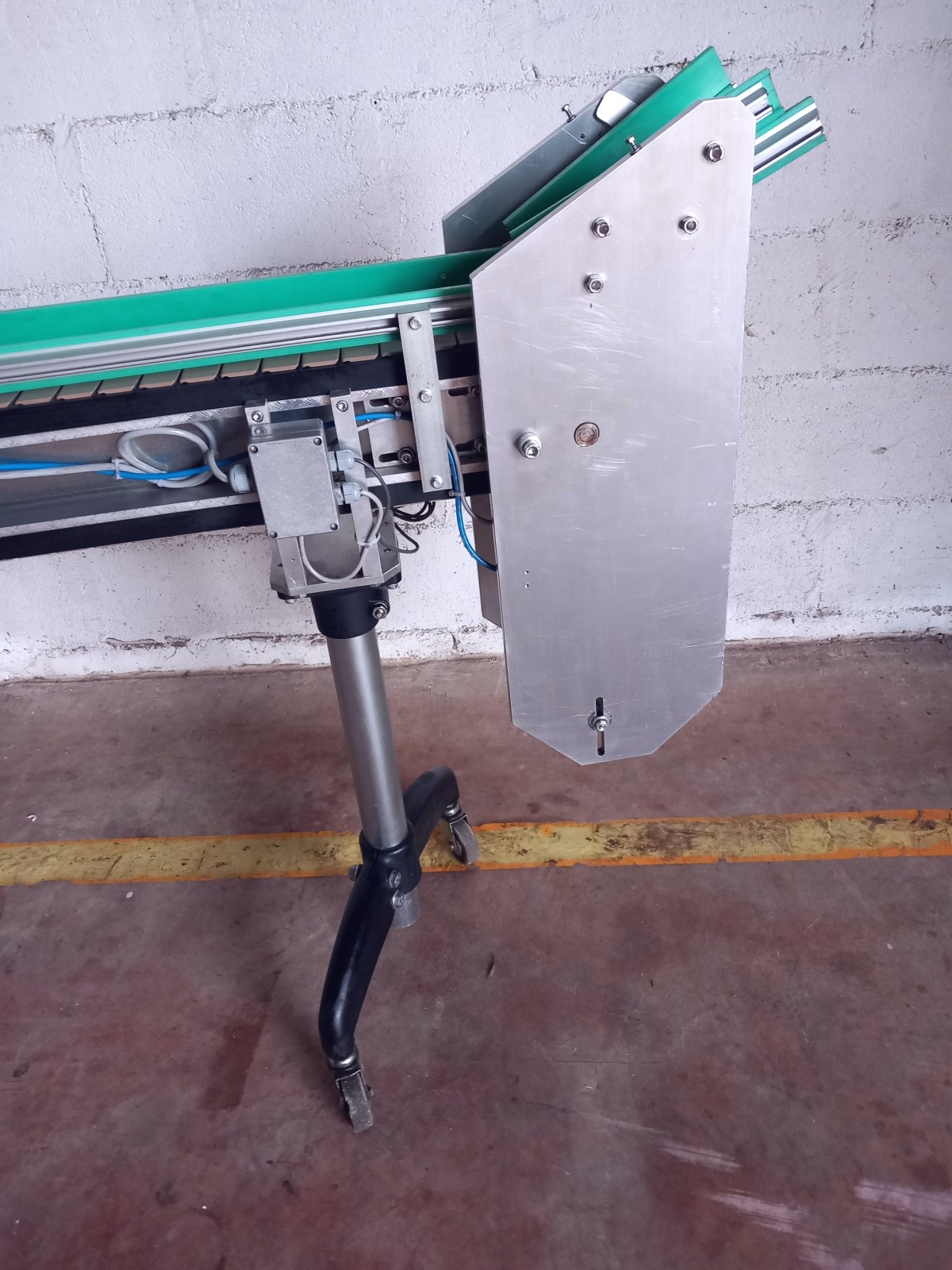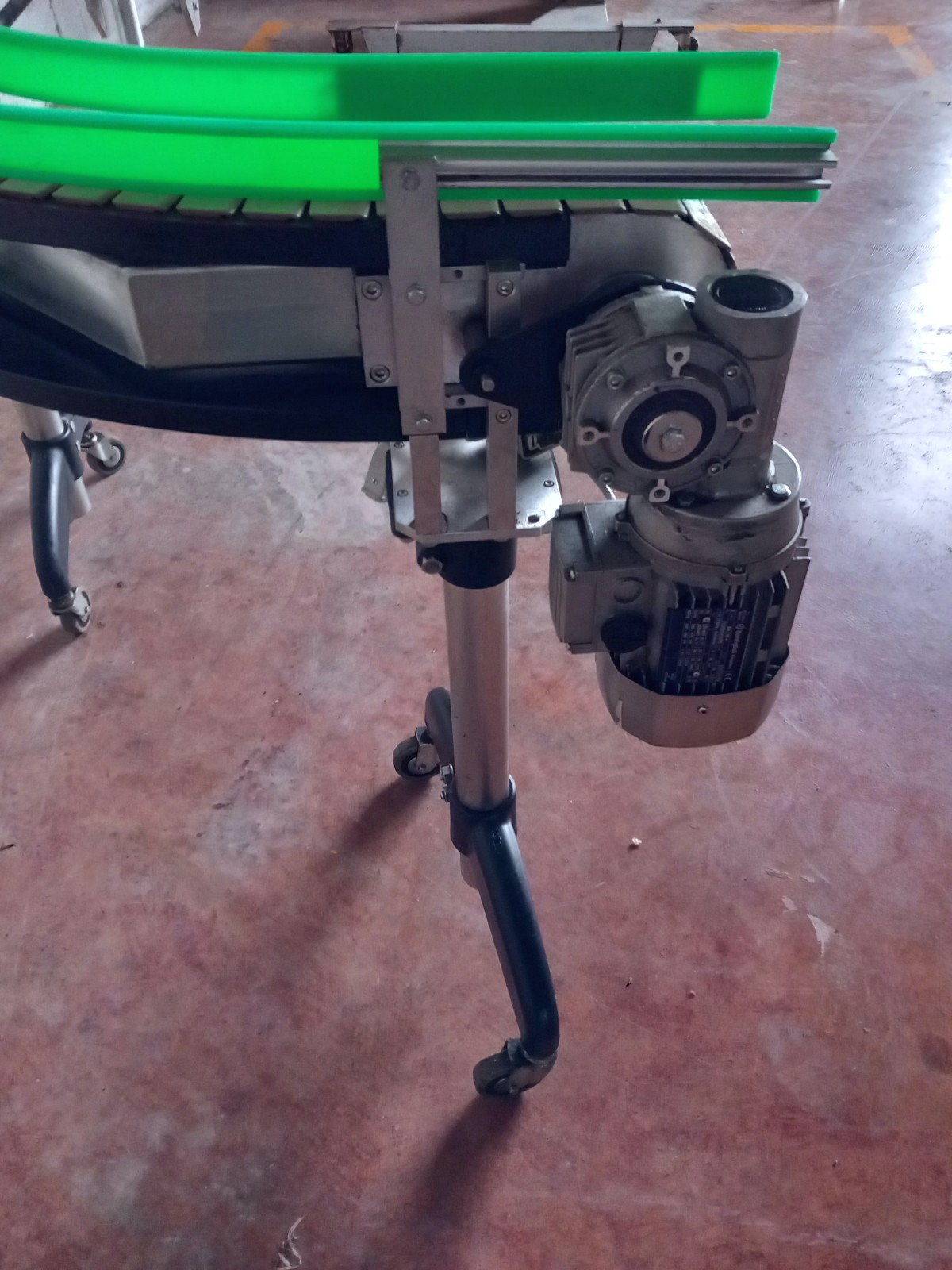 The conveyor guarantees continuous transfer of the material loaded on its upper surface. It is designed to receive and contain the transported material while transmitting the necessary force for load movement. The belt wraps at the ends, creating a closed loop that allows continuous transport without stops. Made of stainless steel, the conveyor features a plastic belt, side guards for load safety, feet for stability, and an electric motor for operation.