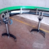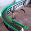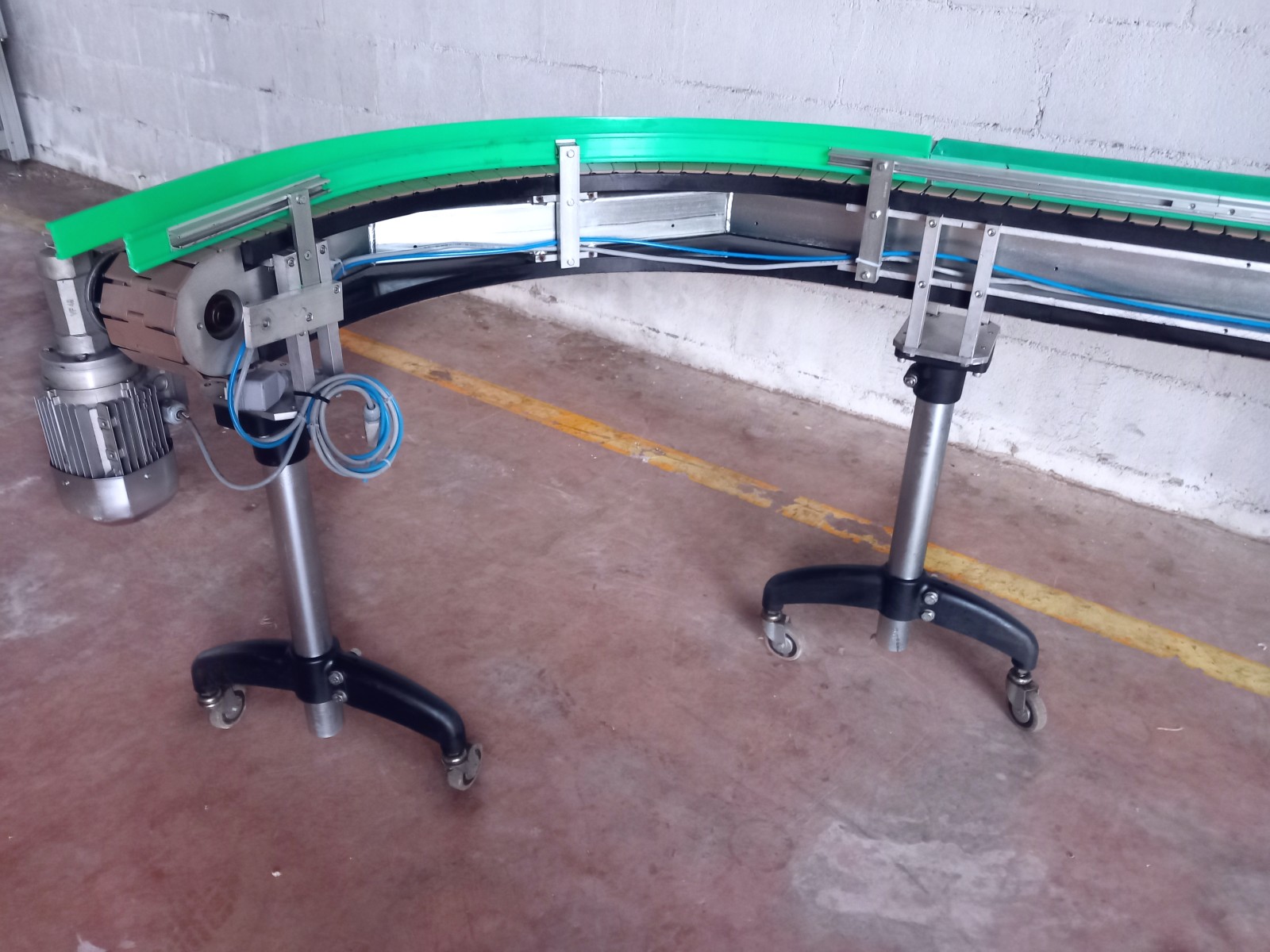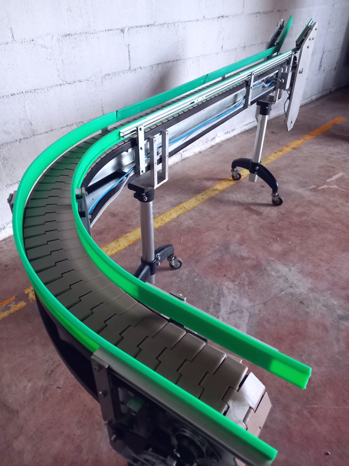 Motorized conveyor belt in stainless steel with a 90° curve.
