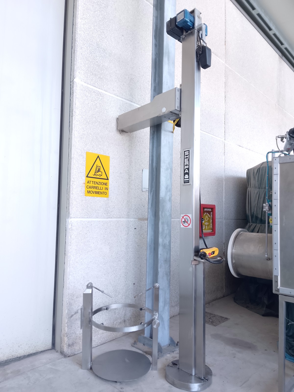 El elevador de tanques Manes Sherpa es un sistema de elevación industrial diseñado para mover de manera segura contenedores, tanques y barriles en entornos de producción de los sectores farmacéutico, cosmético, químico y alimentario. Su estructura de acero inoxidable garantiza robustez, resistencia a la corrosión y facilidad de saneamiento, lo que lo hace adecuado para su uso en departamentos con altos estándares de higiene. La unidad está equipada con un polipasto eléctrico de cadena Donati, instalado en una columna vertical que permite un levantamiento controlado a través de un panel de control. El sistema incluye una cesta portatanques con un enganche en una placa giratoria manual, diseñada para acomodar tanques con un diámetro de 490 mm y una altura mínima de 500 mm, facilitando las operaciones de posicionamiento, rotación y descarga. El elevador está diseñado para garantizar la máxima estabilidad y seguridad durante el transporte vertical de cargas, integrando componentes mecánicos fiables y un diseño ergonómico que facilita las actividades operativas. La serie Sherpa se emplea típicamente para alimentar líneas de mezcla, llenado o pesaje, así como para el transporte seguro de tanques entre diferentes estaciones de proceso.
