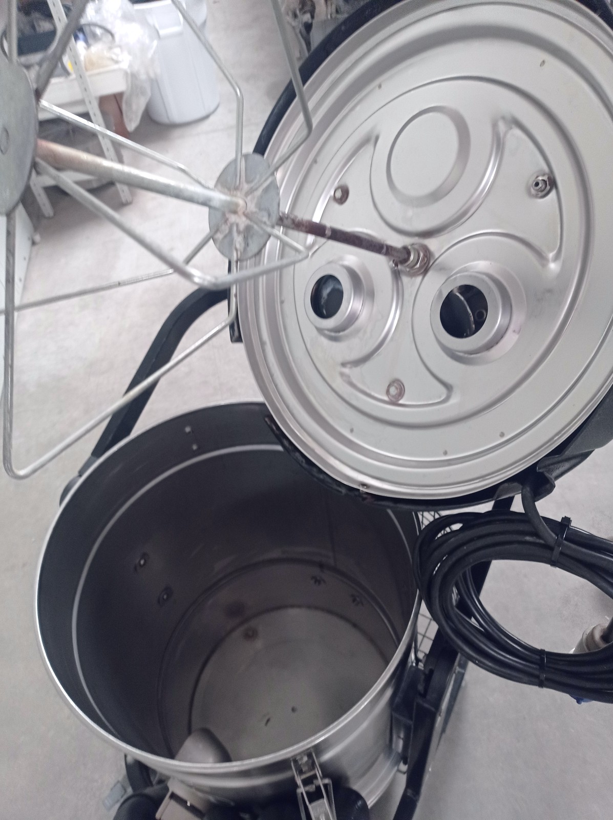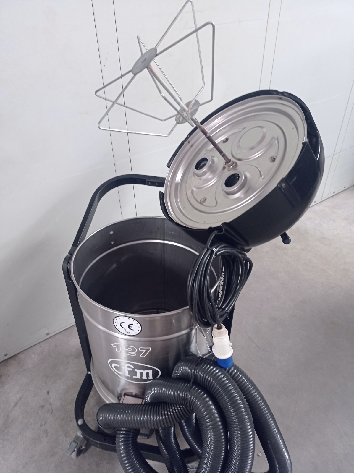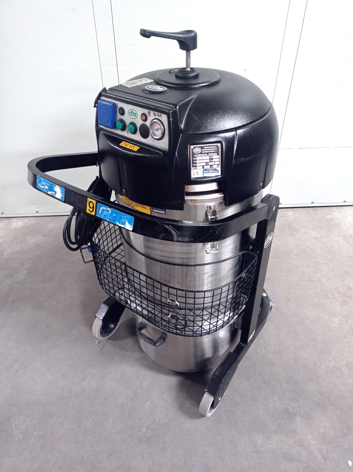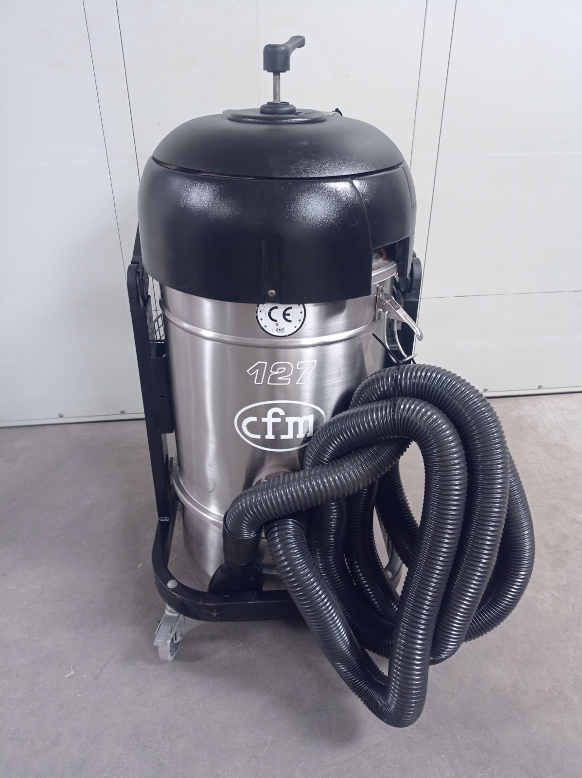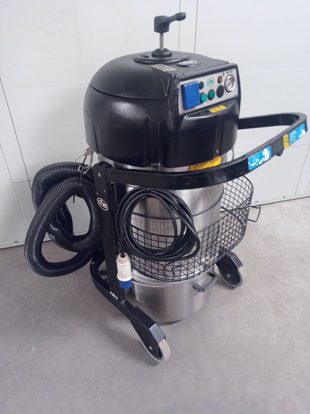 L’extracteur industriel de poussière Nilfisk CFM modèle 127 XX est conçu pour des applications de nettoyage et d’aspiration dans des environnements industriels. La machine est montée sur un châssis à roulettes avec un conteneur en acier inoxydable amovible et un système de filtration interne avec un dispositif de nettoyage de filtre manuel intégré à la tête. Équipée d’un panneau de contrôle frontal avec des boutons de démarrage/arrêt et un indicateur de contrôle, elle est adaptée à l’aspiration de poussières et de résidus solides dans les départements de production, les ateliers et les lignes de processus.