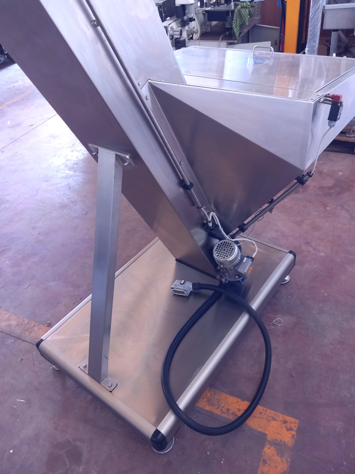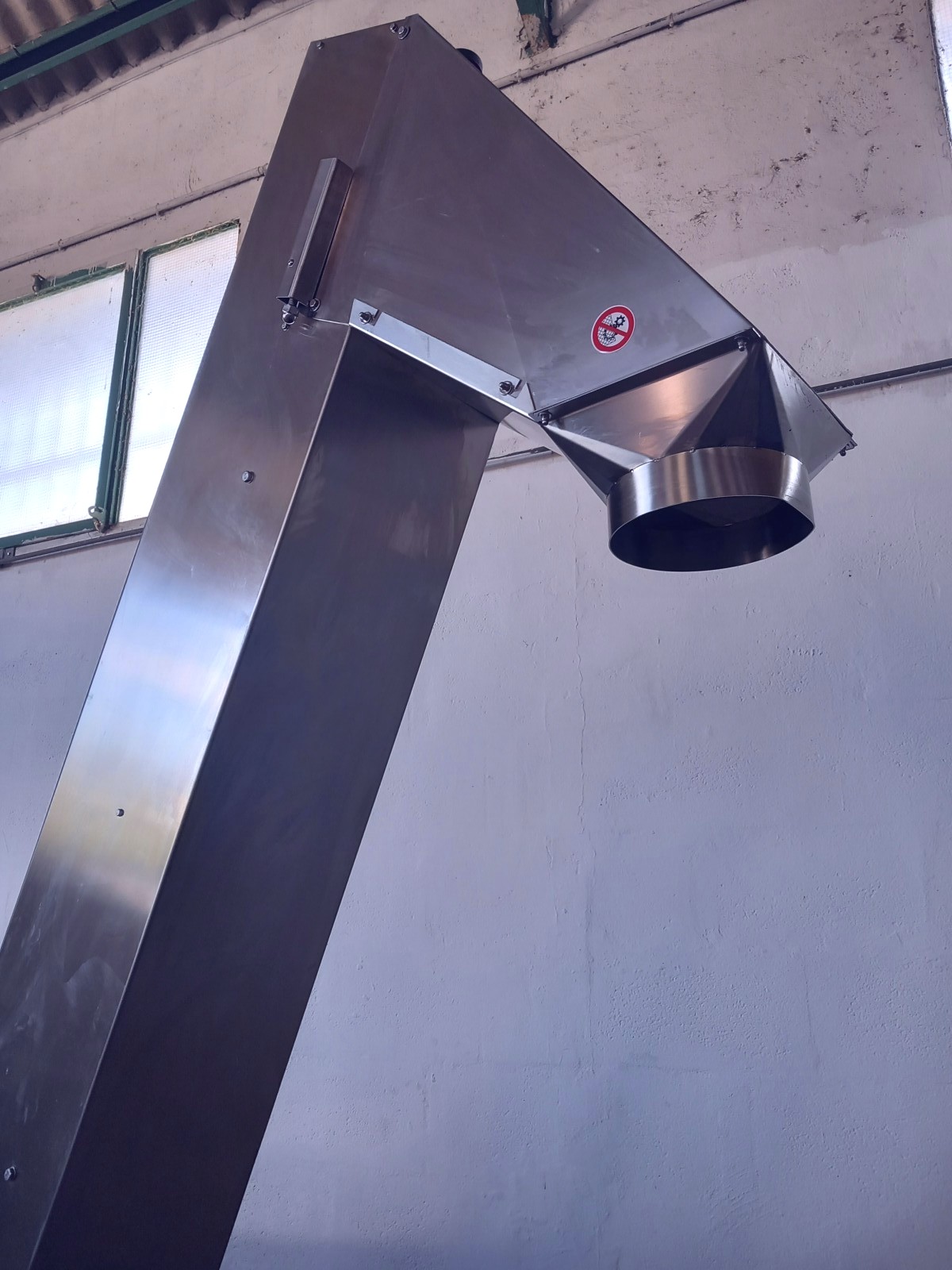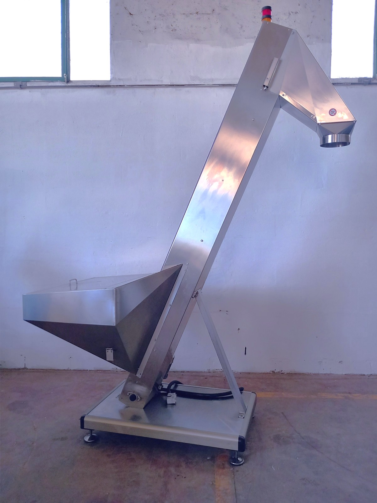 Ideal for lifting and feeding powdered, granular, or small components in high-altitude production lines, such as hoppers of tablet presses or filling machines. The system picks up the product from a lower hopper and transports it vertically along the inclined column to the high outlet. The height and dimensions of the elevator allow its use in production lines that require a significant height footprint for managing product flows.