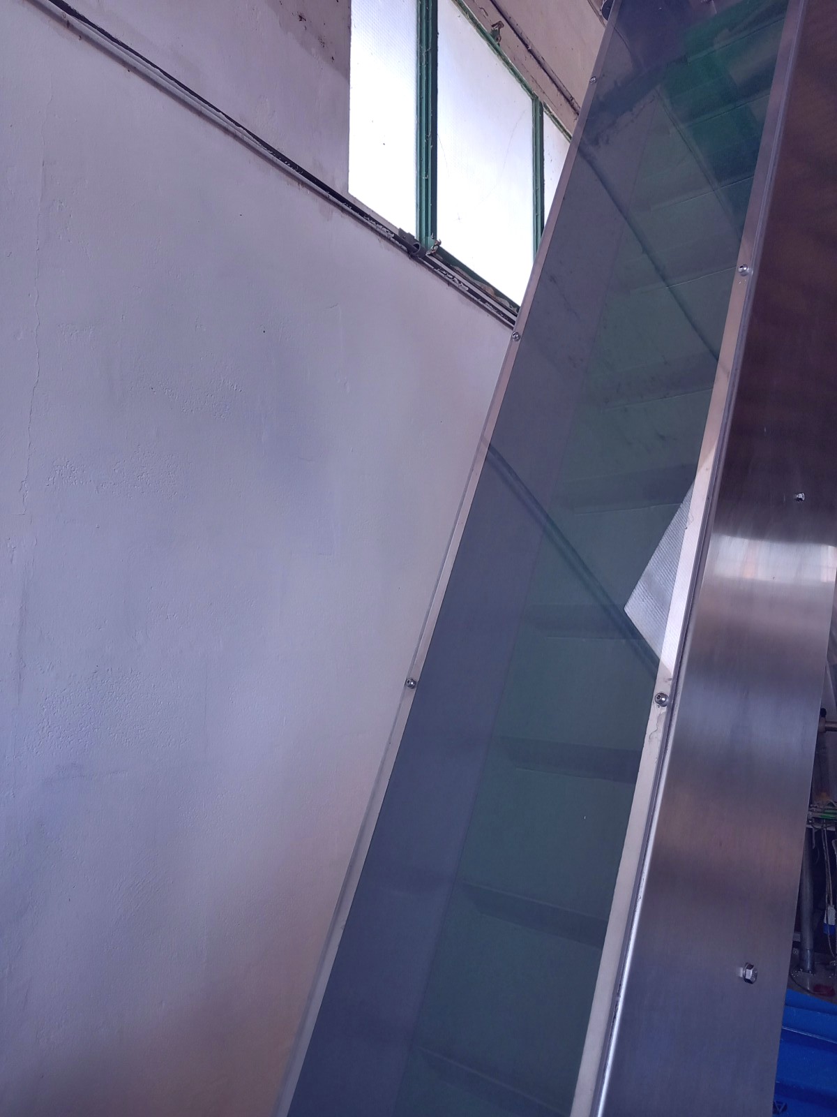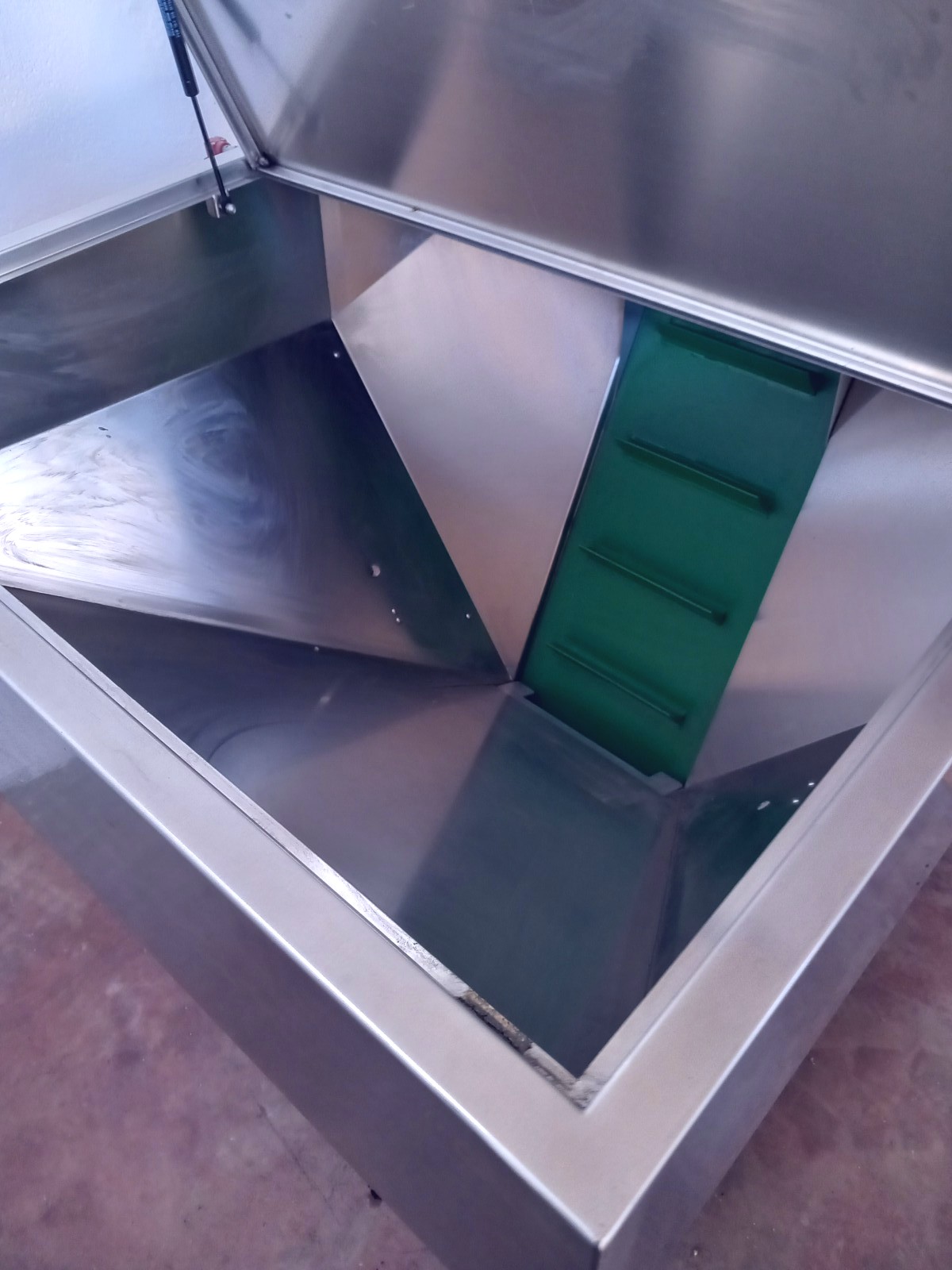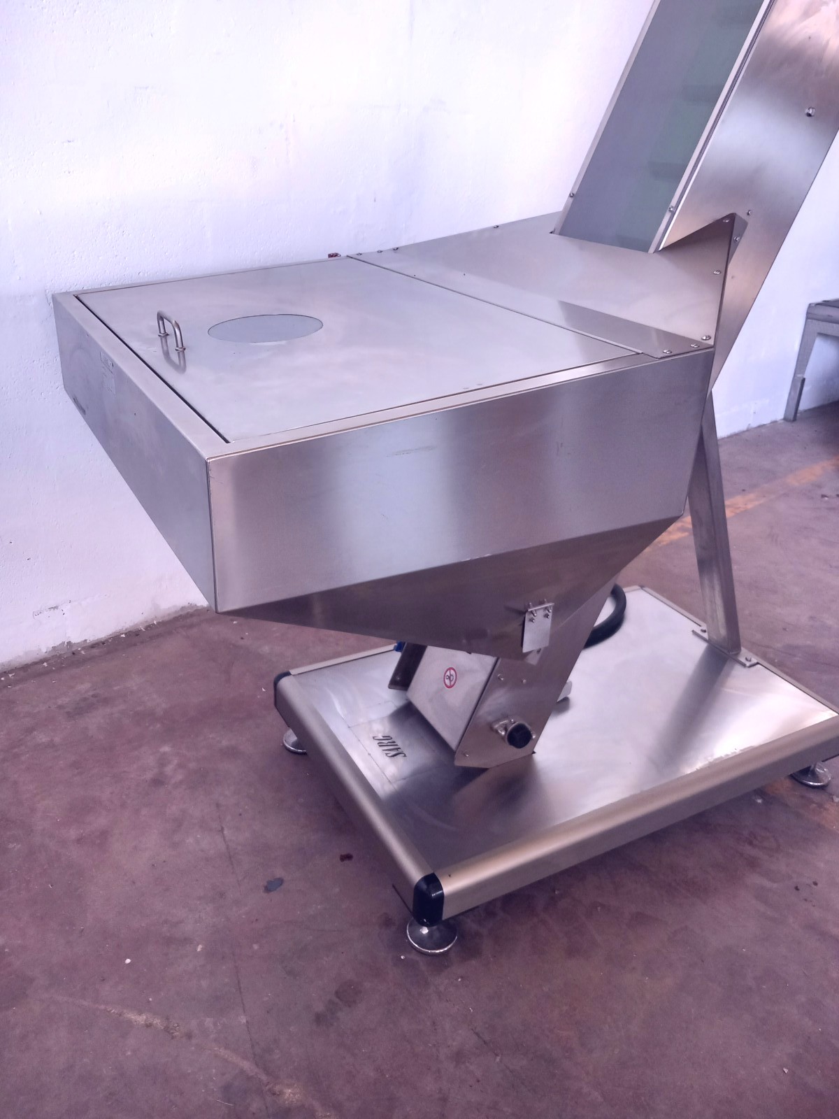 Ideal for lifting and feeding powdered, granular, or small components in high-altitude production lines, such as hoppers of tablet presses or filling machines. The system picks up the product from a lower hopper and transports it vertically along the inclined column to the high outlet. The height and dimensions of the elevator allow its use in production lines that require a significant height footprint for managing product flows.