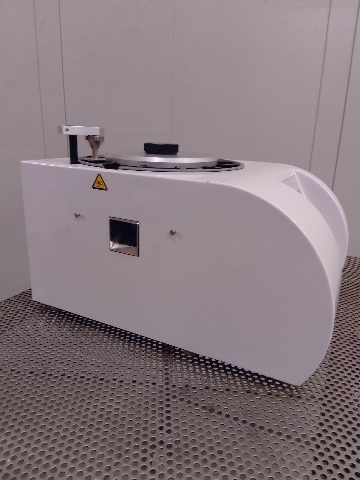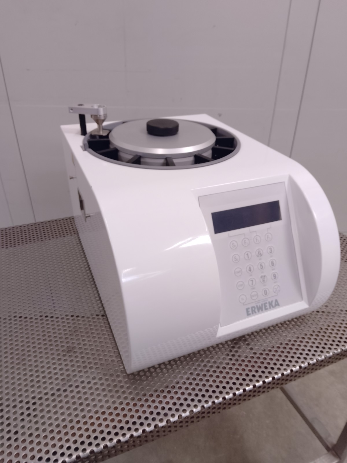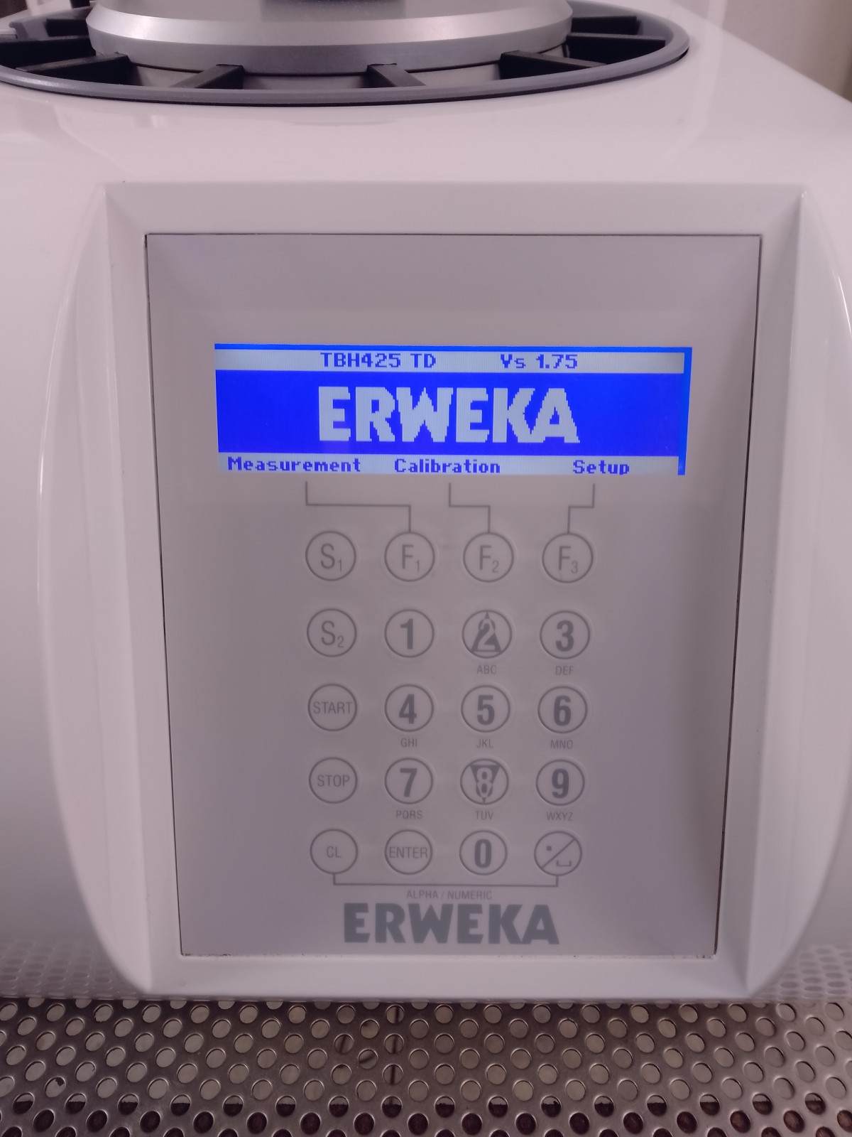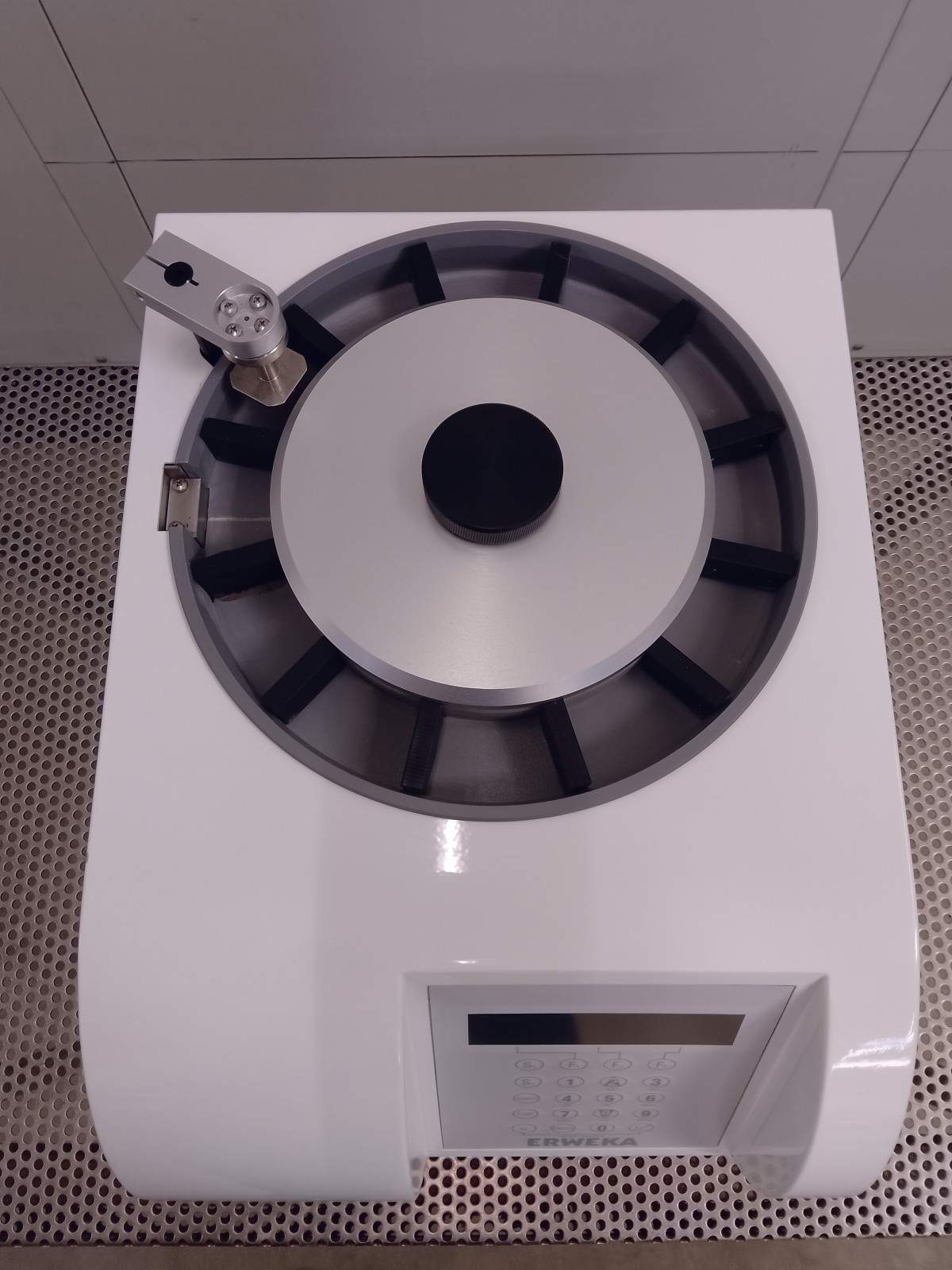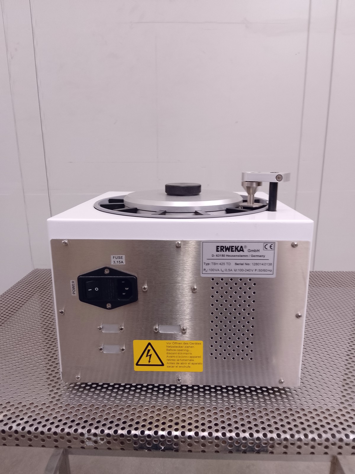 The ERWEKA TBH 425 TD model is a hardness tester and tablet combination, designed for semi-automatic measurement of up to 10 samples. The samples are loaded into a star feeder and are then automatically transported to the testing station for measurement. The instrument can automatically measure hardness, thickness, diameter, or length (for elongated shapes) of round or irregularly shaped tablets. It features a membrane numeric keypad that allows the entry and saving of nominal hardness and up to three individual tolerances, along with other observations for up to 50 different products. These settings can be easily recalled for future tests, and the instrument also supports the entry of information such as product names and batch numbers. The calibration of the hardness testing station is guided by a menu and can be performed using weight stones or the ERWEKA AutoCal 2.0 electronic system. The device includes USB and serial LAN/USB interfaces, allowing connection to a printer for documentation or to a computer with the optional MC.NET software for external control. When used with this software, the TBH 425 TD complies with the 21 CFR 11 standard.