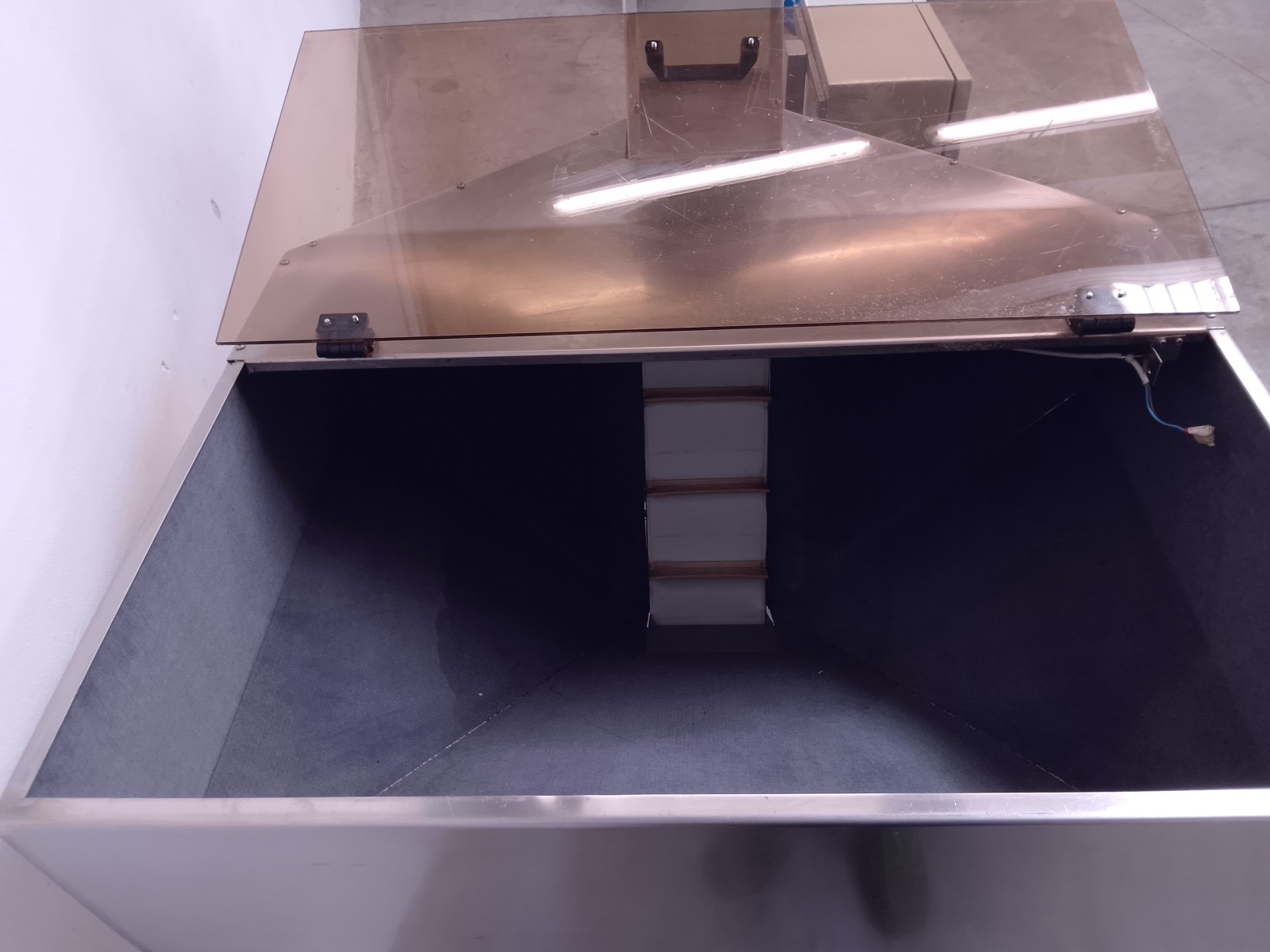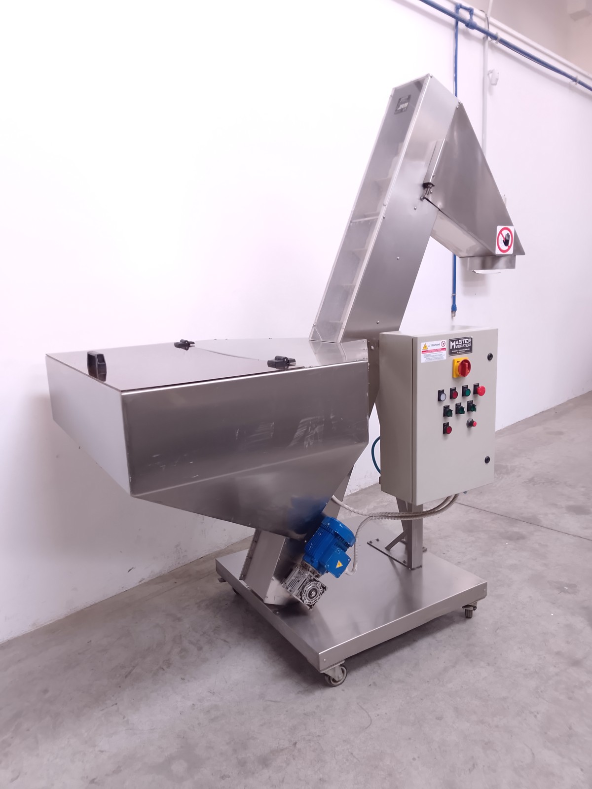The hopper elevator is designed for the efficient transport of materials such as caps or bottles, elevating the load from the fixed hopper. The hopper is easily loaded manually and features a transparent polycarbonate dust cover. The feeding system utilizes a polyurethane conveyor belt with paddles for effective material elevation up to the sorting point. The operator’s safety is ensured by a transparent structure that protects from moving parts. The electrical system is easy to manage, with a control panel containing the main controls.