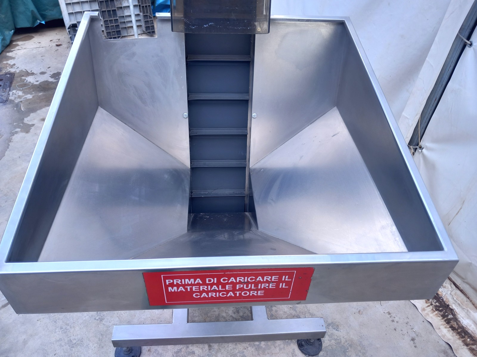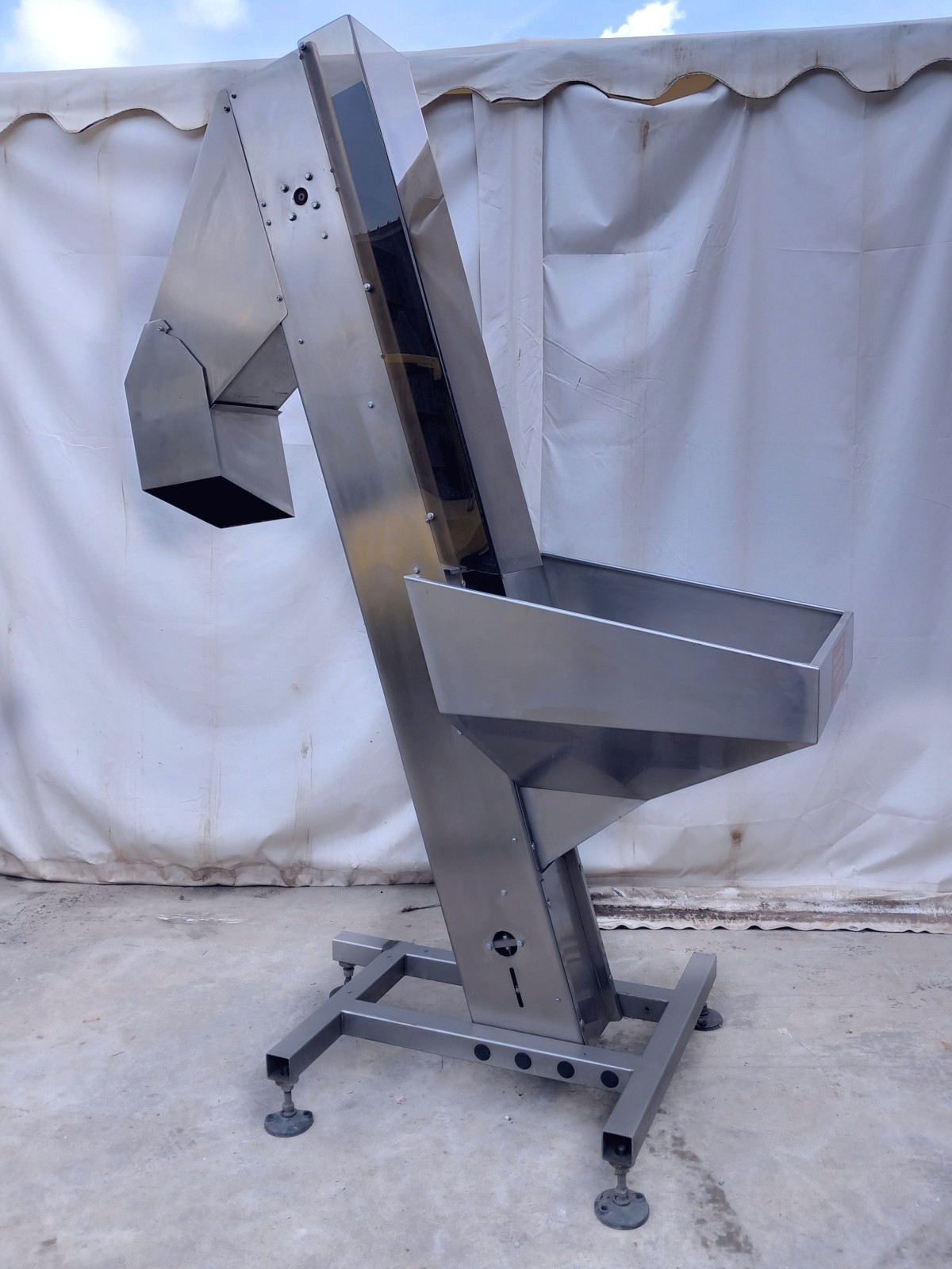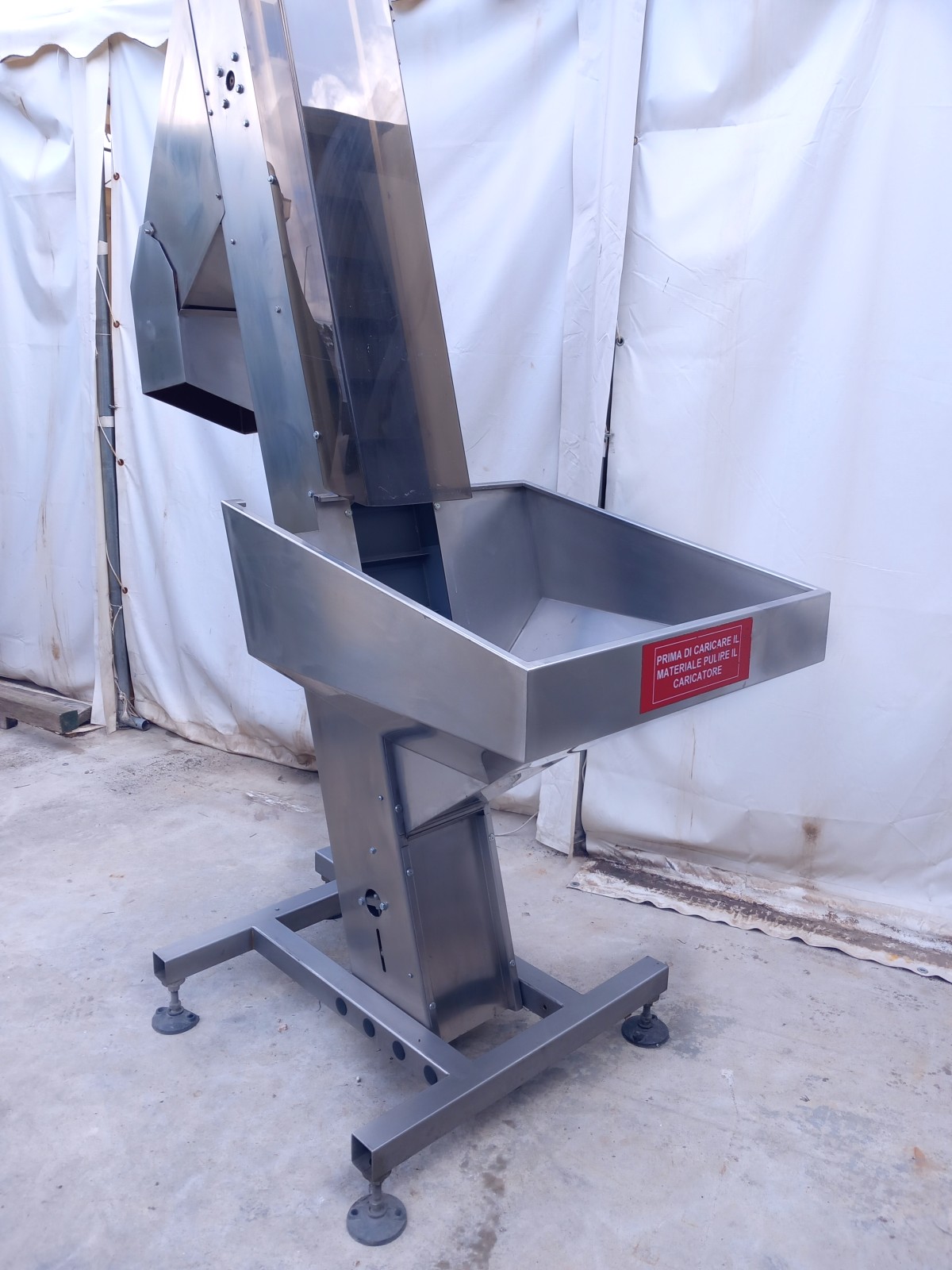 Edelstahl-Trichteraufzug, der den Transport von Material vom Trichter ĂŒber den Förderer bis zur Entladeöffnung ermöglicht. Der feste Trichter kann manuell befĂŒllt werden, dank seiner Höhe. Die Ladung wird angehoben, gruppiert und schlieĂlich gefördert. Der Trichter besteht aus Edelstahl und ist durch eine transparente Polycarbonat-Staubabdeckung geschĂŒtzt. Die ZufĂŒhrung erfolgt ĂŒber ein Polyurethanförderband, das aus einer Reihe von Schaufeln besteht, um das Bauteil bis zum Sortierpunkt anzuheben. Der Transportbereich sowie der Trichter sind ebenfalls durch eine transparente Staubschutzstruktur abgedeckt, die zudem den Bediener vor beweglichen Maschinenteilen schĂŒtzt. Die elektrische Anlage befindet sich in einem unteren Panel, das die Hauptsteuerungen einfach und klar zusammenfasst und die Motorsteuerung ermöglicht. Die hohe Vielseitigkeit ermöglicht die Umordnung und den Transport fĂŒr verschiedene Produktionslinien.