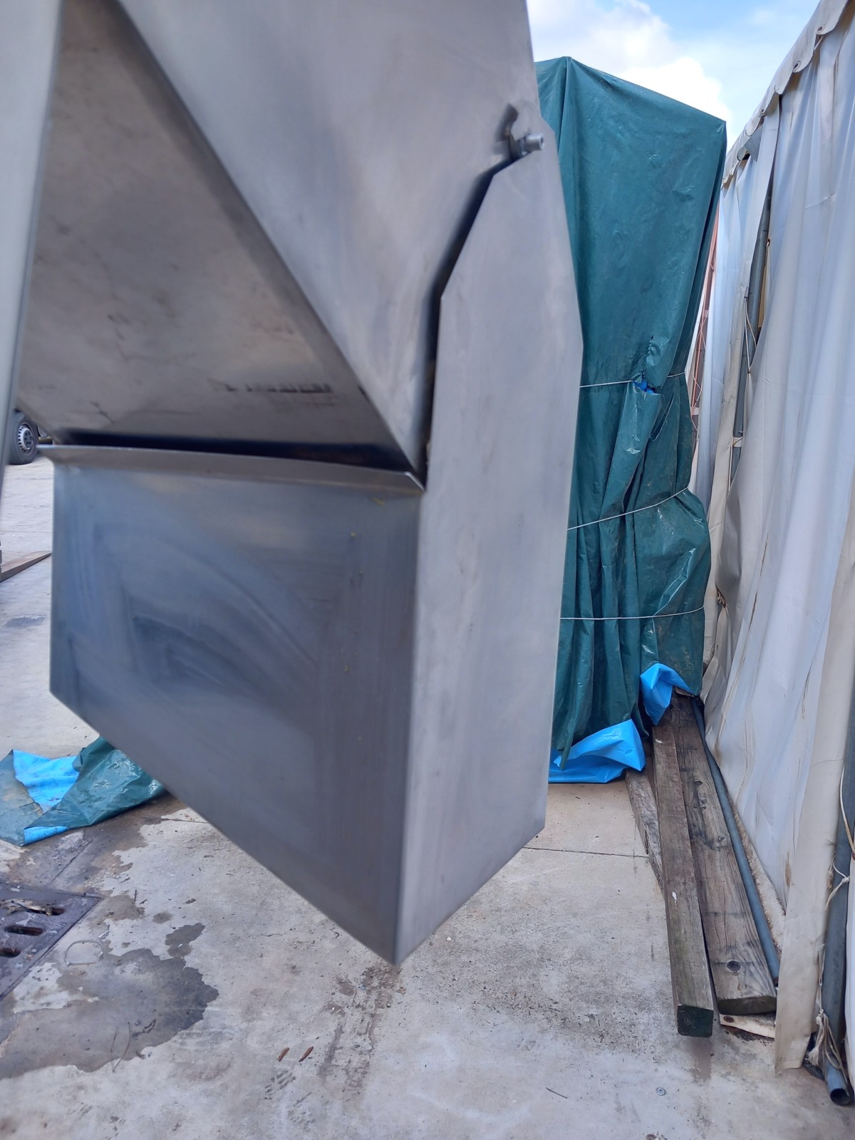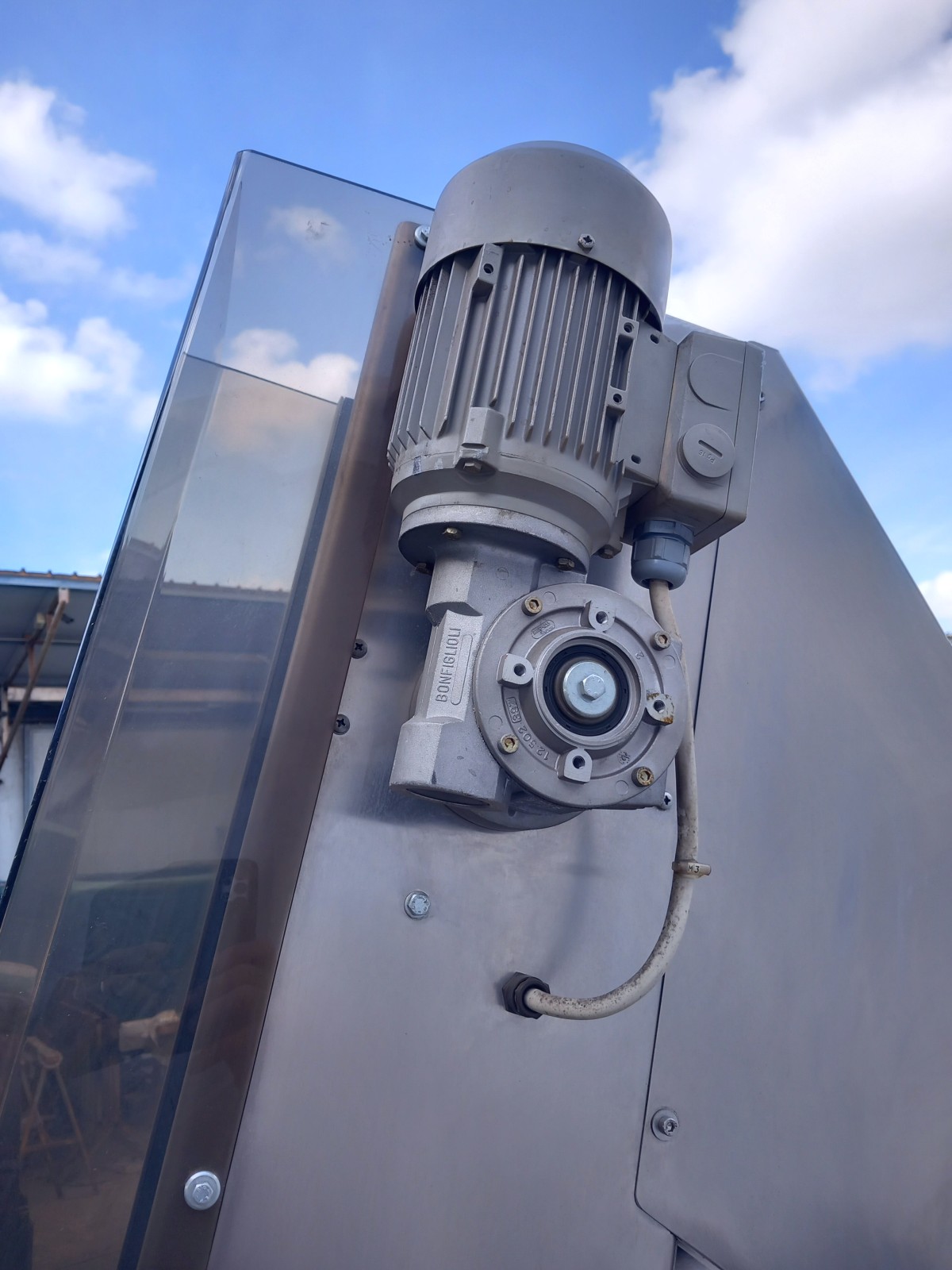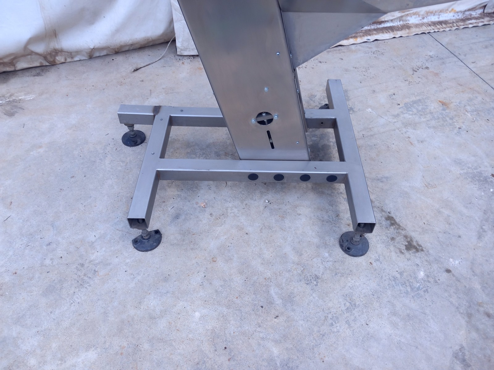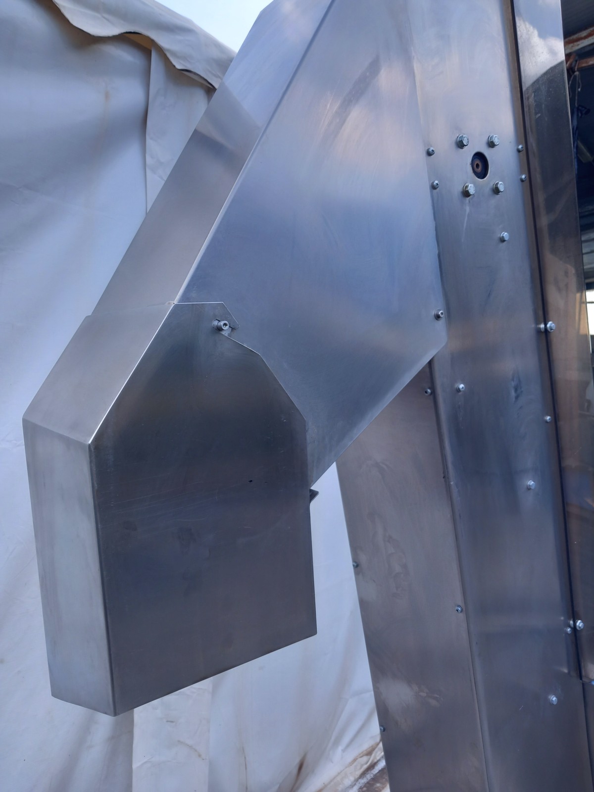 Edelstahl-Trichteraufzug, der den Transport von Material vom Trichter ĂŒber den Förderer bis zur Entladeöffnung ermöglicht. Der feste Trichter kann manuell befĂŒllt werden, dank seiner Höhe. Die Ladung wird angehoben, gruppiert und schlieĂlich gefördert. Der Trichter besteht aus Edelstahl und ist durch eine transparente Polycarbonat-Staubabdeckung geschĂŒtzt. Die ZufĂŒhrung erfolgt ĂŒber ein Polyurethanförderband, das aus einer Reihe von Schaufeln besteht, um das Bauteil bis zum Sortierpunkt anzuheben. Der Transportbereich sowie der Trichter sind ebenfalls durch eine transparente Staubschutzstruktur abgedeckt, die zudem den Bediener vor beweglichen Maschinenteilen schĂŒtzt. Die elektrische Anlage befindet sich in einem unteren Panel, das die Hauptsteuerungen einfach und klar zusammenfasst und die Motorsteuerung ermöglicht. Die hohe Vielseitigkeit ermöglicht die Umordnung und den Transport fĂŒr verschiedene Produktionslinien.