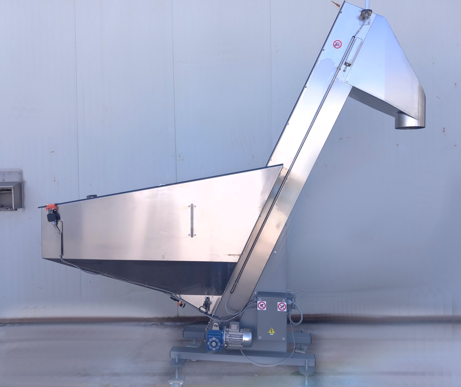 Der Trichterförderer besteht aus Edelstahl und ermöglicht einen sicheren und hygienischen Transport von Materialien vom Trichter zum Auslass. Der feste Trichter kann aufgrund seiner Höhe manuell beladen werden, was das Heben und Gruppieren der Last ermöglicht. Er ist mit einer transparenten Polycarbonat-Staubabdeckung ausgestattet, die sowohl den Schutz des Materials als auch des Bedieners gewährleistet. Der Polyurethanförderband verfügt über eine Reihe von Schaufeln, um die Komponente bis zum Sortierpunkt zu heben, während die transparente staubdichte Struktur die Betriebssicherheit gewährleistet. Das elektrische System ist in einem unteren Steuerkasten zentralisiert, der intuitive Befehle zur Motorsteuerung bietet. Die Vielseitigkeit des Förderers macht ihn für verschiedene Produktionslinien geeignet.