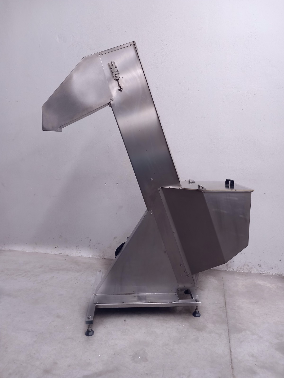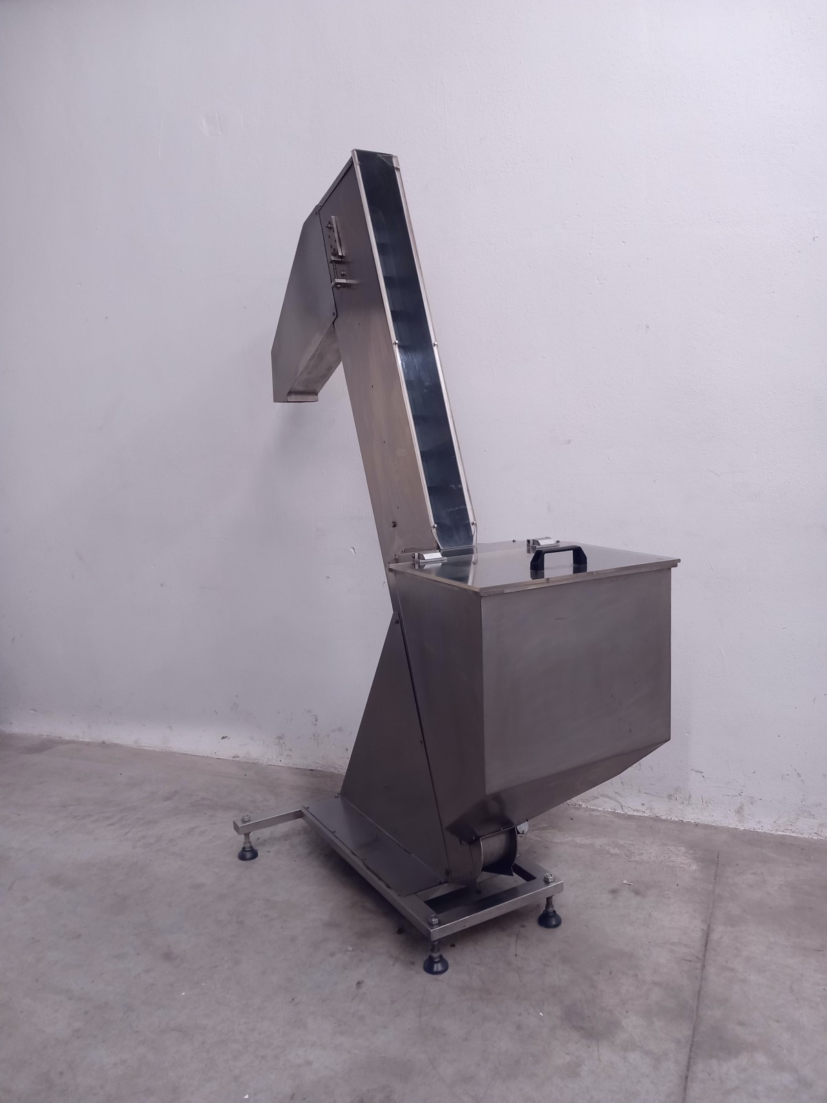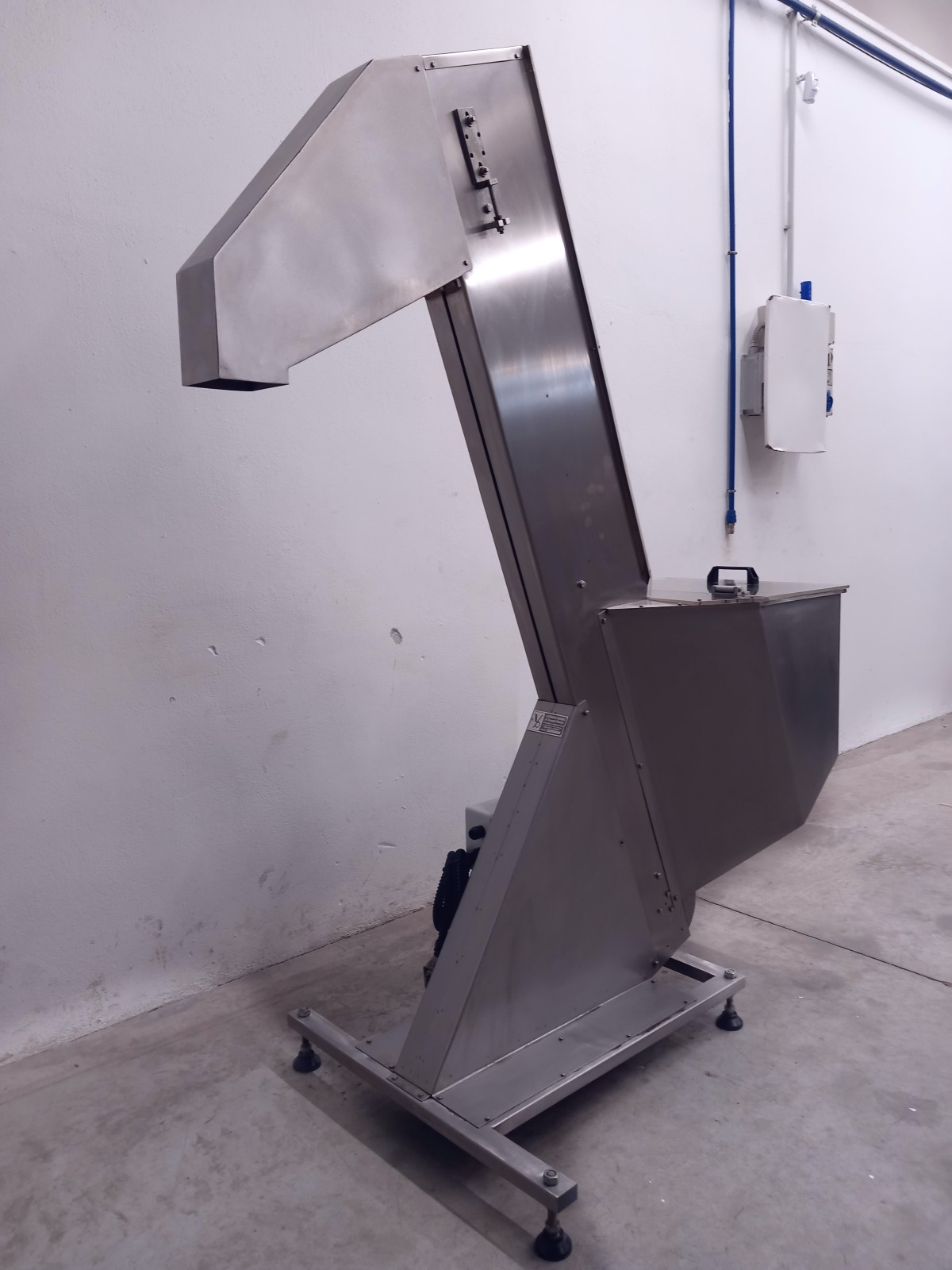 Hopper elevator made of stainless steel for transporting materials across various production sectors.