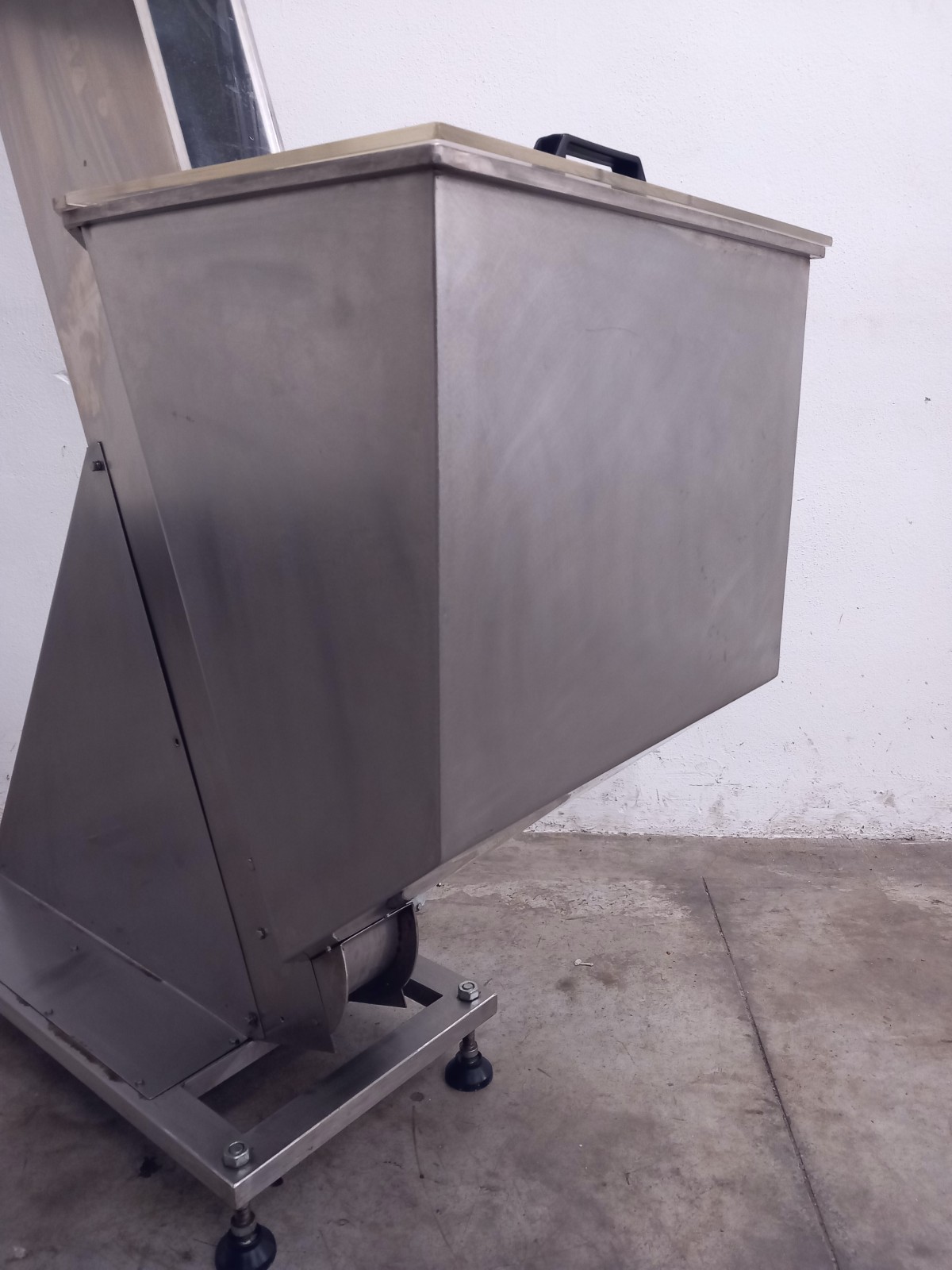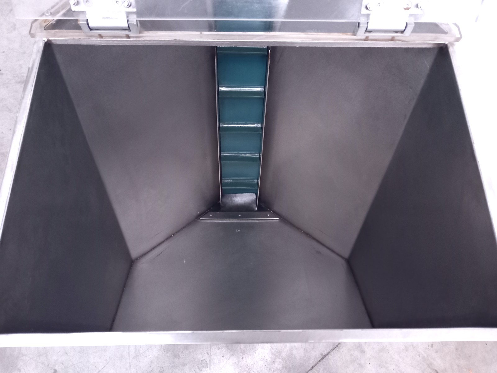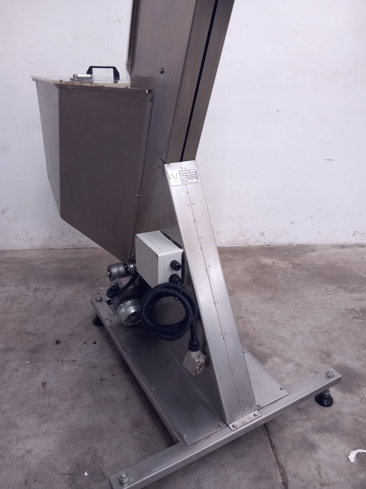 Hopper elevator made of stainless steel for transporting materials across various production sectors.