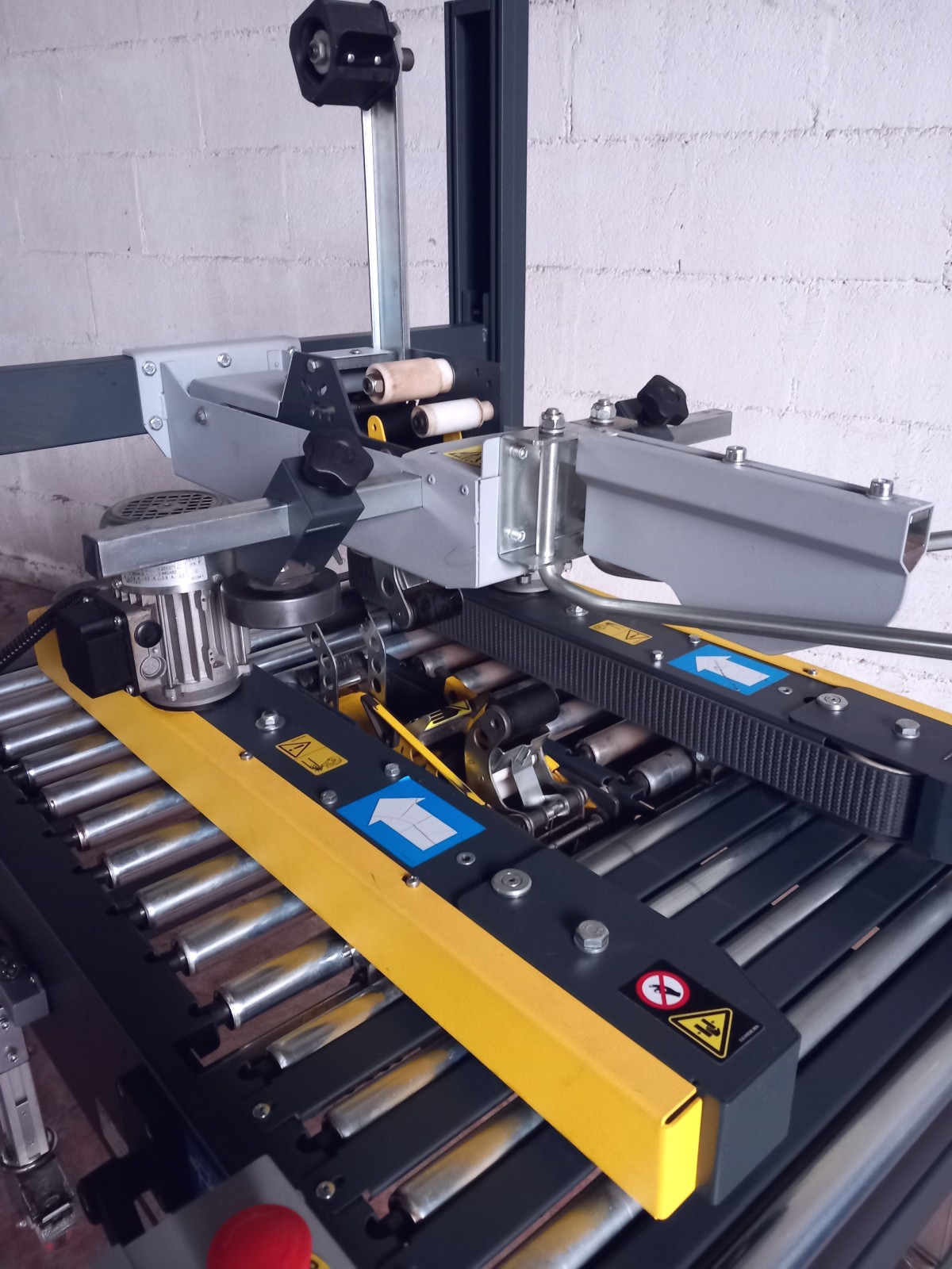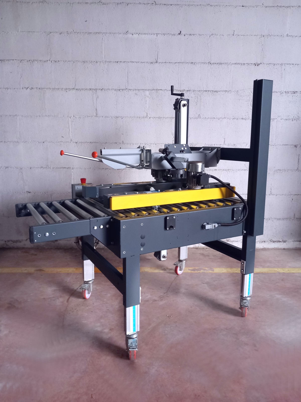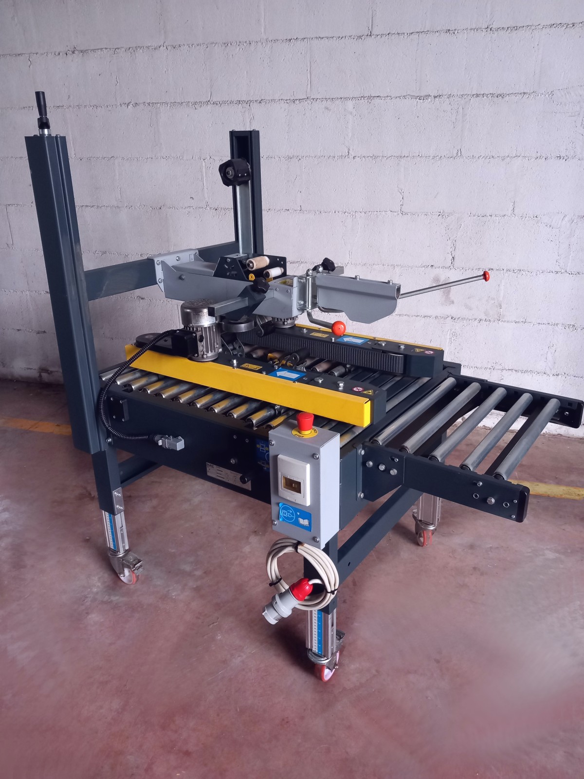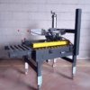 Halbautomatische Maschine zum Verschließen von Kartons mit Klebeband.
