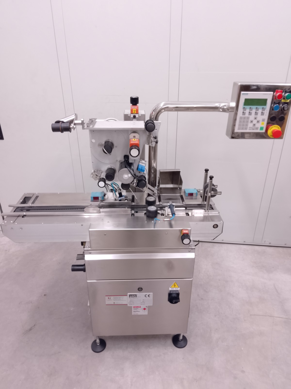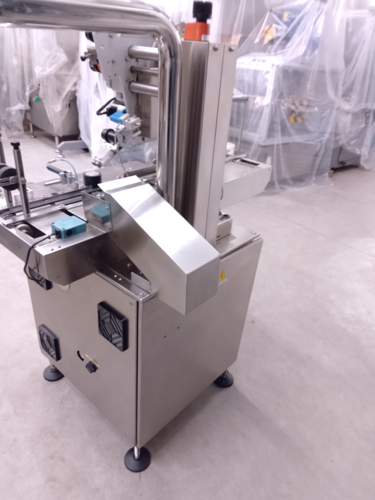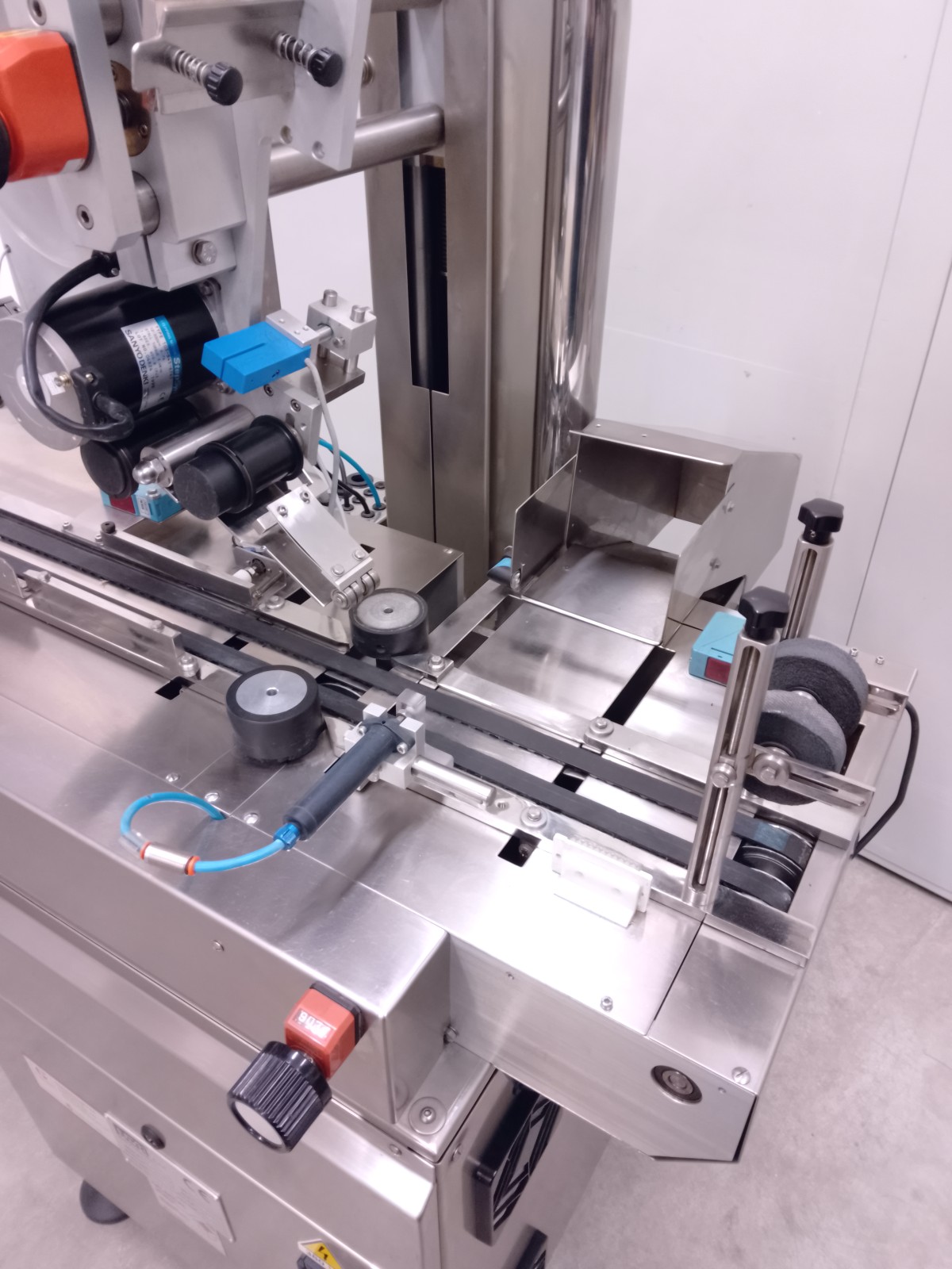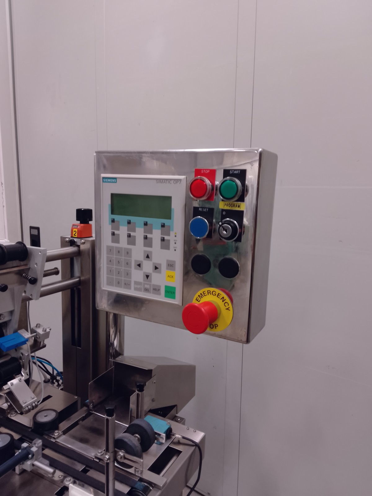 La machine à étiqueter SL 400 est fabriquée en acier inoxydable de haute qualité et répond aux normes de sécurité européennes, comme l’indique le marquage CE. Conçue pour l’application automatique d’étiquettes sur des produits transportés horizontalement, elle dispose d’un groupe d’étiquetage réglable et d’une interface HMI (Interface Homme-Machine) numérique pour une utilisation intuitive. Le poids opérationnel de la machine est de 280 kg. Le système électrique comprend un transformateur d’isolement FAEM MOD. 6266 pour gérer les tensions auxiliaires nécessaires.