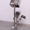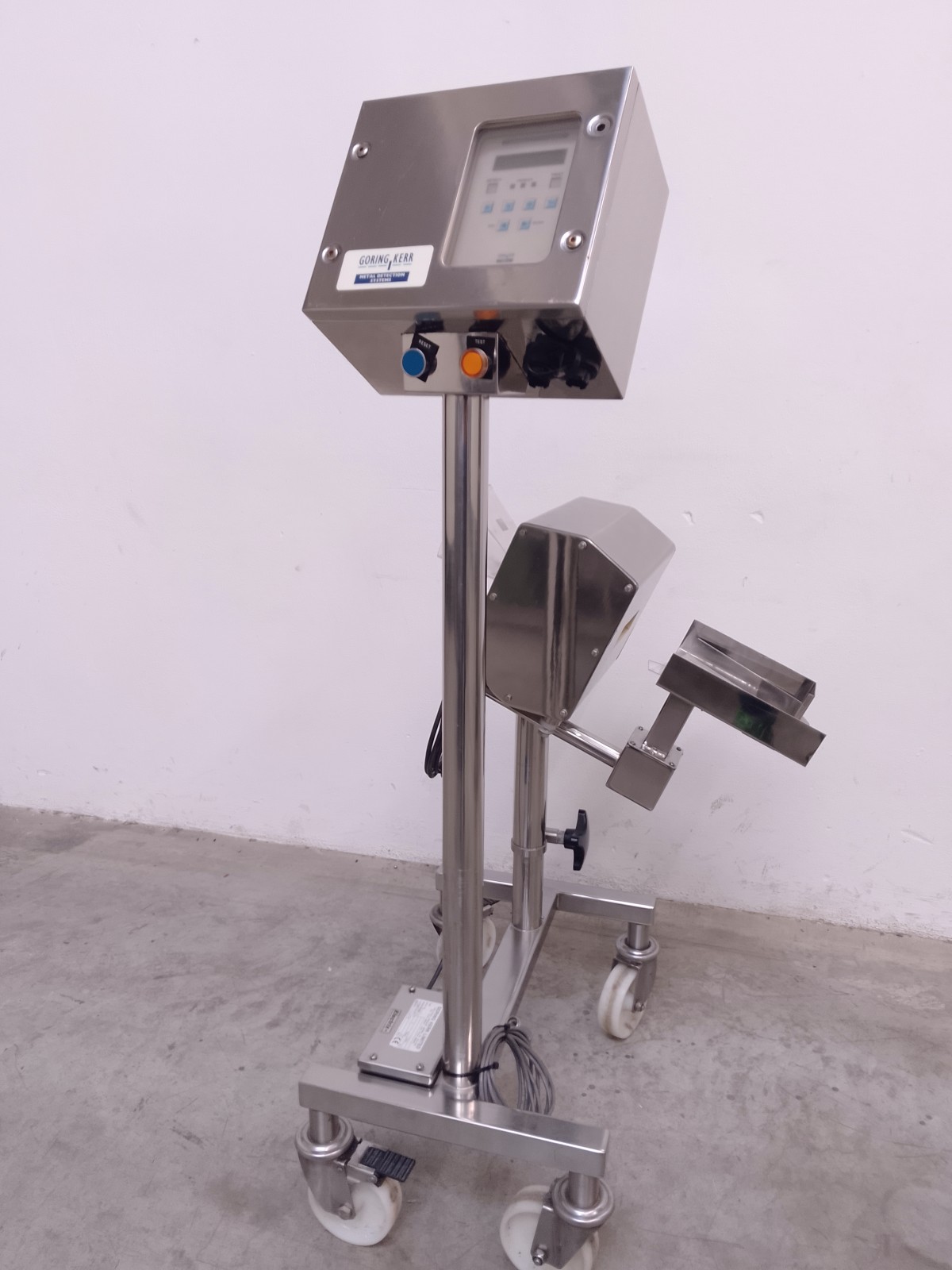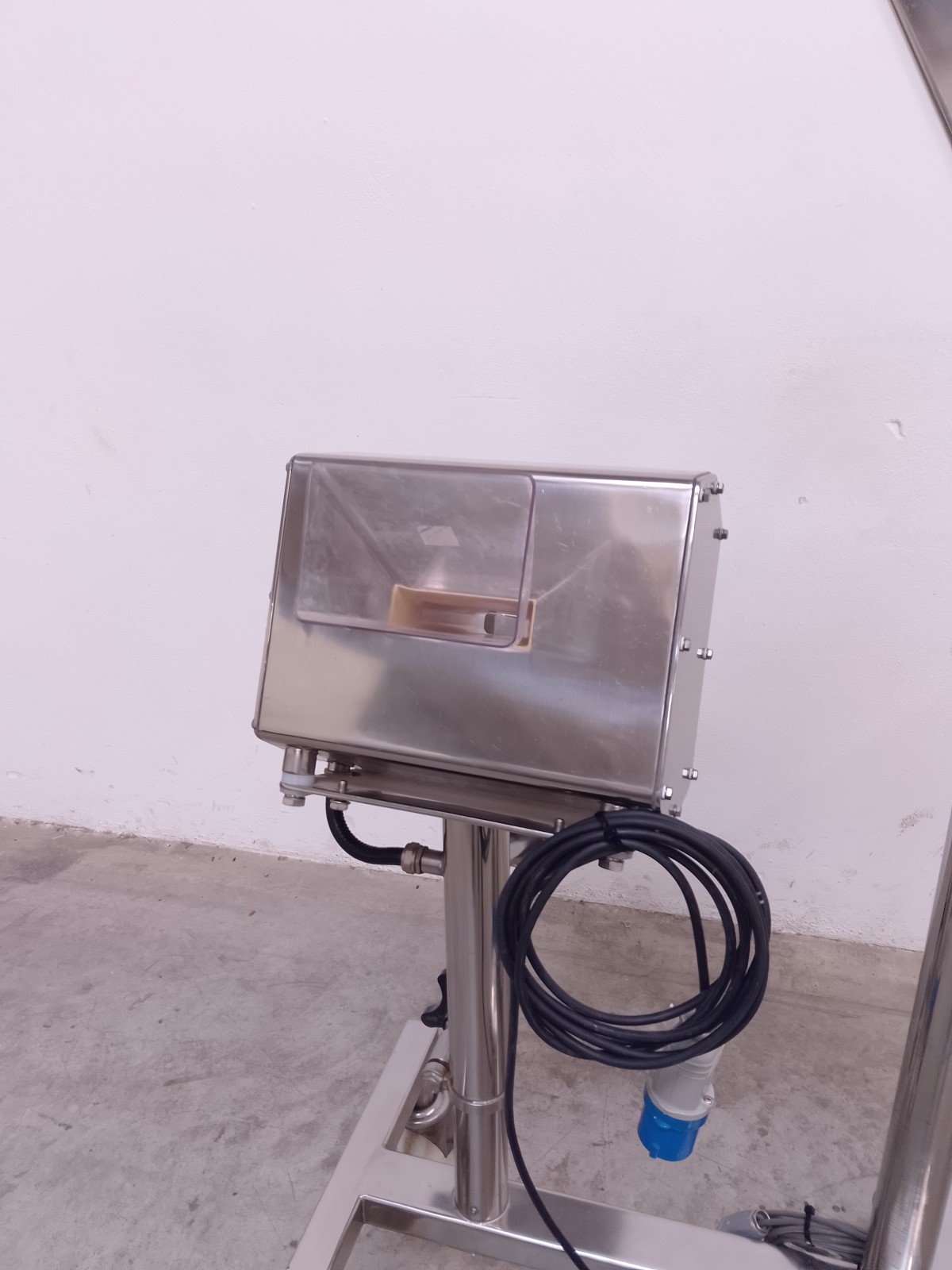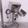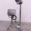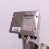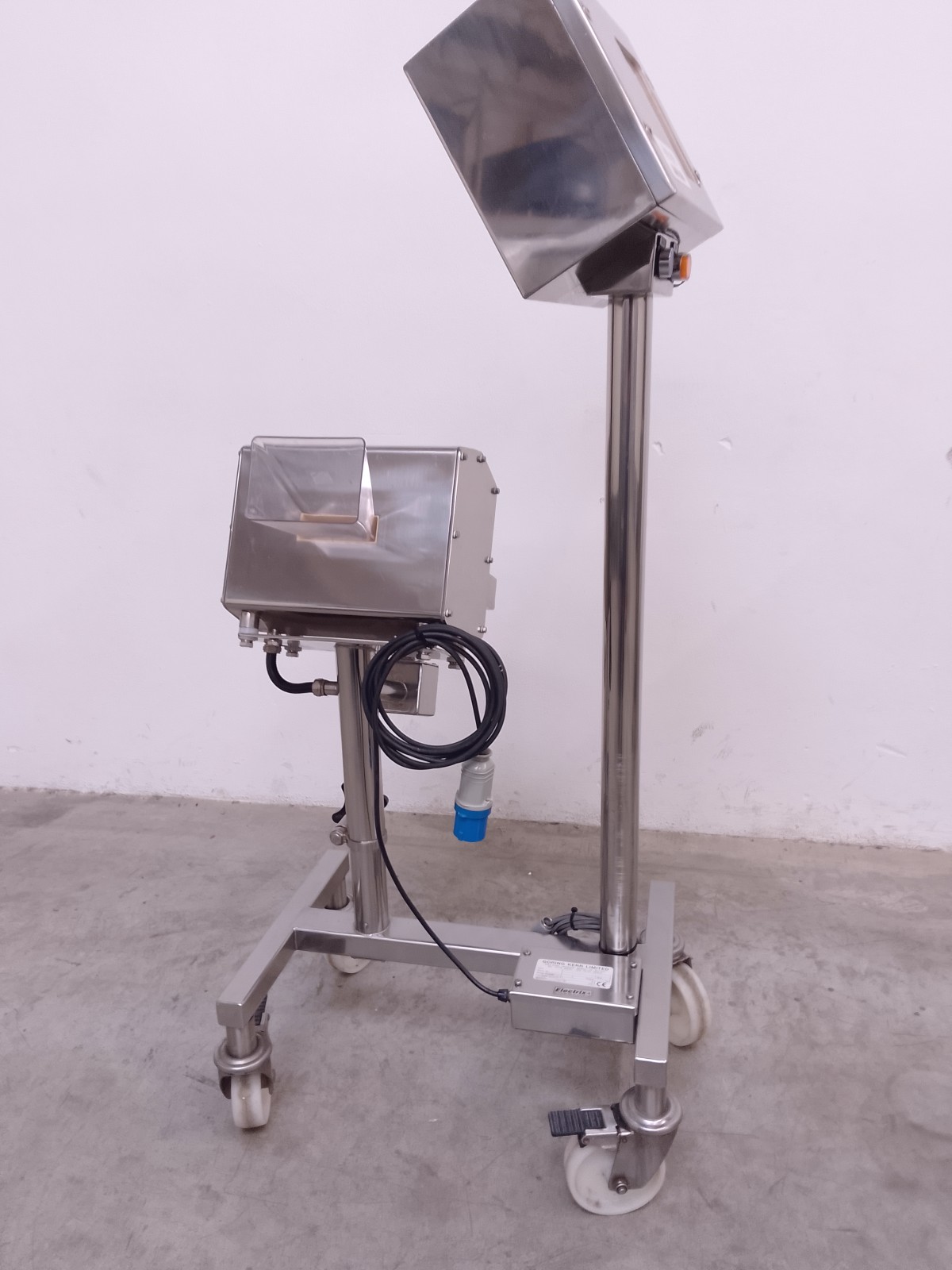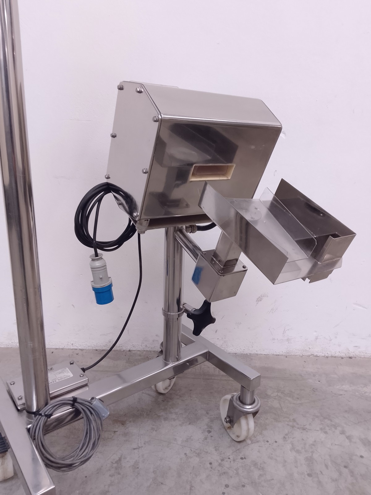 The inspection system is designed for detecting metallic contaminants in products transported on production lines. The stainless steel structure ensures durability and resistance. Mounted on a mobile cart with lockable wheels, it facilitates positioning and integration in various locations. The system includes a main unit (metal detector) and a control unit with advanced electronics, LCD display, and control buttons for navigation. The detection sensor is height adjustable and has a sorting/expulsion system to divert contaminated products into a collection container. Visualization features include counting passed products, counting rejects, and indicating sensitivity levels, making the device ideal for monitoring quality and safety.