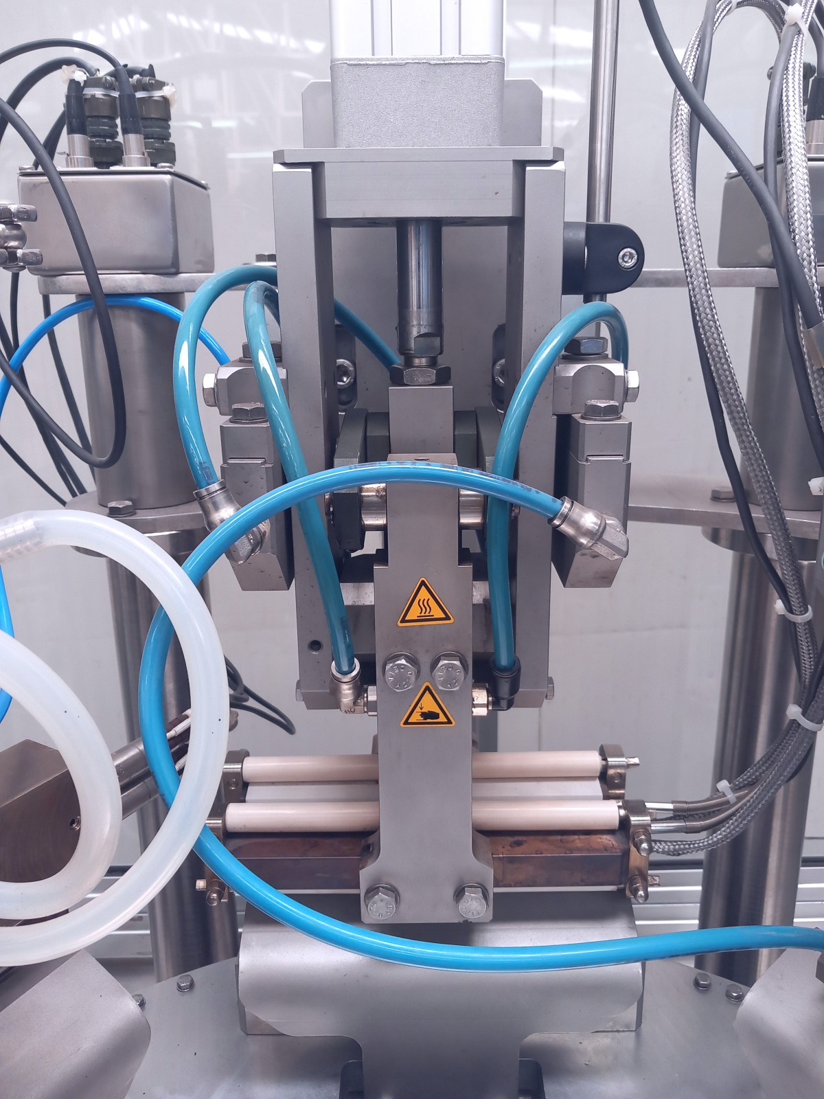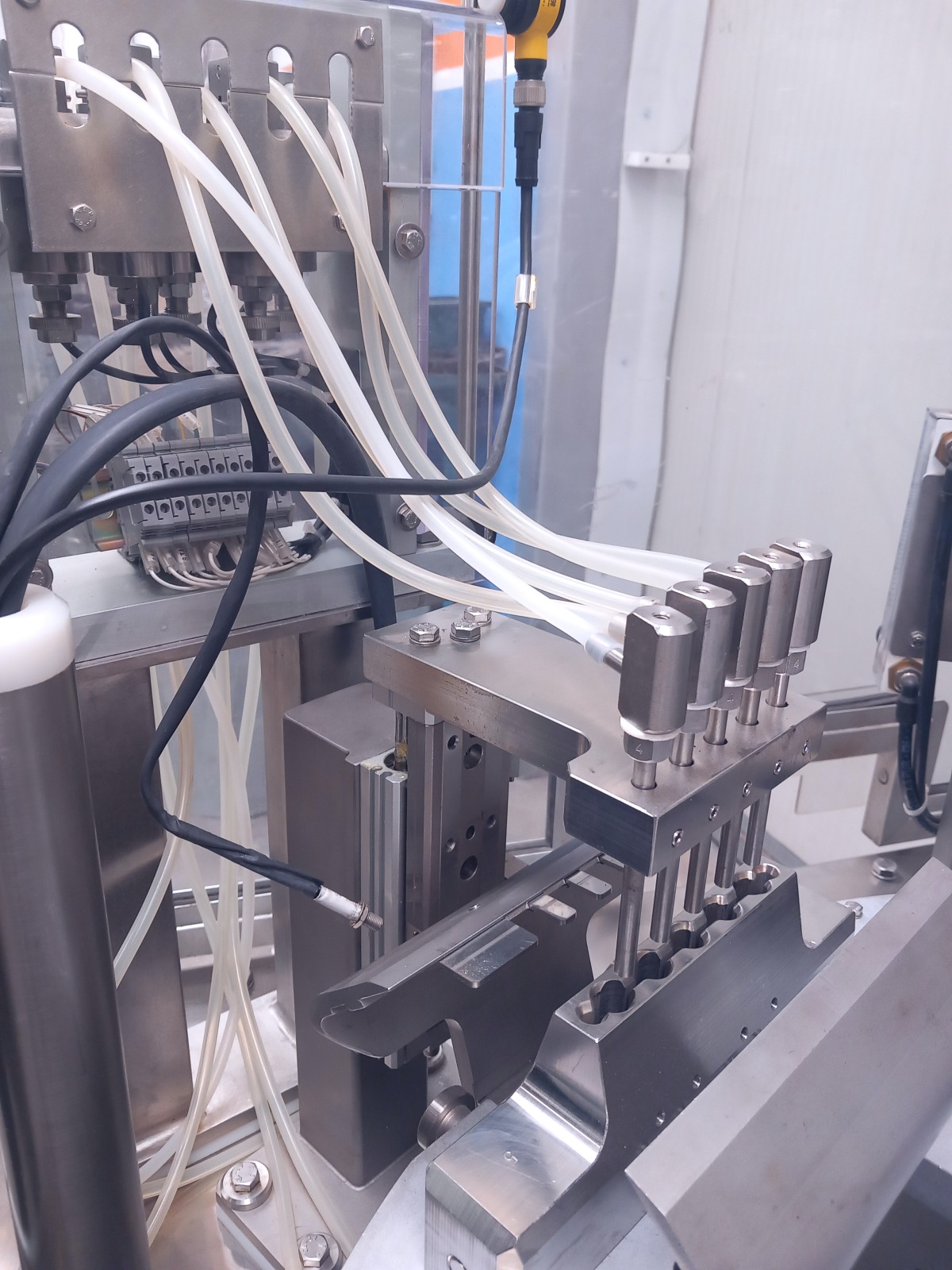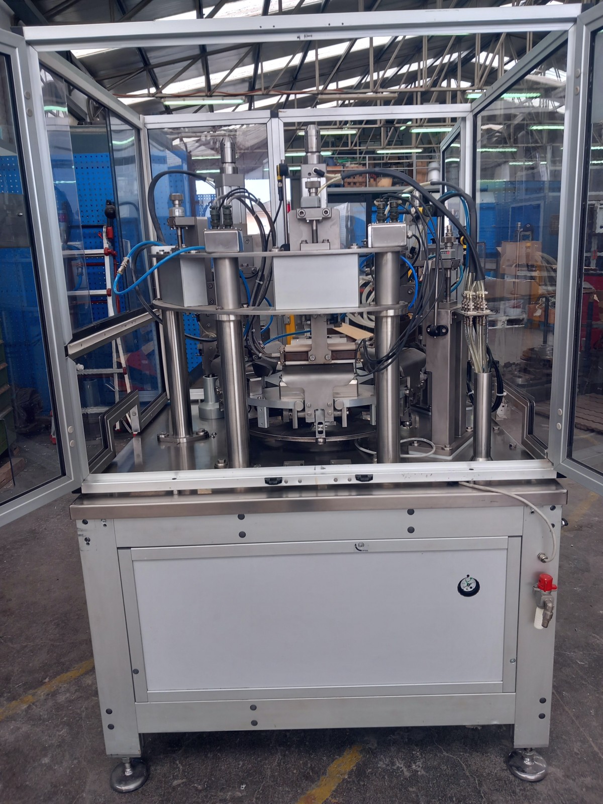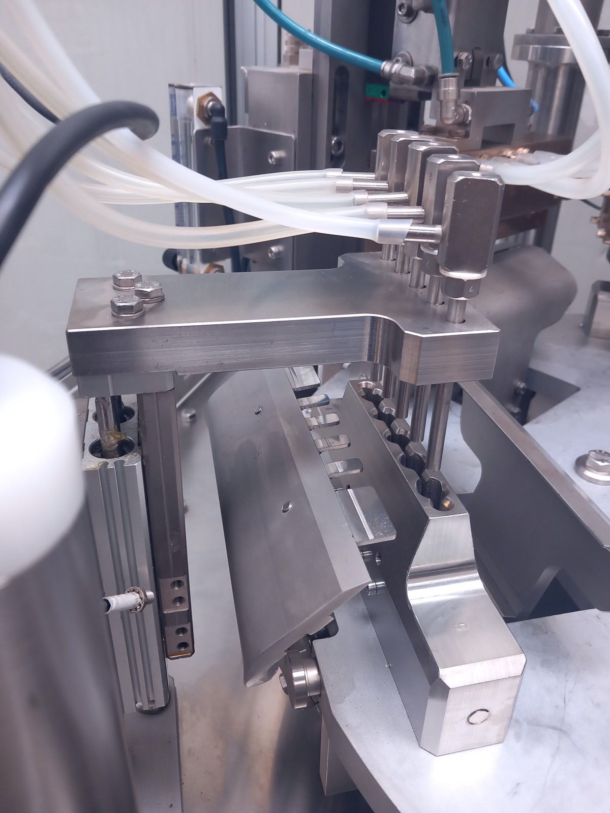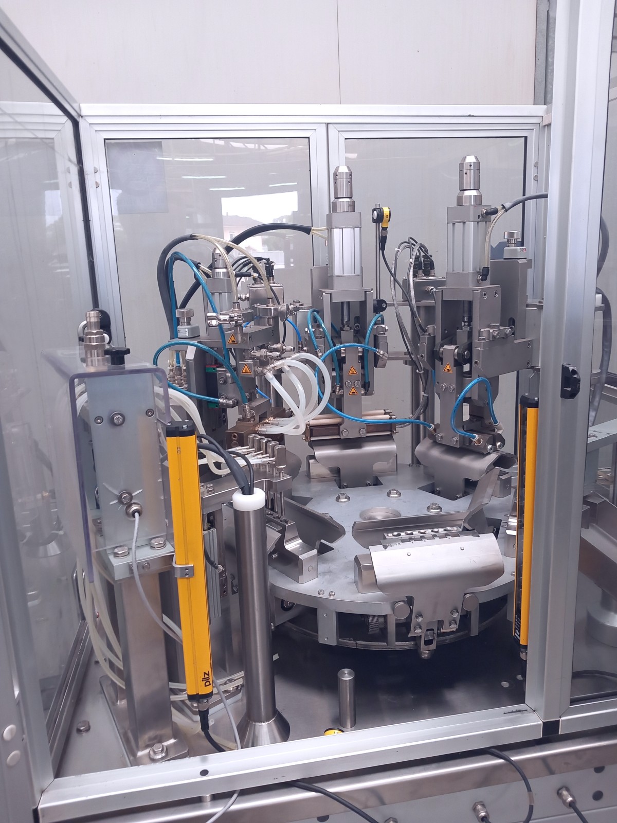 The ‘6-station Monodose’ is designed to perform dosing, filling, and sealing of single-dose vials. Constructed from AISI 304 stainless steel, it features a monoblock equipped with five syringes and filling needles. The machine includes various constituent groups, such as the working star, the preheating group, and the sealing group. The production capacity varies depending on the product, with the currently installed format for 6 strips of 5 single-dose vials. The preheating system uses hot air to enhance the sealing of the strips via electric resistors and Teflon films. The operation is managed by a PLC to ensure the sequential execution of operations. Two optional formats for diameters of 11 mm and 13 mm complete its functionalities.