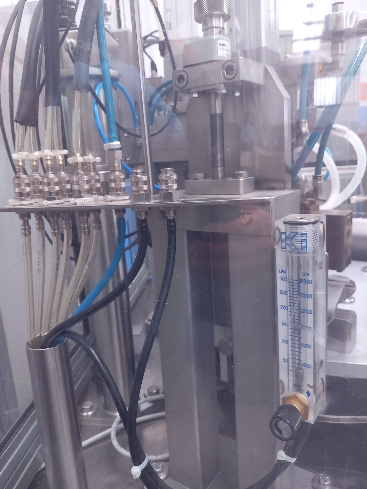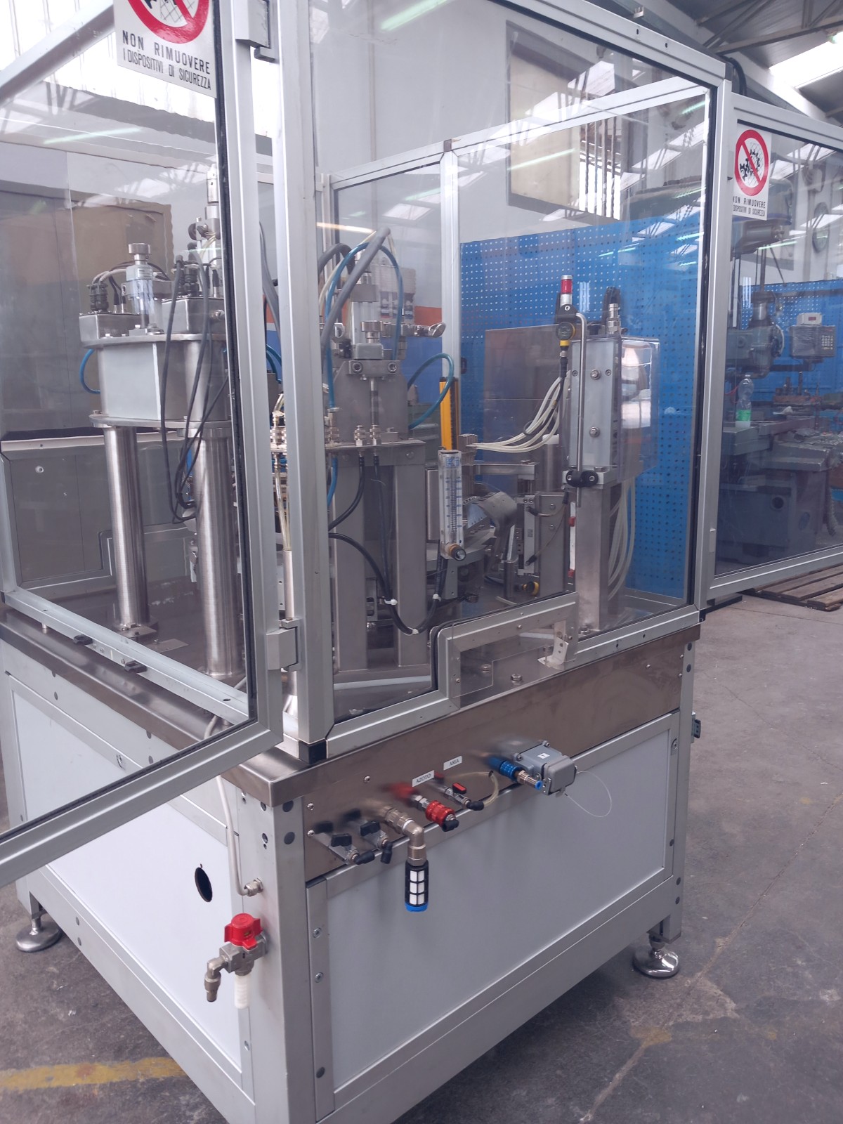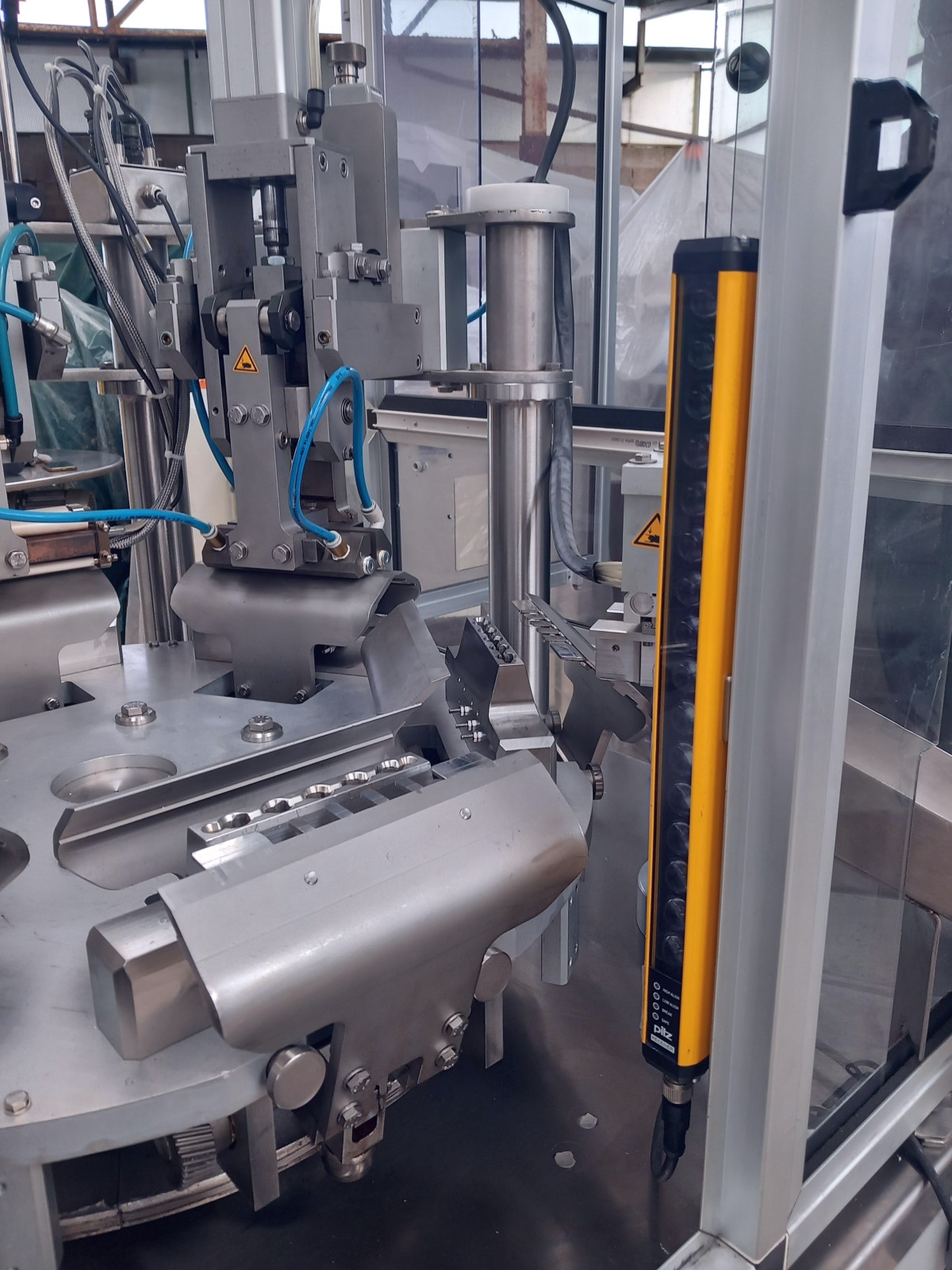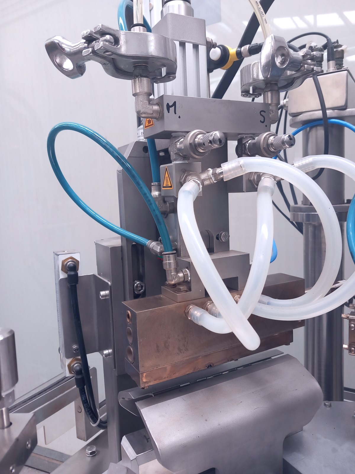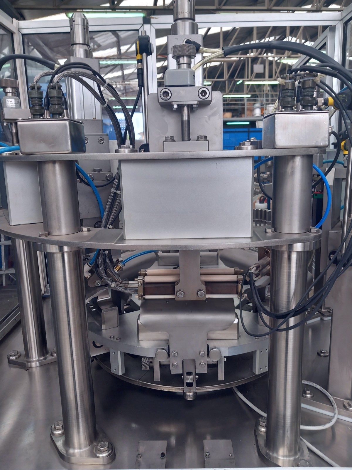 The ‘6-station Monodose’ is designed to perform dosing, filling, and sealing of single-dose vials. Constructed from AISI 304 stainless steel, it features a monoblock equipped with five syringes and filling needles. The machine includes various constituent groups, such as the working star, the preheating group, and the sealing group. The production capacity varies depending on the product, with the currently installed format for 6 strips of 5 single-dose vials. The preheating system uses hot air to enhance the sealing of the strips via electric resistors and Teflon films. The operation is managed by a PLC to ensure the sequential execution of operations. Two optional formats for diameters of 11 mm and 13 mm complete its functionalities.