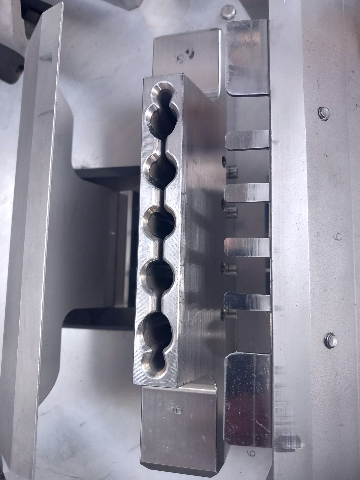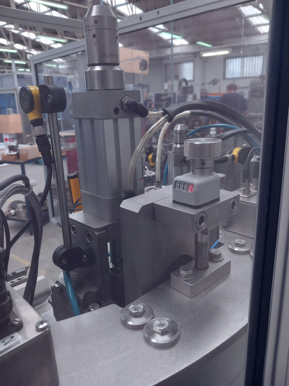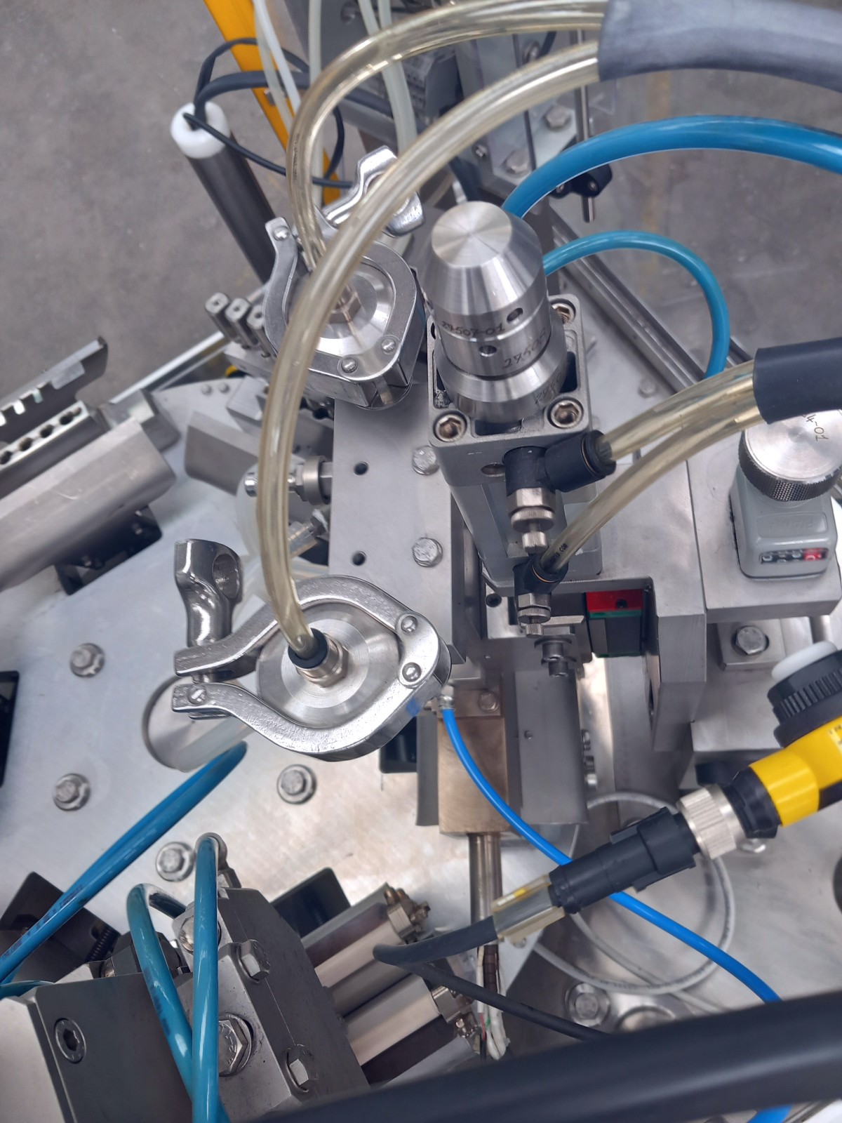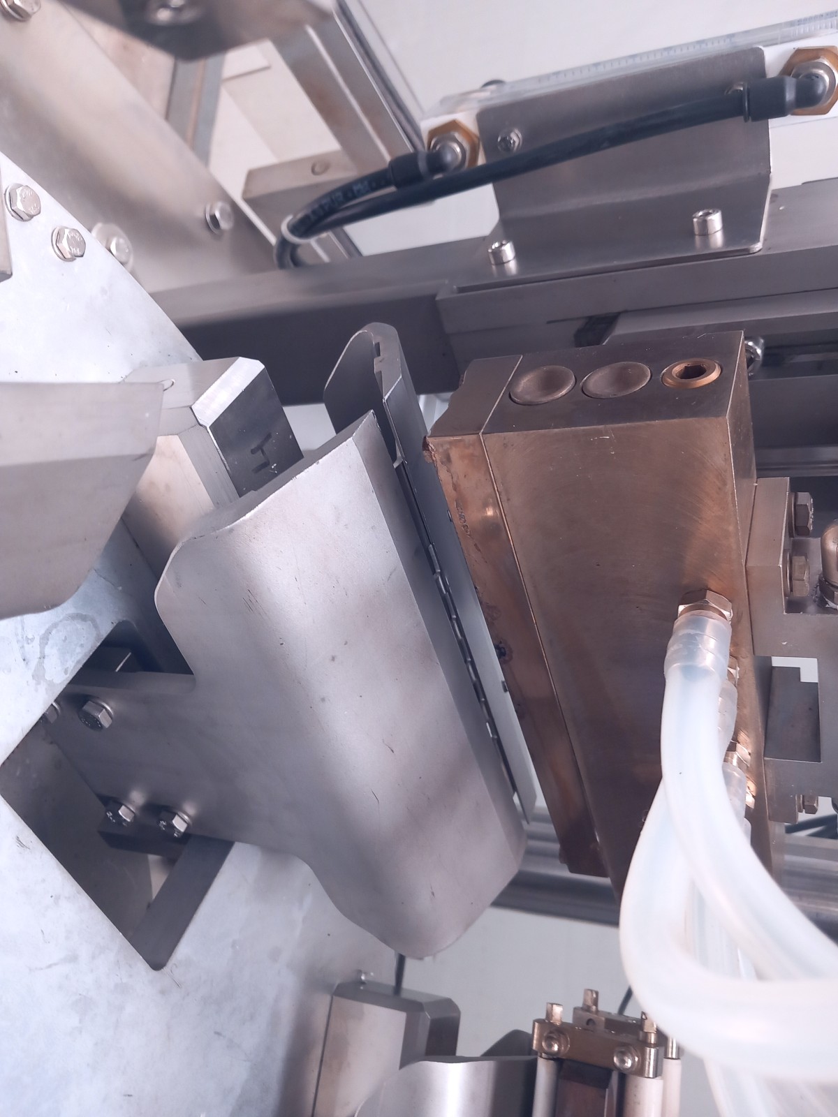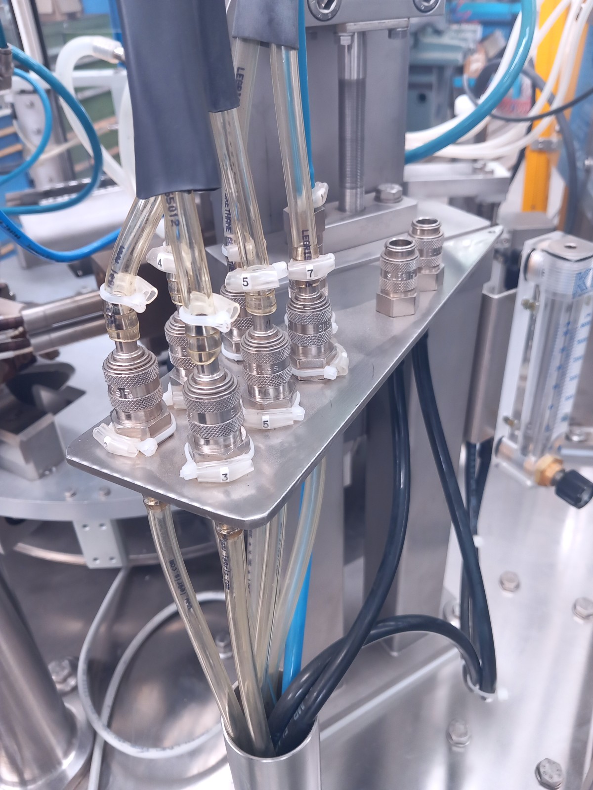 The ‘6-station Monodose’ is designed to perform dosing, filling, and sealing of single-dose vials. Constructed from AISI 304 stainless steel, it features a monoblock equipped with five syringes and filling needles. The machine includes various constituent groups, such as the working star, the preheating group, and the sealing group. The production capacity varies depending on the product, with the currently installed format for 6 strips of 5 single-dose vials. The preheating system uses hot air to enhance the sealing of the strips via electric resistors and Teflon films. The operation is managed by a PLC to ensure the sequential execution of operations. Two optional formats for diameters of 11 mm and 13 mm complete its functionalities.