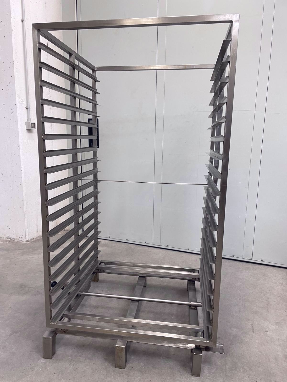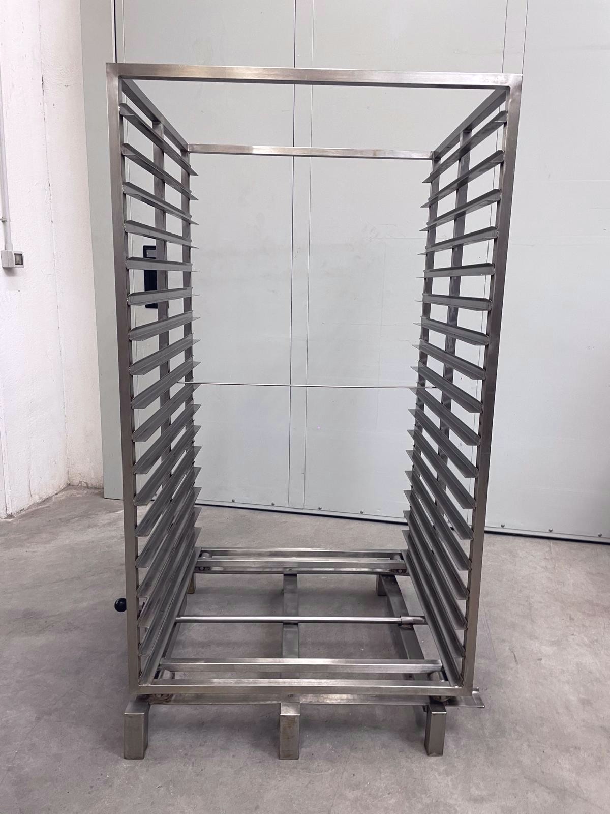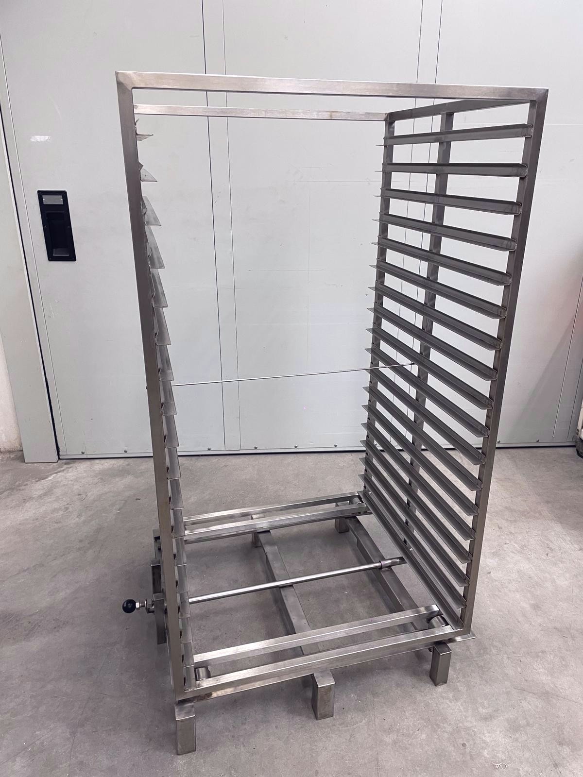 Designed for cooking, drying, or thermal treatment applications in industrial/food settings. The full-bottom racks feature reinforced perimeter edges to ensure stability and durability during the production cycle. The carts, also made of stainless steel, are equipped with multiple side guides for the orderly accommodation of the racks, a robust structure, and a handling system that allows easy insertion and extraction within ovens. This combination provides a complete, functional, and hygienically suitable solution designed to optimize load management and operational efficiency in thermal processes.