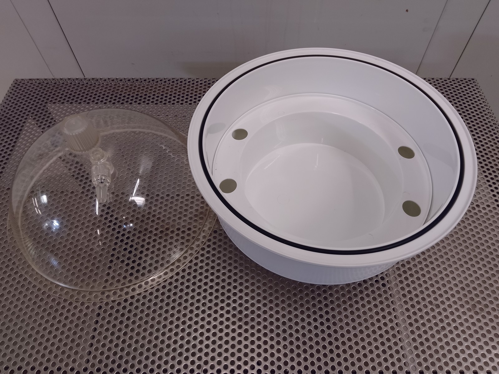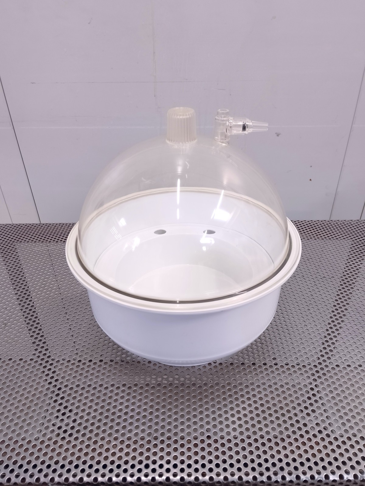 High-strength vacuum dryer, made of Polypropylene (PP) with a transparent, anti-implosion Polycarbonate (PC) dome. Neoprene/CK O-Ring for airtight sealing, capable of maintaining a maximum vacuum of -740 mm Hg. Designed for leak test procedures with a check and vent valve for 8-10 mm tubes.