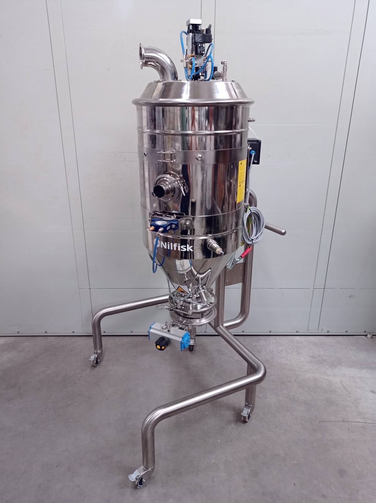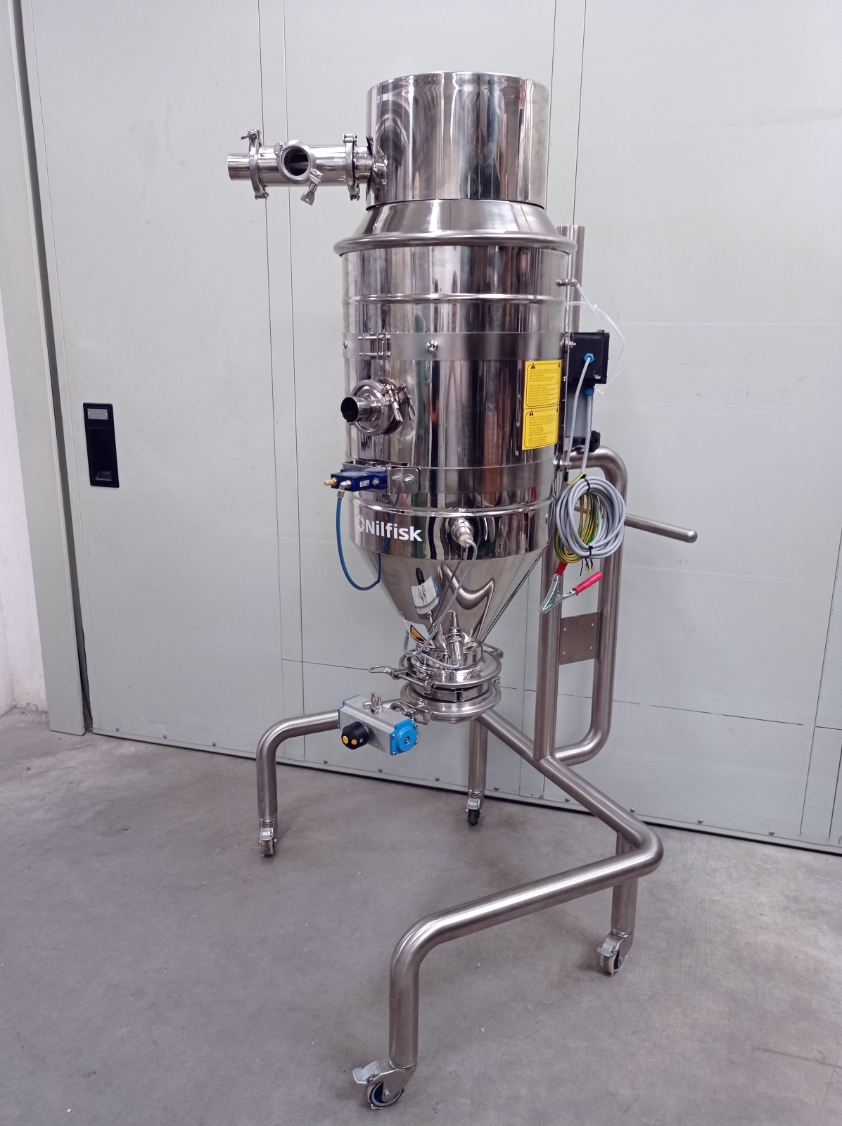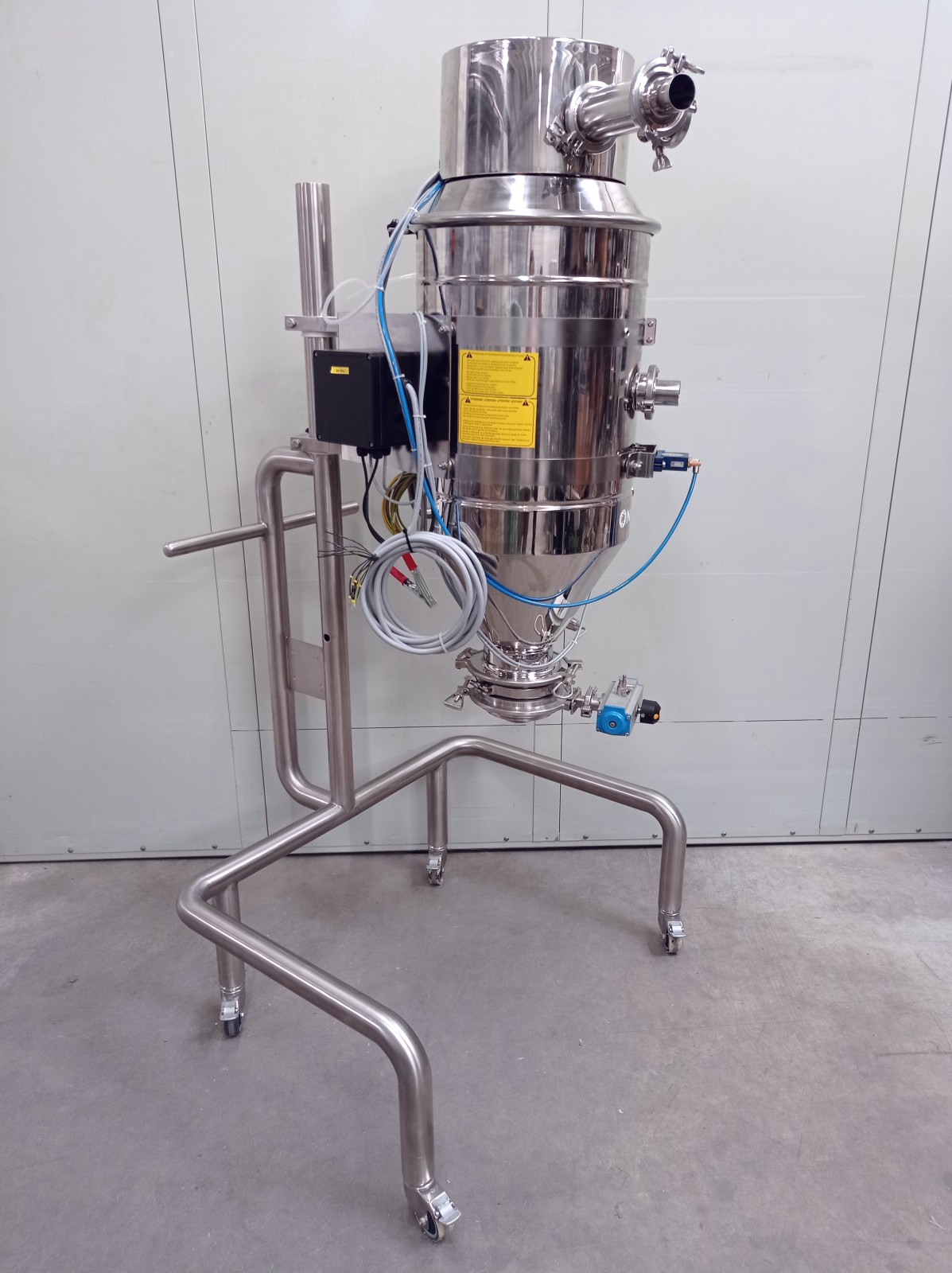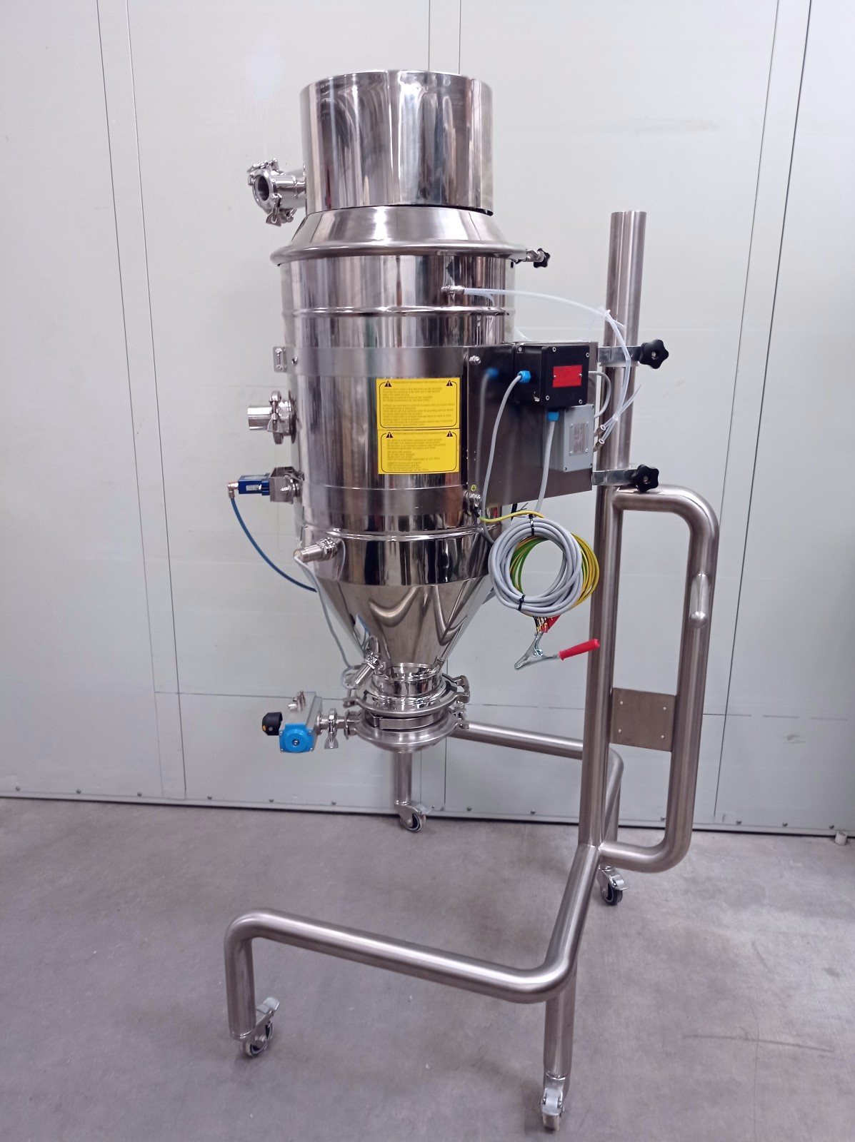 Pneumatic transport is a method by which solid materials can be transported by dragging bulk solids in an air system within a pipeline. By using a vacuum pump to remove air from a pipeline, a negative pressure is established. Positioning a nozzle in a particulate material, incoming air will carry or push the particles inside and along the piping system. This type of system completely contains the transported material, resulting in a safe and hazard-free transfer of bulk materials. Additionally, the system can be used for storage, recovery, and measurement of a product with applications in many sectors. The unit is particularly suitable for the food and pharmaceutical industries as it is made of polished stainless steel. Air/electrovalve powered.