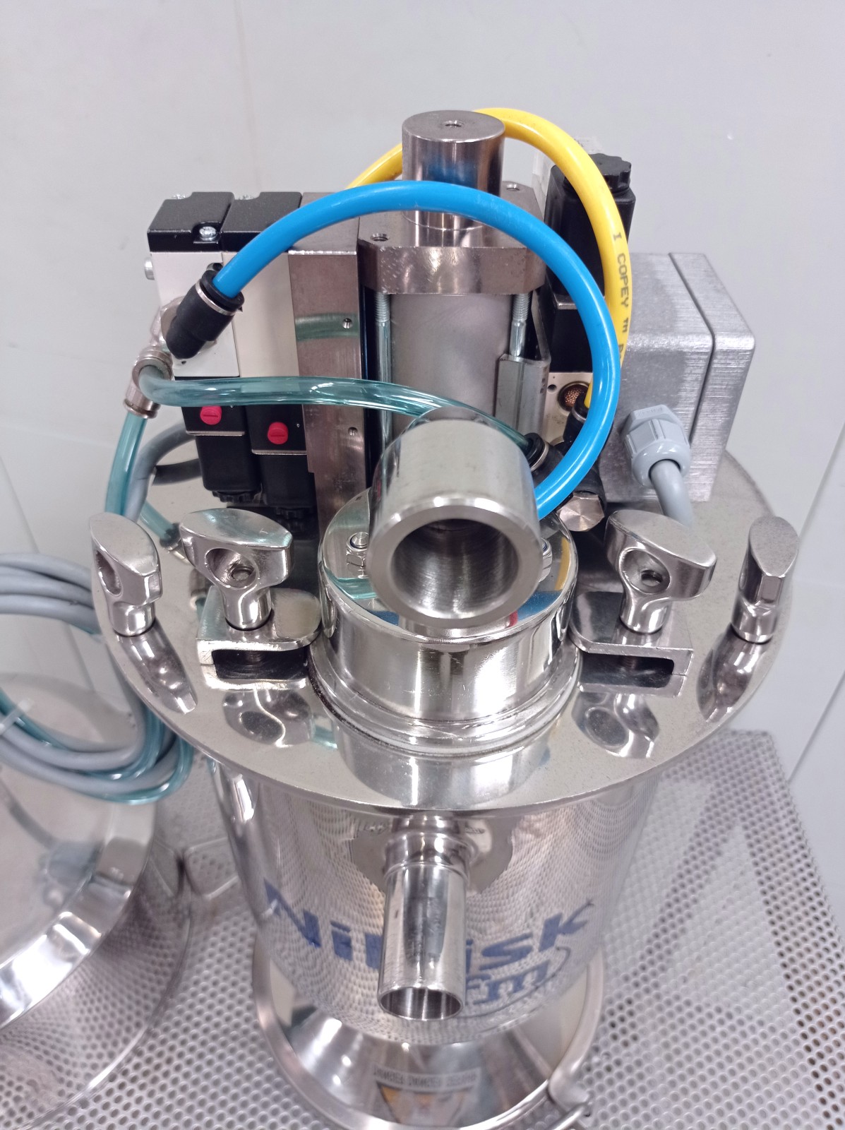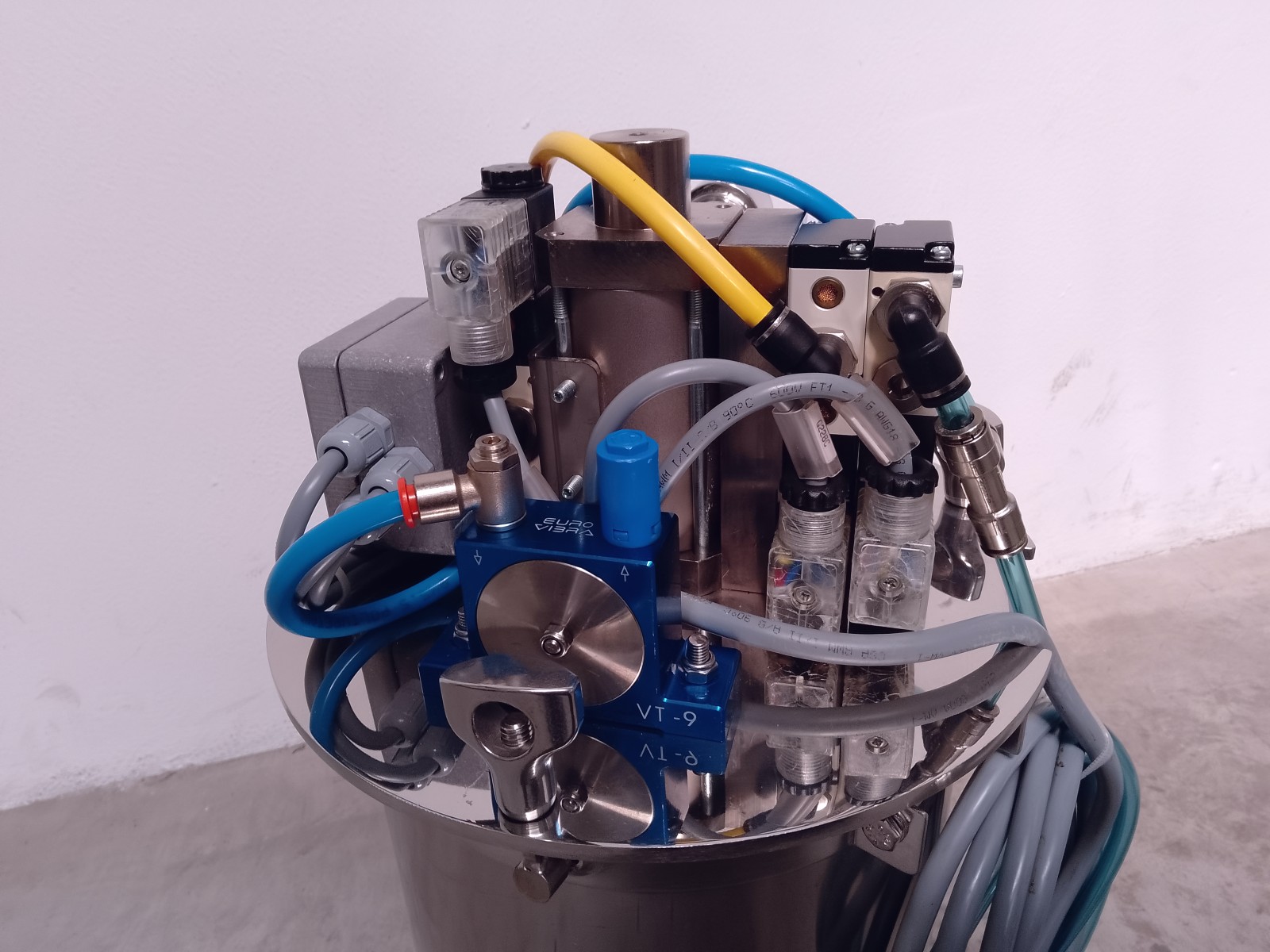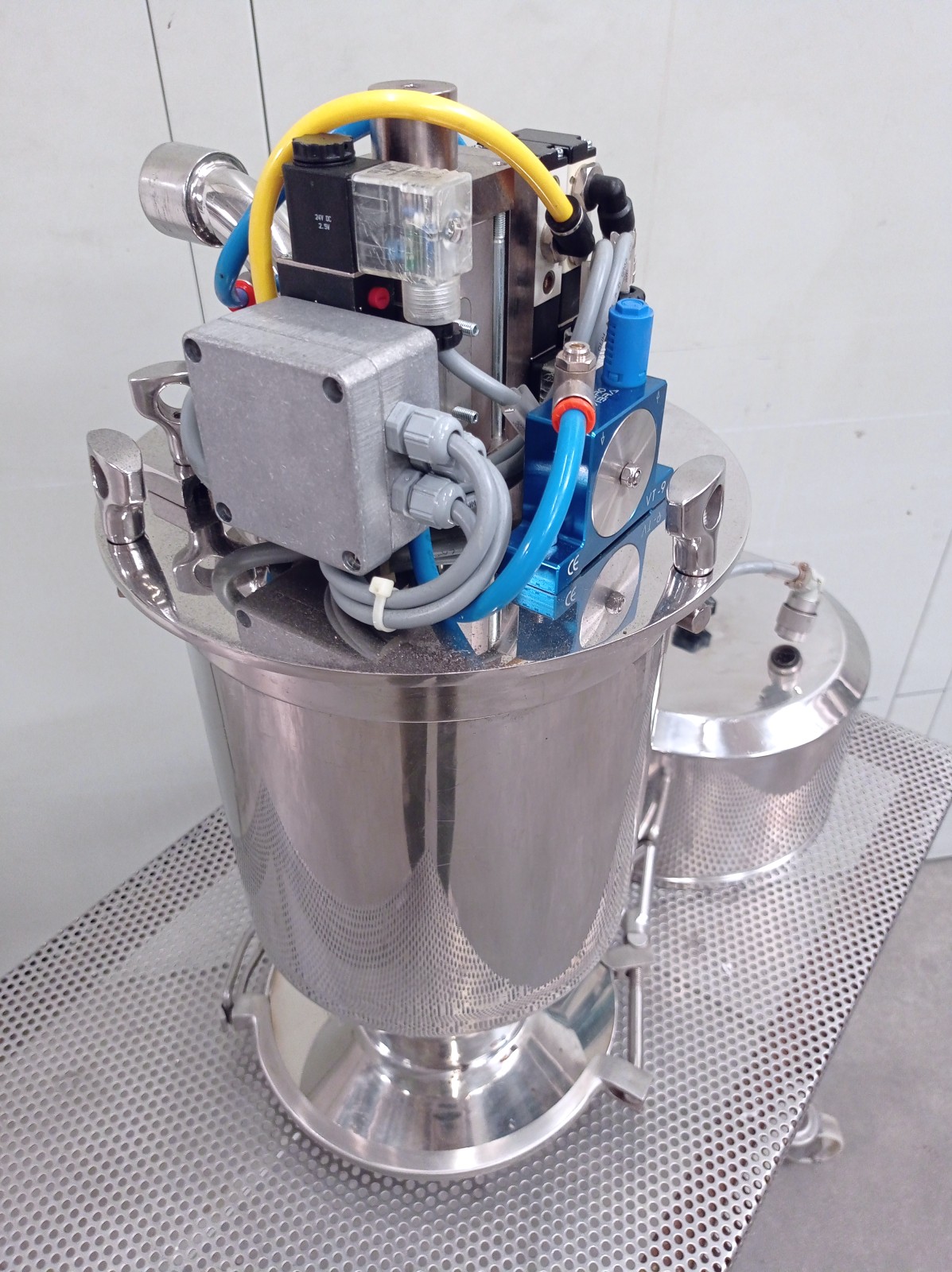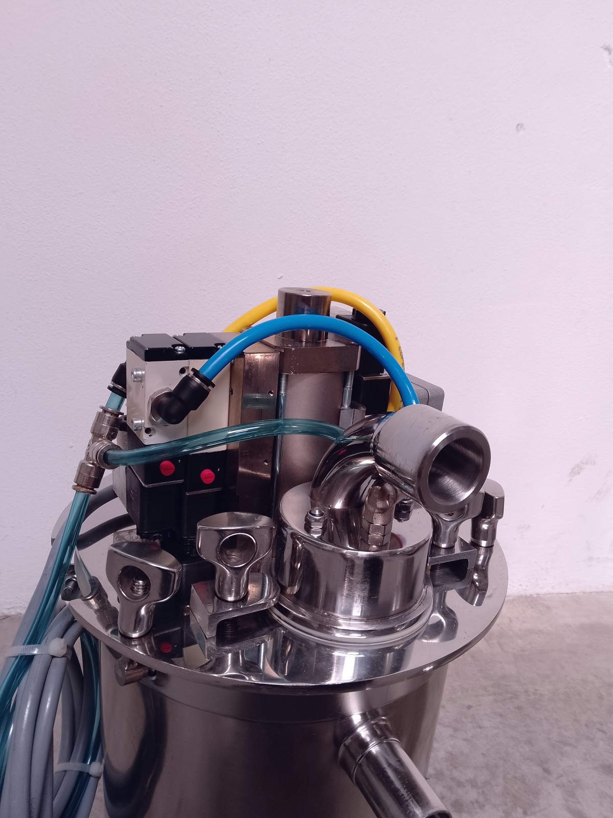 Pneumatic transport is a method by which solid materials can be transported by dragging the bulk solid in a system of air within a piping system. Using a vacuum pump to remove air from a pipe creates a negative pressure. By placing a nozzle in a particulate material, the incoming air will carry or push the particles into and along the piping system. This type of system completely contains the transported material, resulting in safe and non-hazardous transport of bulk materials. Furthermore, the system can be used for storage, recovery, and measurement of a product with applications in many sectors. The unit is particularly suitable for the food and pharmaceutical industries as it is made of polished stainless steel. Air/electrical valve feed.