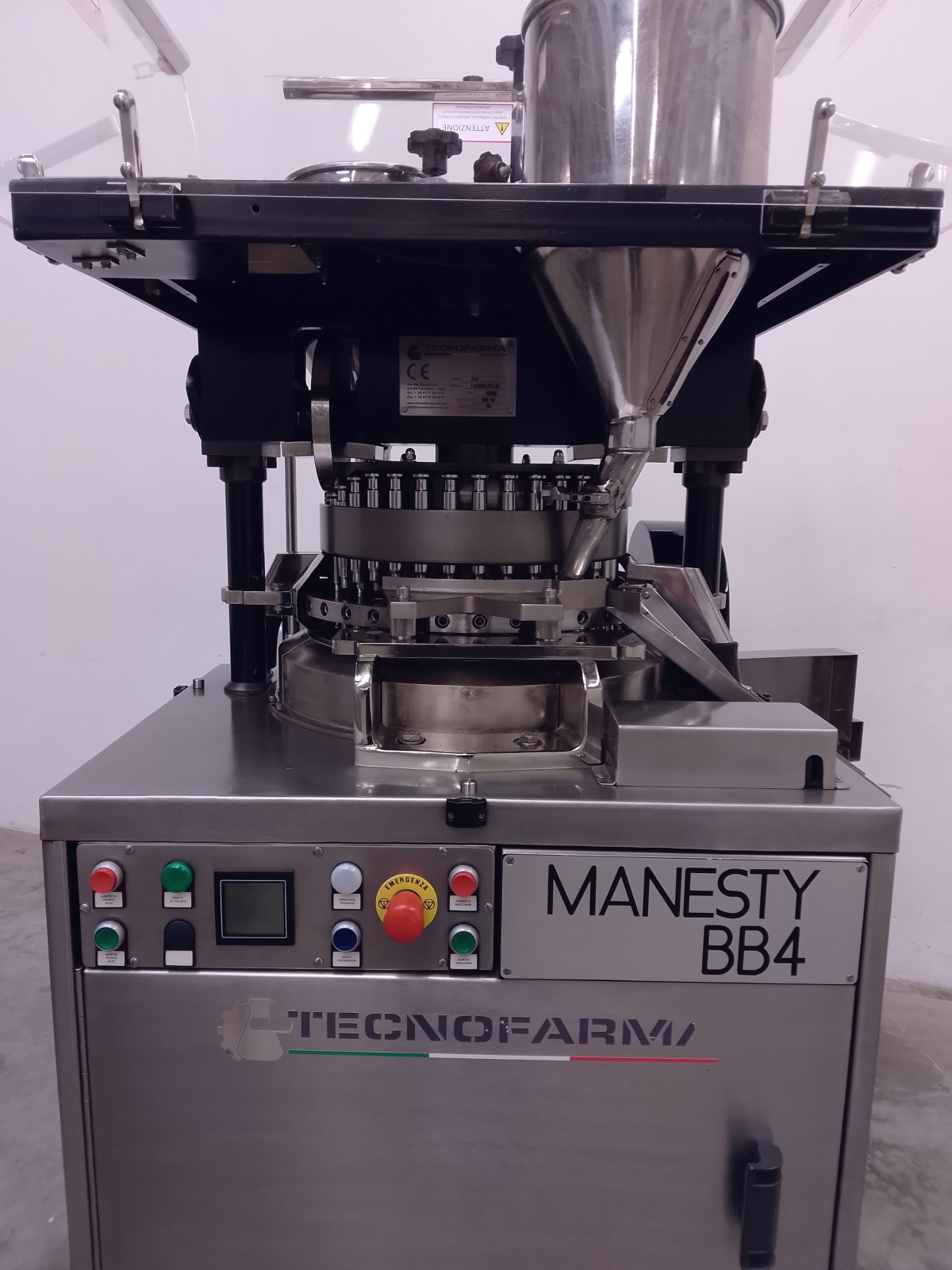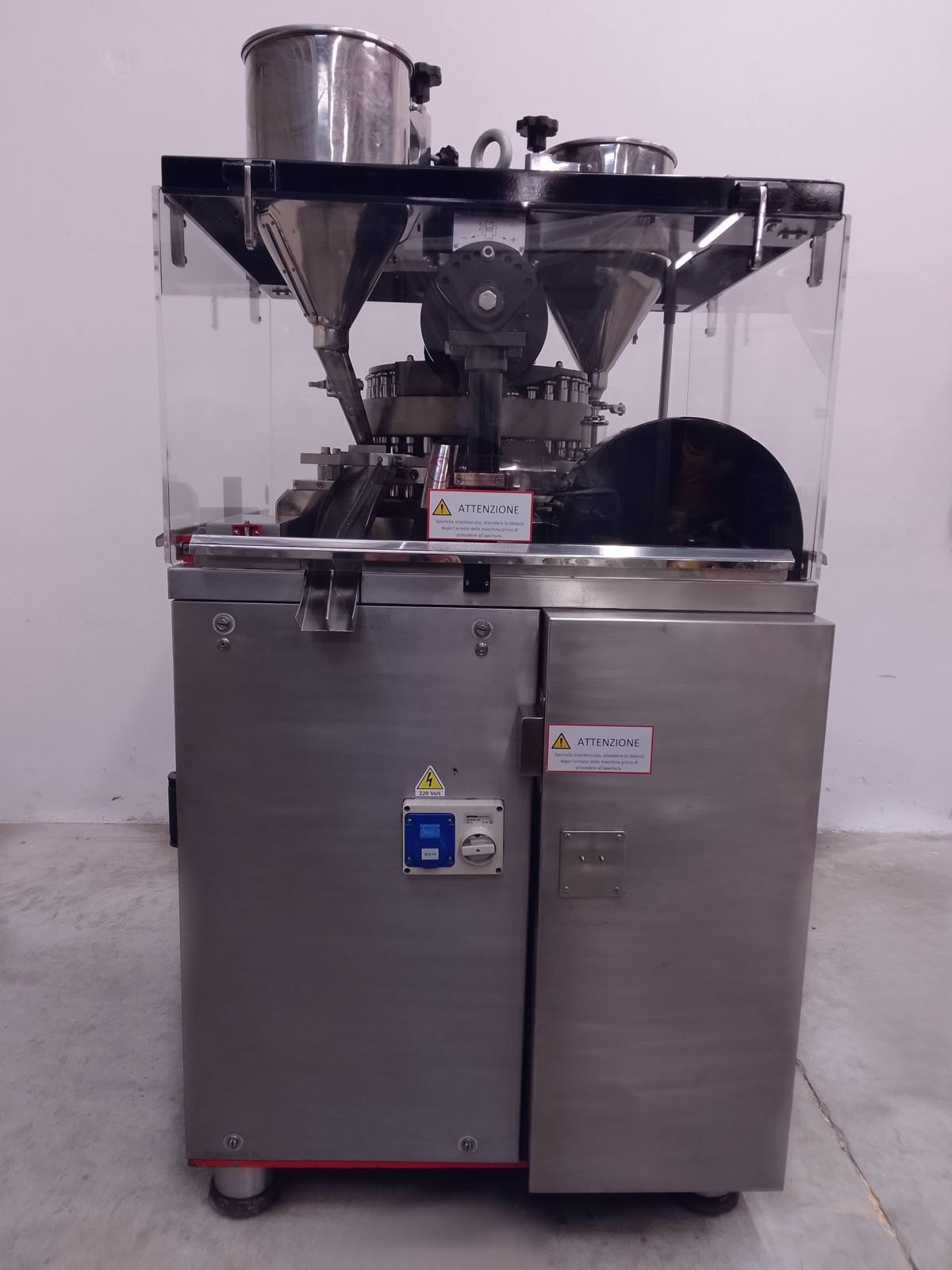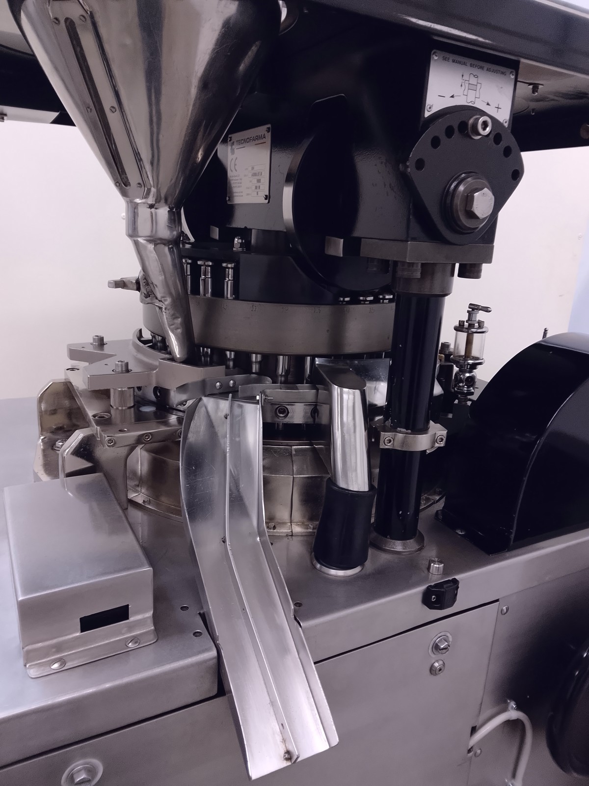The rotary tablet press is made of stainless steel, ensuring durability and resistance. With 35 compression stations, it is ideal for high pressure tablets, suitable for pre-compressed powders and direct compressions. The machine requires minimal maintenance due to centralized lubrication via centrifugal pump. Easy accessibility for format changes is ensured by stainless steel panels and transparent polycarbonate doors. Supplied with punches and dies for round tablets of 14.5 mm diameter.