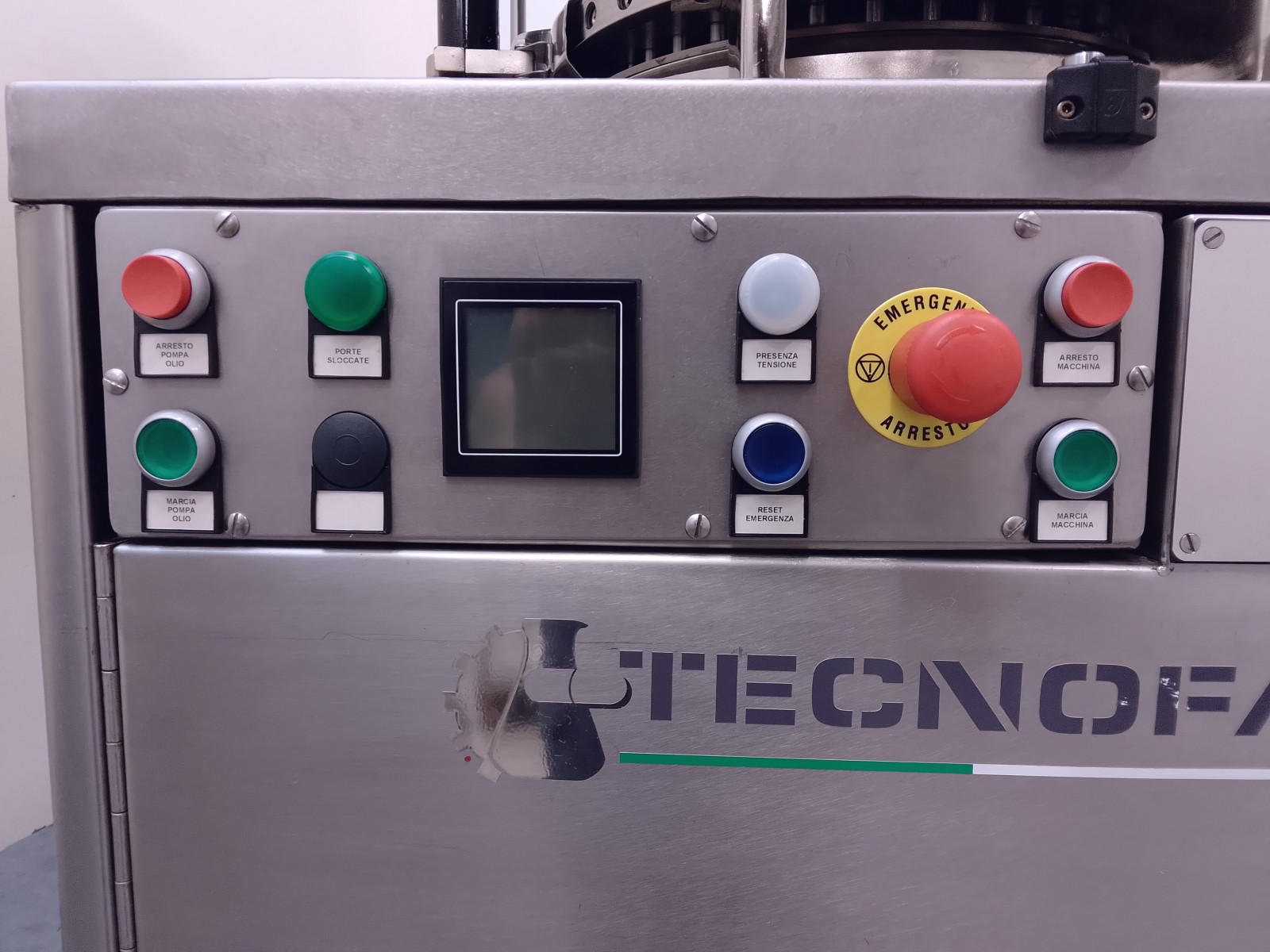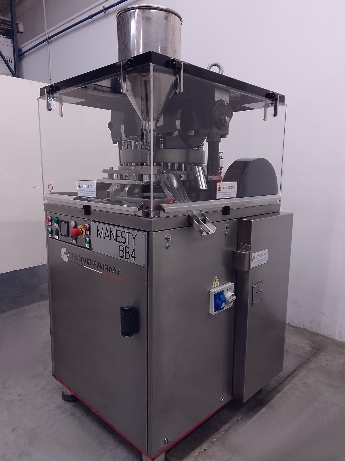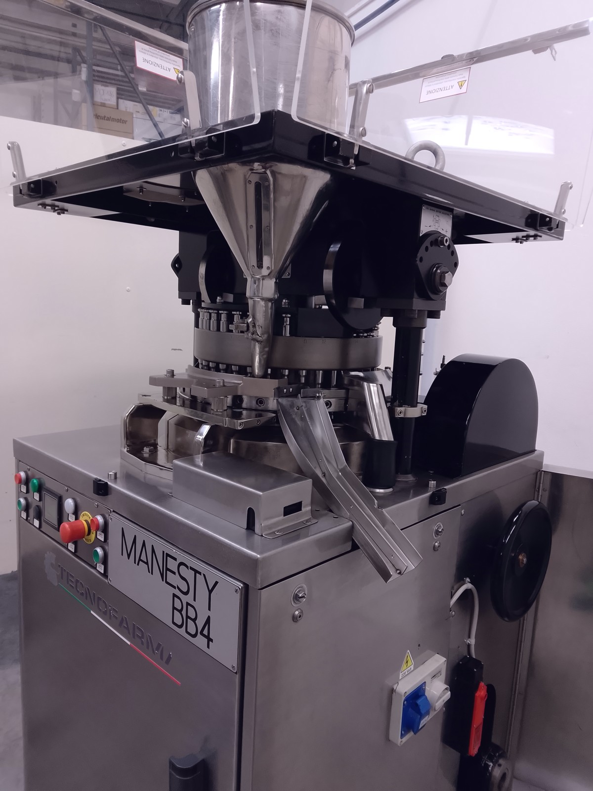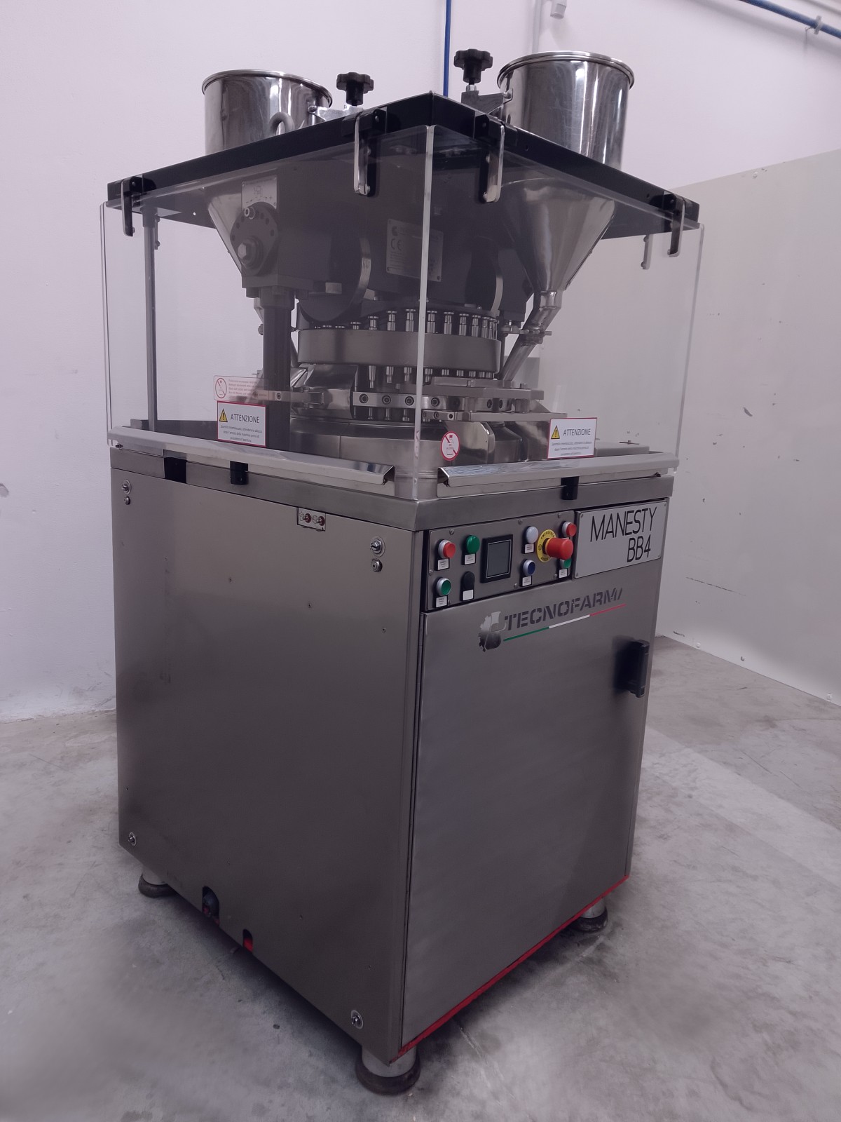 The rotary tablet press is made of stainless steel, ensuring durability and resistance. With 35 compression stations, it is ideal for high pressure tablets, suitable for pre-compressed powders and direct compressions. The machine requires minimal maintenance due to centralized lubrication via centrifugal pump. Easy accessibility for format changes is ensured by stainless steel panels and transparent polycarbonate doors. Supplied with punches and dies for round tablets of 14.5 mm diameter.