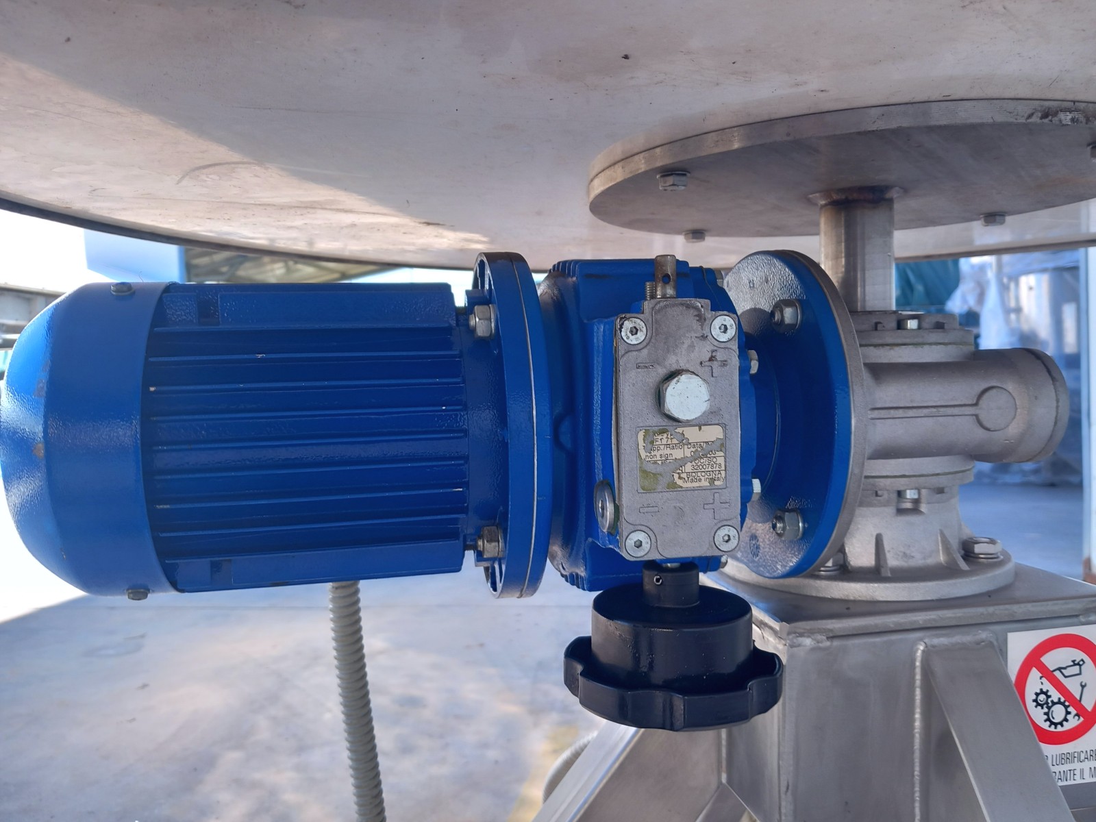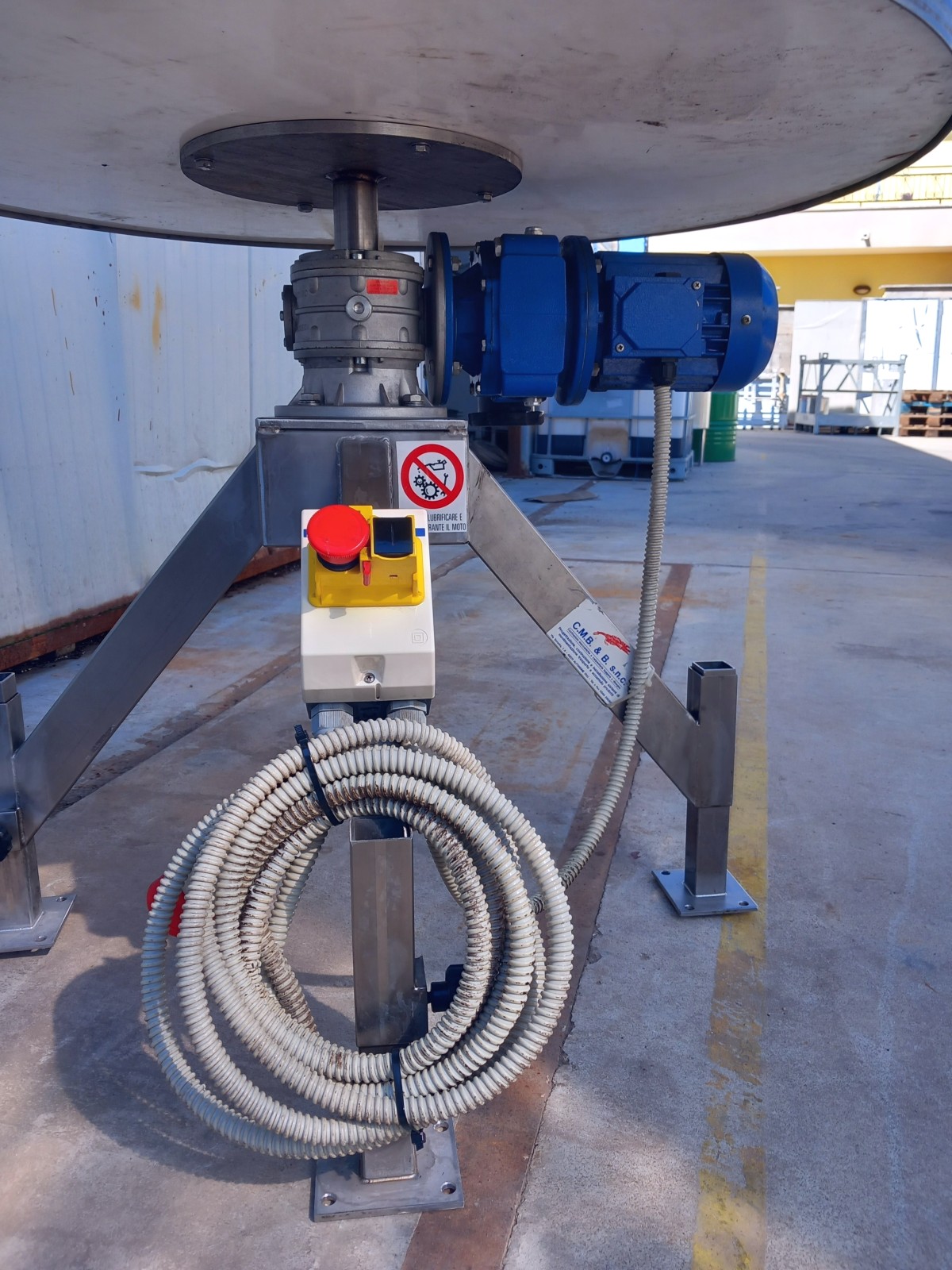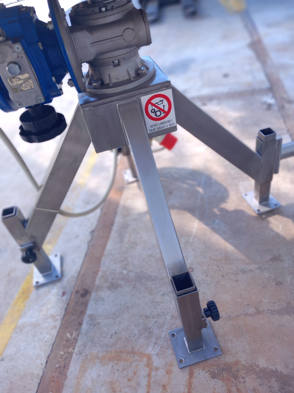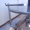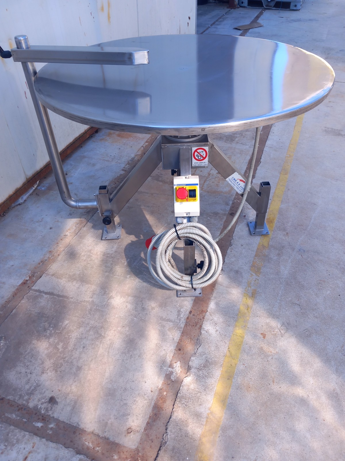 This rotating table is optimized for integration into production lines, characterized by a stainless steel rotating plate and a robust support structure in steel, which is also hygienizable. The drive is provided by an electric gear motor, controlled via a panel with a potentiometer for speed adjustment. It includes an adjustable deflector/guide bar, also made of stainless steel.