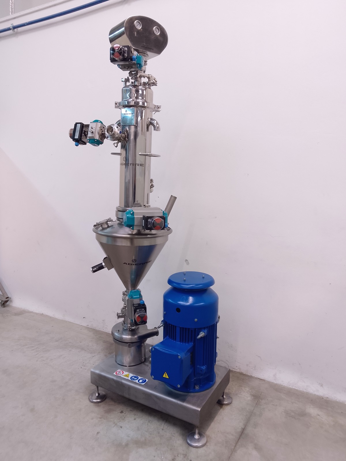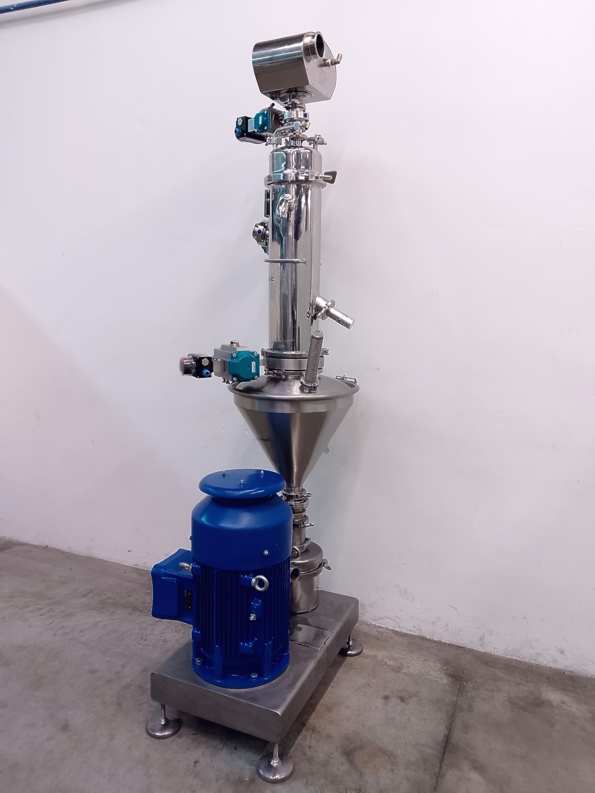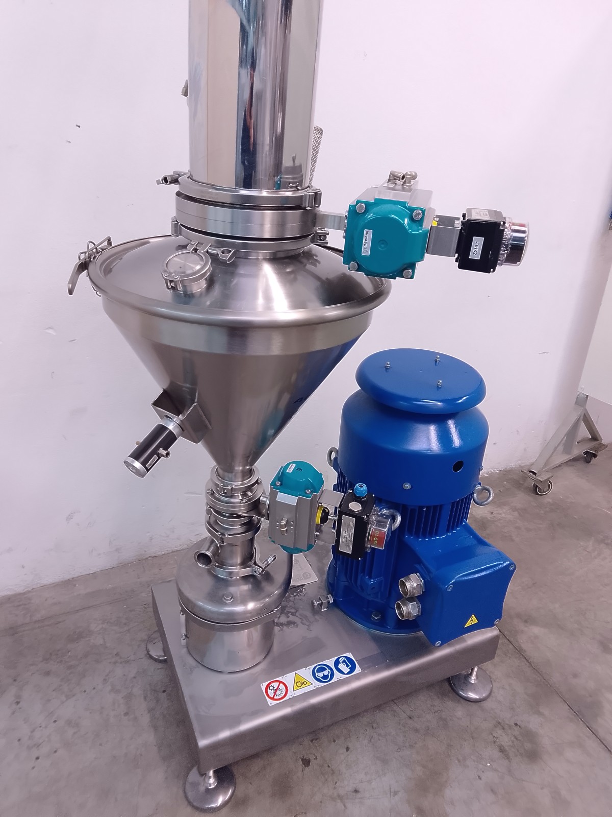 Tri-blender systems are designed to accelerate and enhance the efficiency of mixing powders and liquids while minimizing air introduction during loading procedures. This helps limit time and product waste, significantly reducing issues associated with pre and post-mixing operations, such as lumps, foam, and overflow. The Tri-blender is a compact and easily transportable system, designed for quick installation near the preparation tank, and the height of the hopper facilitates loading without requiring the operator to lift. Powder ingredients are poured into the hopper; the pump creates a vacuum that draws them into the mixing chamber. The liquid is introduced through a tangential inlet and is simultaneously conveyed into the same chamber. The diffuser tube keeps the two ingredients, liquid and powder, separated until they enter the mixing chamber, where a special filter mesh ensures a homogeneous mixture. The Tri-blender is a simple and safe system for quickly and uniformly mixing liquids and powders while avoiding air entry. Powder absorption is rapid and uniform, up to 159 kg/min. Ideal for pharmaceutical preparations such as syrups, as well as for food applications. It is easily adaptable for CIP applications. The Tri-blender is made of AISI 316 stainless steel for parts in contact with the product while the base is made of AISI 304 stainless steel.