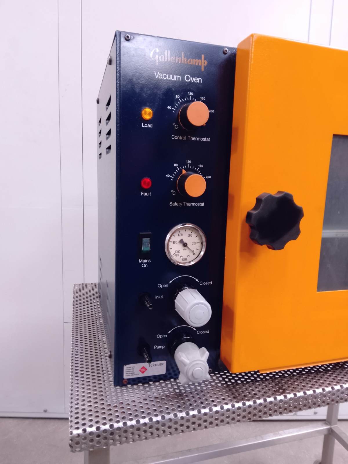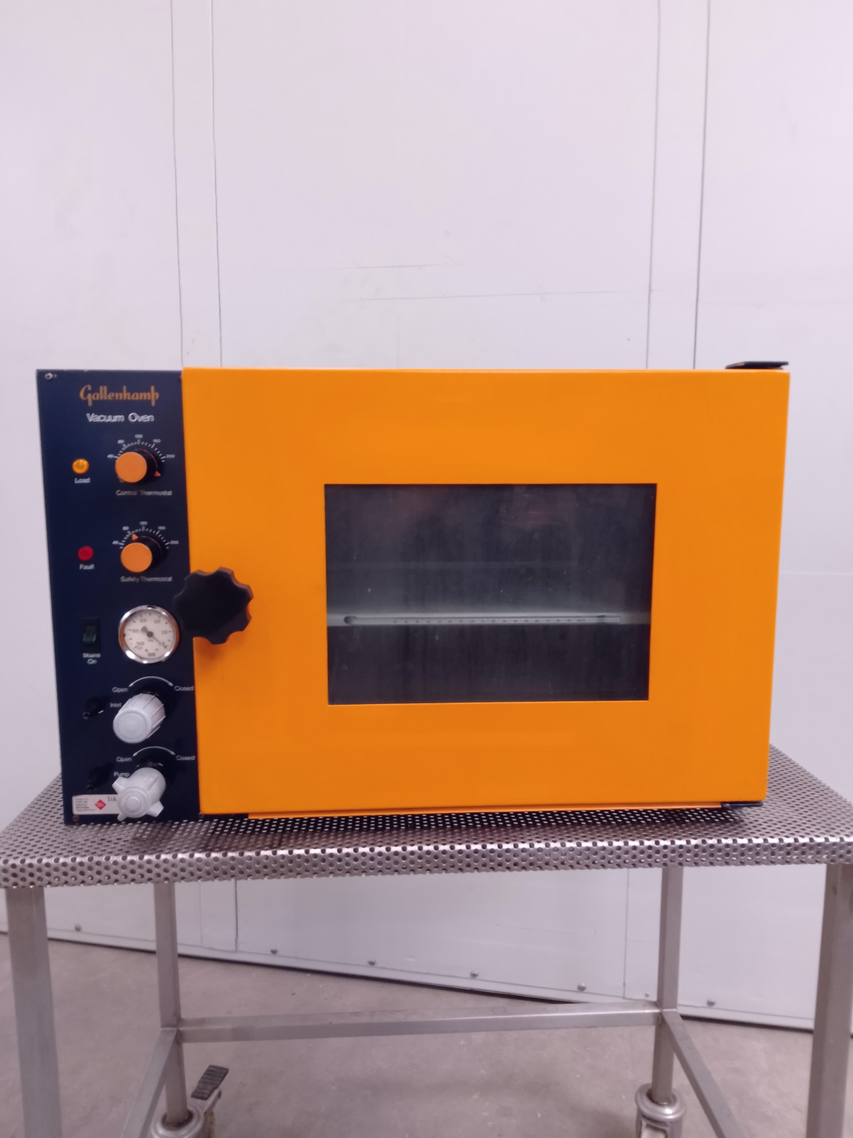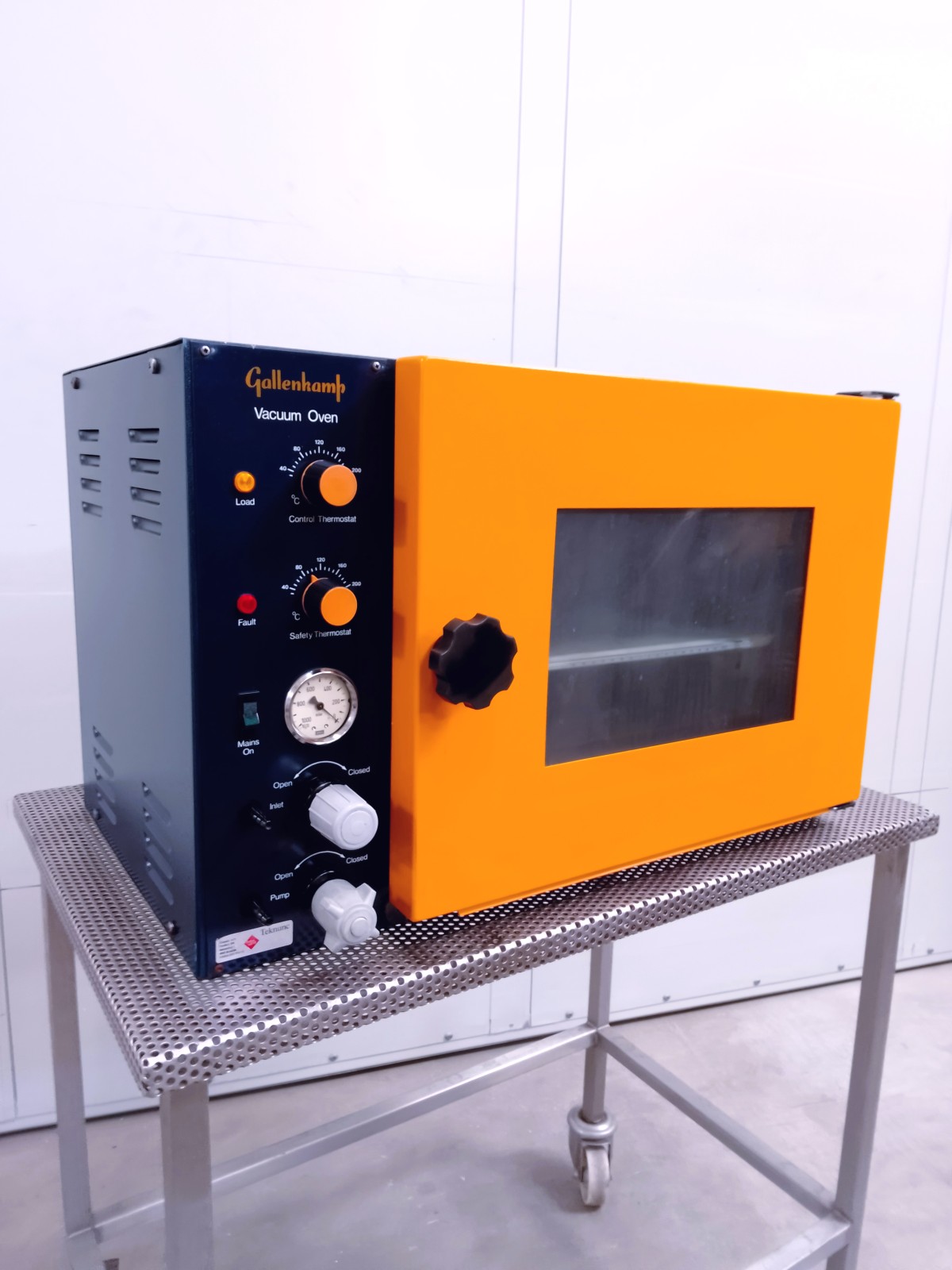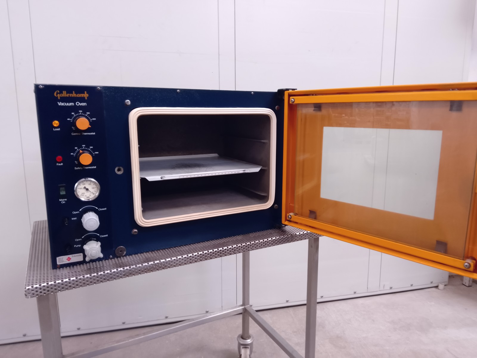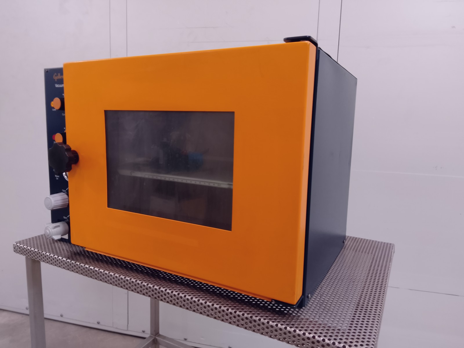 The Gallenkamp Vacuum Oven is a laboratory furnace designed for thermal treatments under reduced pressure conditions. This device is ideal for drying, curing, or processing heat-sensitive materials at lower temperatures compared to a traditional oven, thanks to its ability to remove air and other gases from the working chamber. It features a rectangular chamber and a tempered glass viewing window with safety screen, allowing observation of internal processes. The front panel houses controls for temperature and vacuum, along with a manometer for pressure measurement. This dryer is particularly useful for applications requiring heating in a controlled atmosphere, solvent removal, and drying sensitive samples.