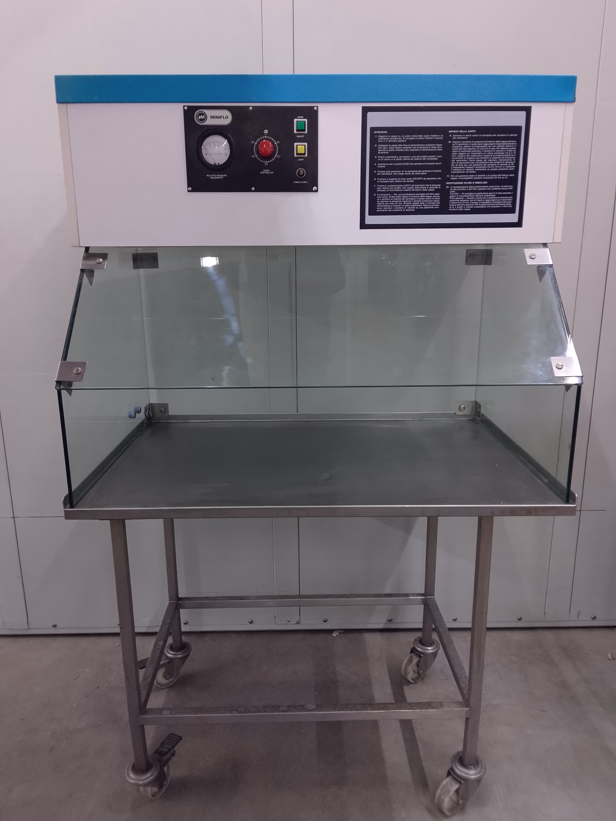 The PBI MINIFLO vertical laminar flow cabinet is designed to ensure a protected working environment through filtered unidirectional vertical airflow. Its structure features a painted upper panel, transparent glass side and front walls, and a stainless steel work surface. The ventilation system guarantees a uniform air distribution over the working surface, reducing the risk of contamination of the handled product. The front control panel integrates a relative pressure manometer, a fan speed regulator, a main switch, lighting control, and protection through a fuse.